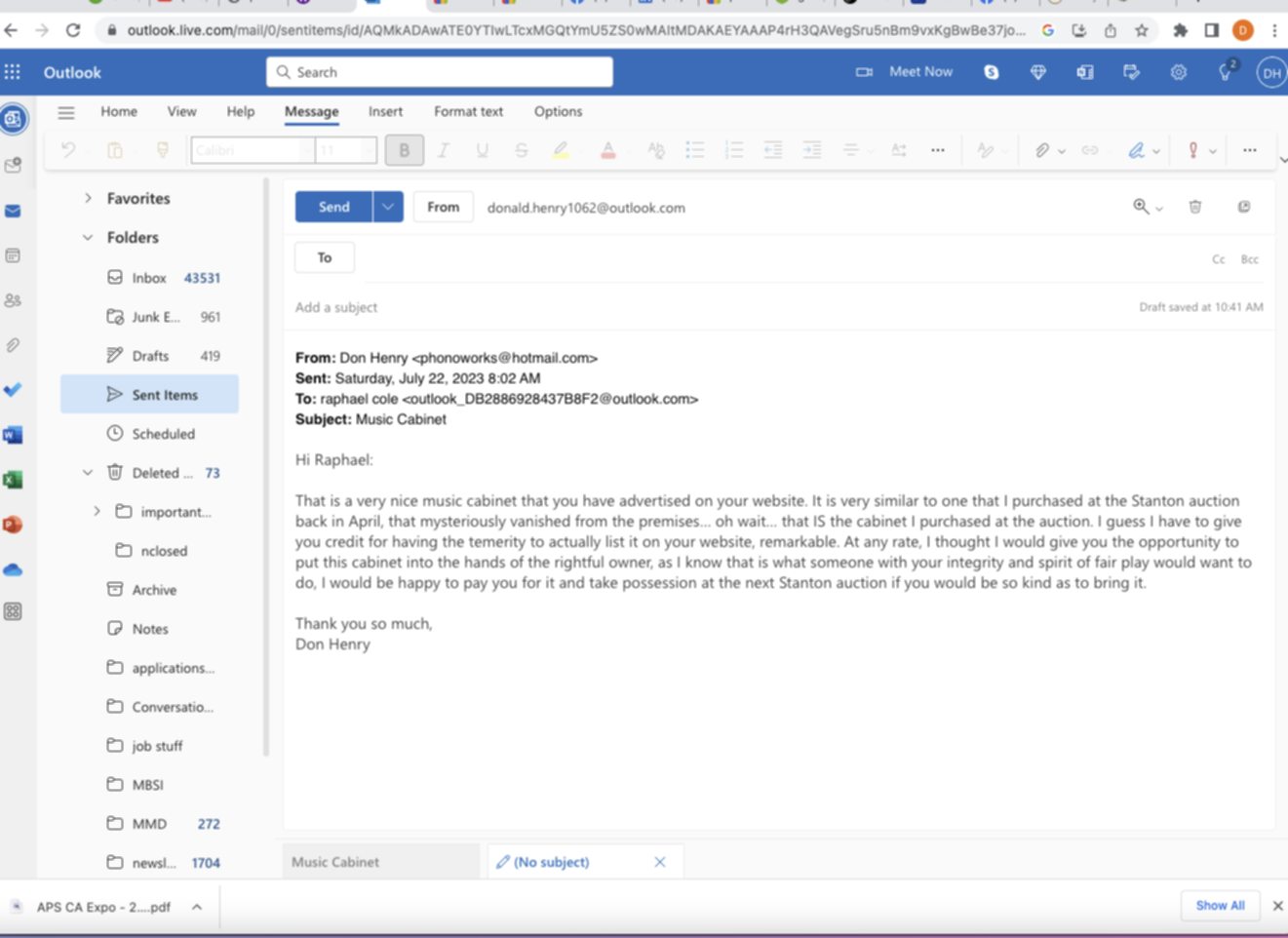He claims that I never sent him an email. I DID send an email on Saturday, July 22 at 8:02AM, stating that I had found my cabinet on his website, even giving him the opportunity to return the cabinet at the next Stanton auction, where I could pay him for it and assume possession. Please see attachment of email sent. To be clear, there was NO response to this email whatsoever.