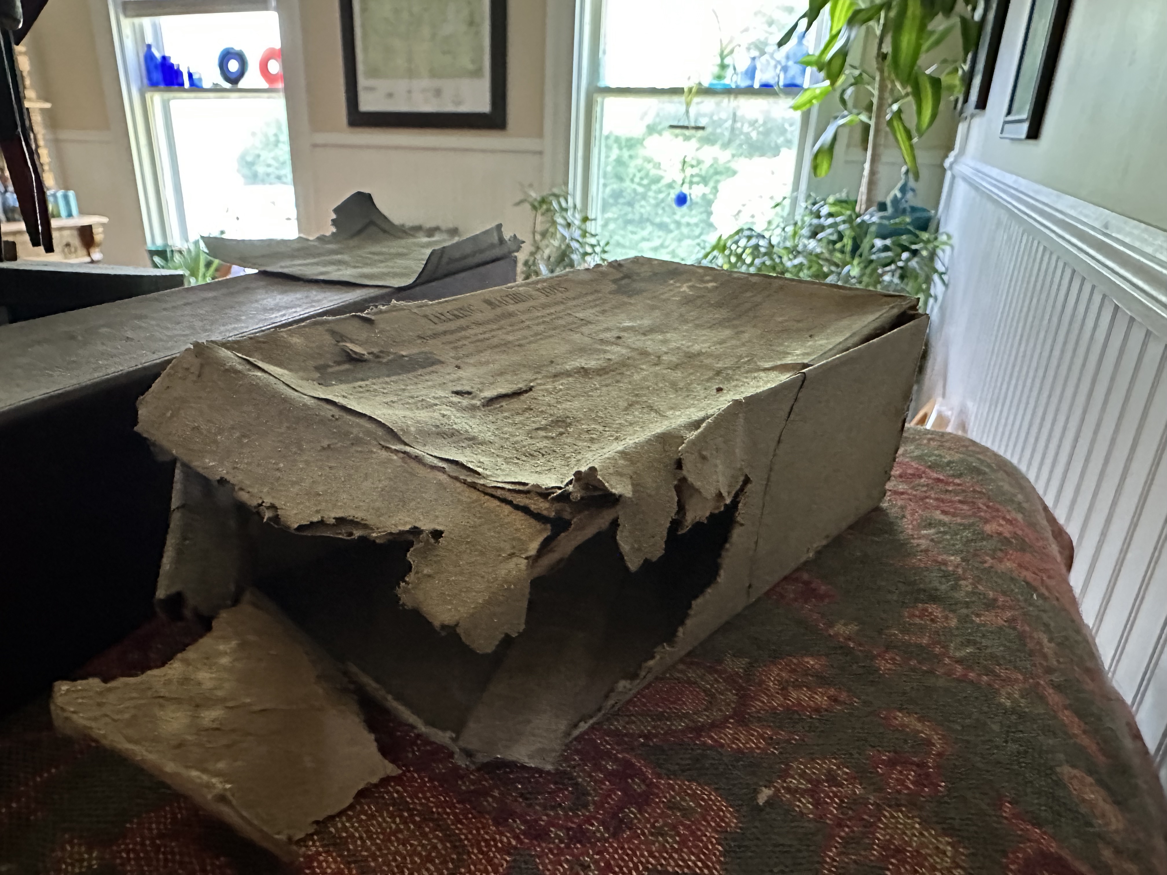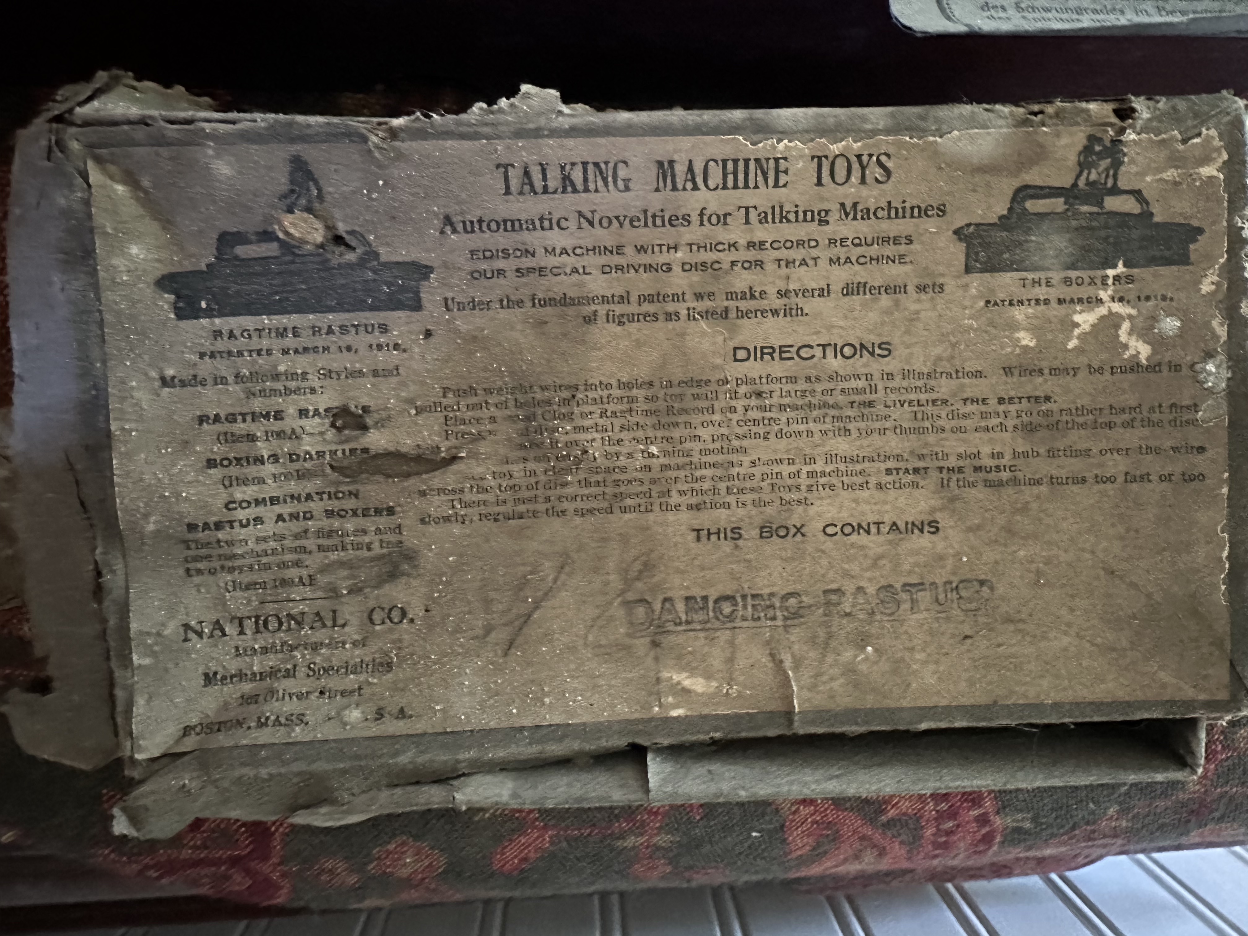 Well folks here it is, going on recommendations from members I'll offer up this original Rastus, as found, with his ratty as found box as well. If you followed my post viewtopic.php?f=2&t=54562 you'll see that as I uncovered a machine, I uncovered more parts of Rastus. I was going to go through the process of fixing this little guy up but found that he just sat on top of one of the Victrolas for way too long and I have way too many projects, I just won't get to him. Every part is original, the only missing part is one foot which I imagine for all the crafty woodworkers out there is pairly simple to reproduce.