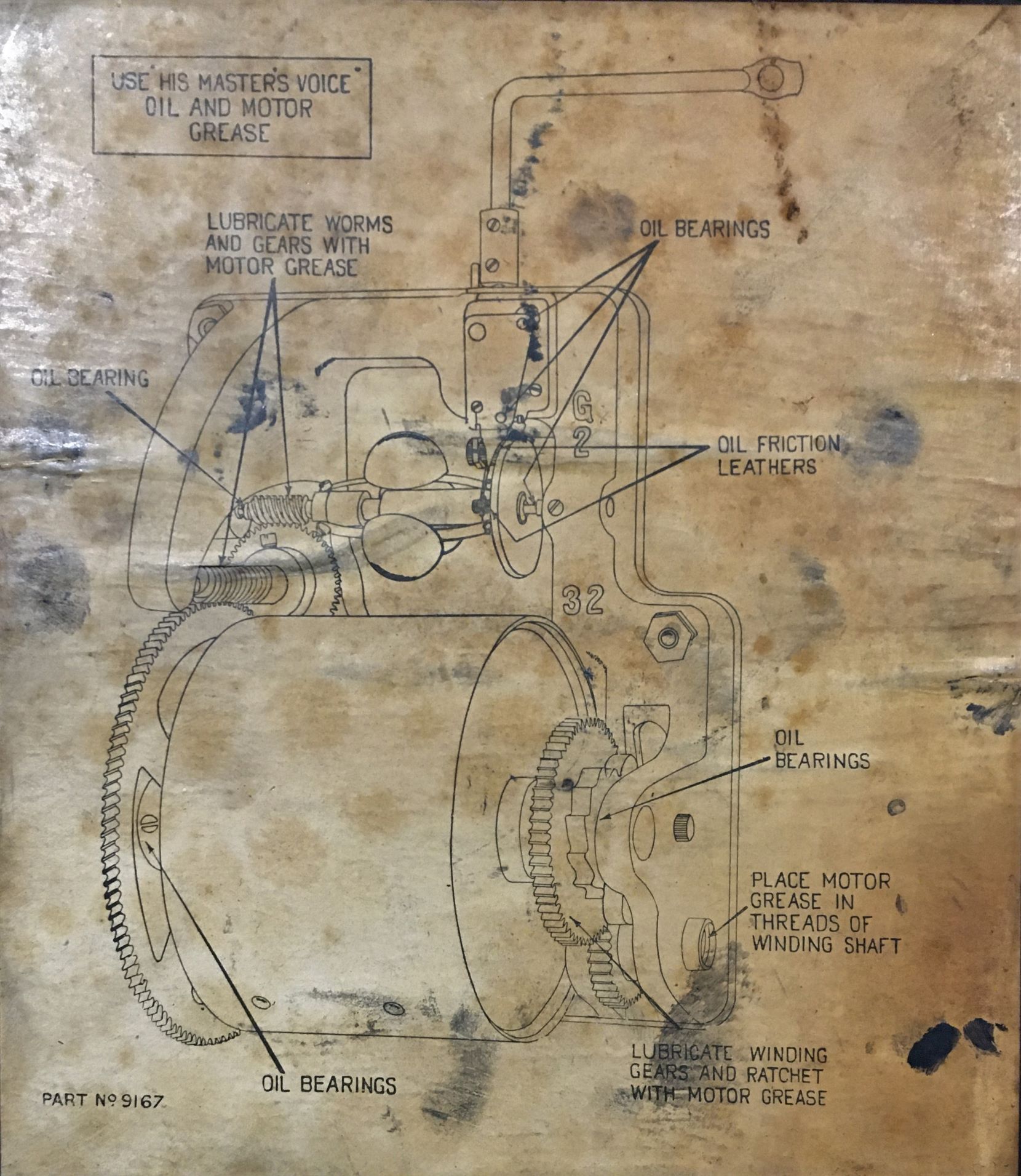 I know this isn't EXACTLY what you wanted, but it should suffice until you can find the HMV motor sheet you you asked for. This is from a Victrola XI instruction manual. The motor is basically the same. Its parts are interchangeable with the 32 motor.