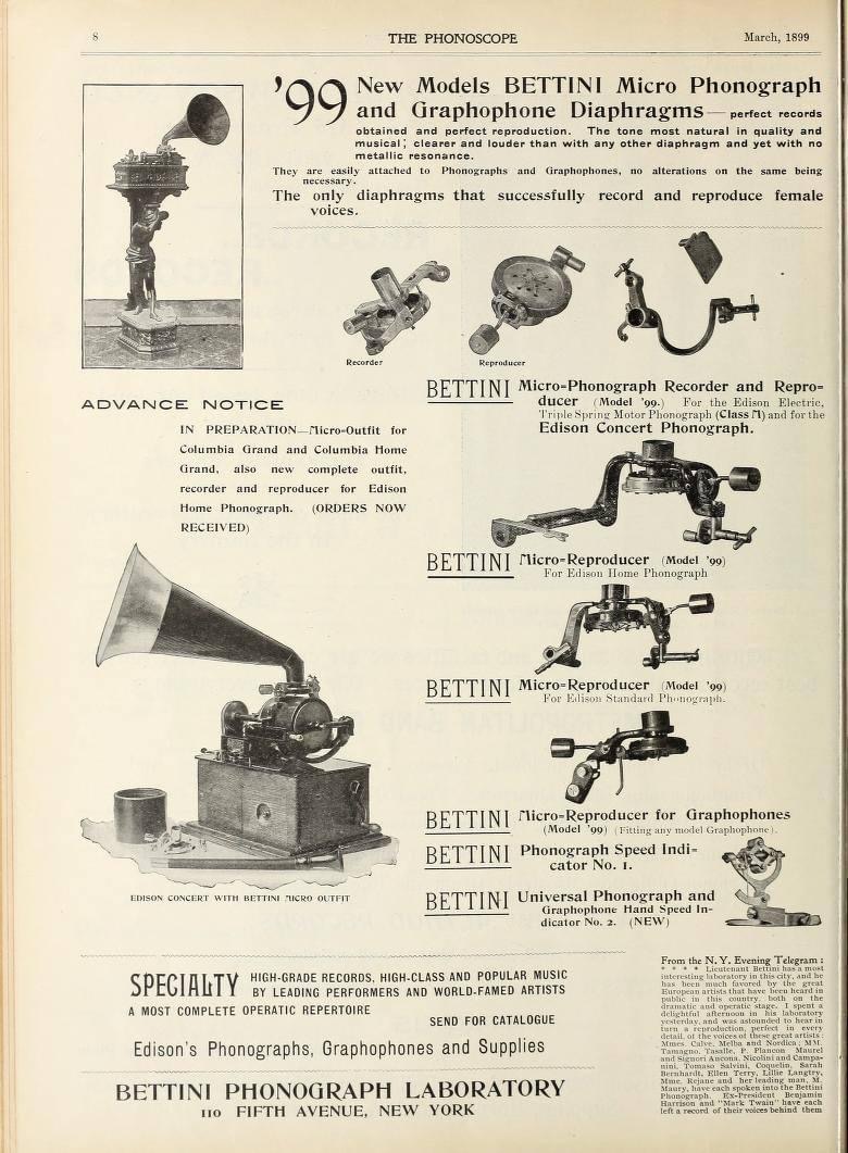 This is one of the rarest Bettini offerings... A Bettini Micro-Phonograph Model 99 attachment on an Edison Square Lid Standard with Original Horn. See the copy of advert for this attachment.