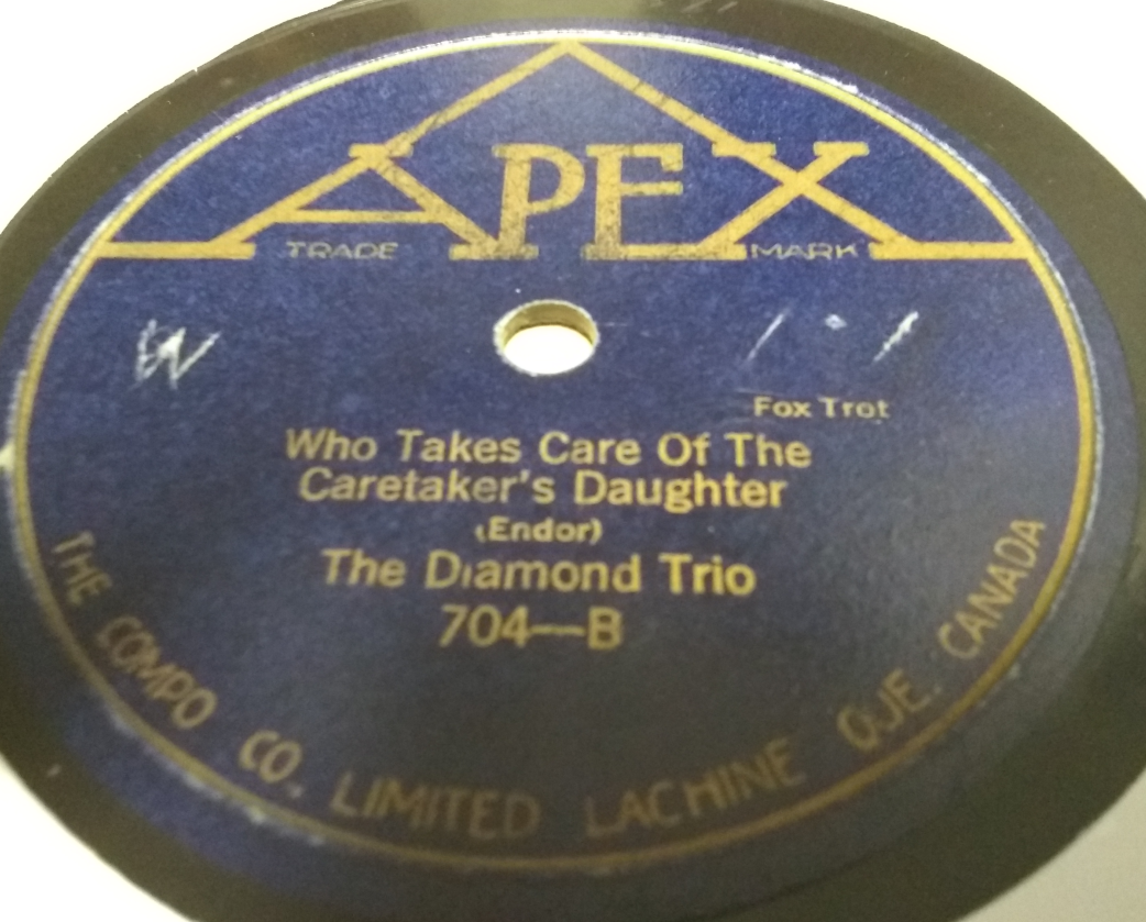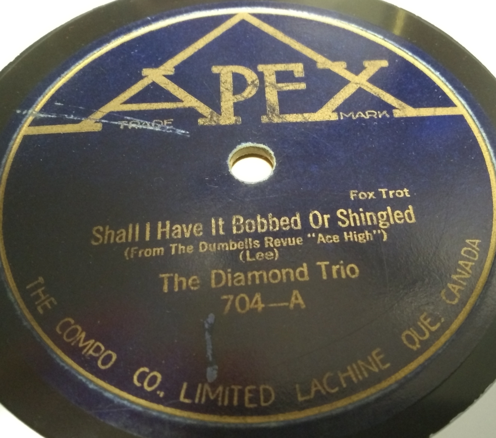 Apex Records was a Canadian record label owned by the Compo Company which lasted as late as 1980.There is a Youtube video that suggests that the recording of Shall I Have It Bobbed or Shingled dates to 1924 and that The Diamond Trio were a Montreal dance band from the 1920s that also recorded on the New York Domino label as The Three Dominoes.