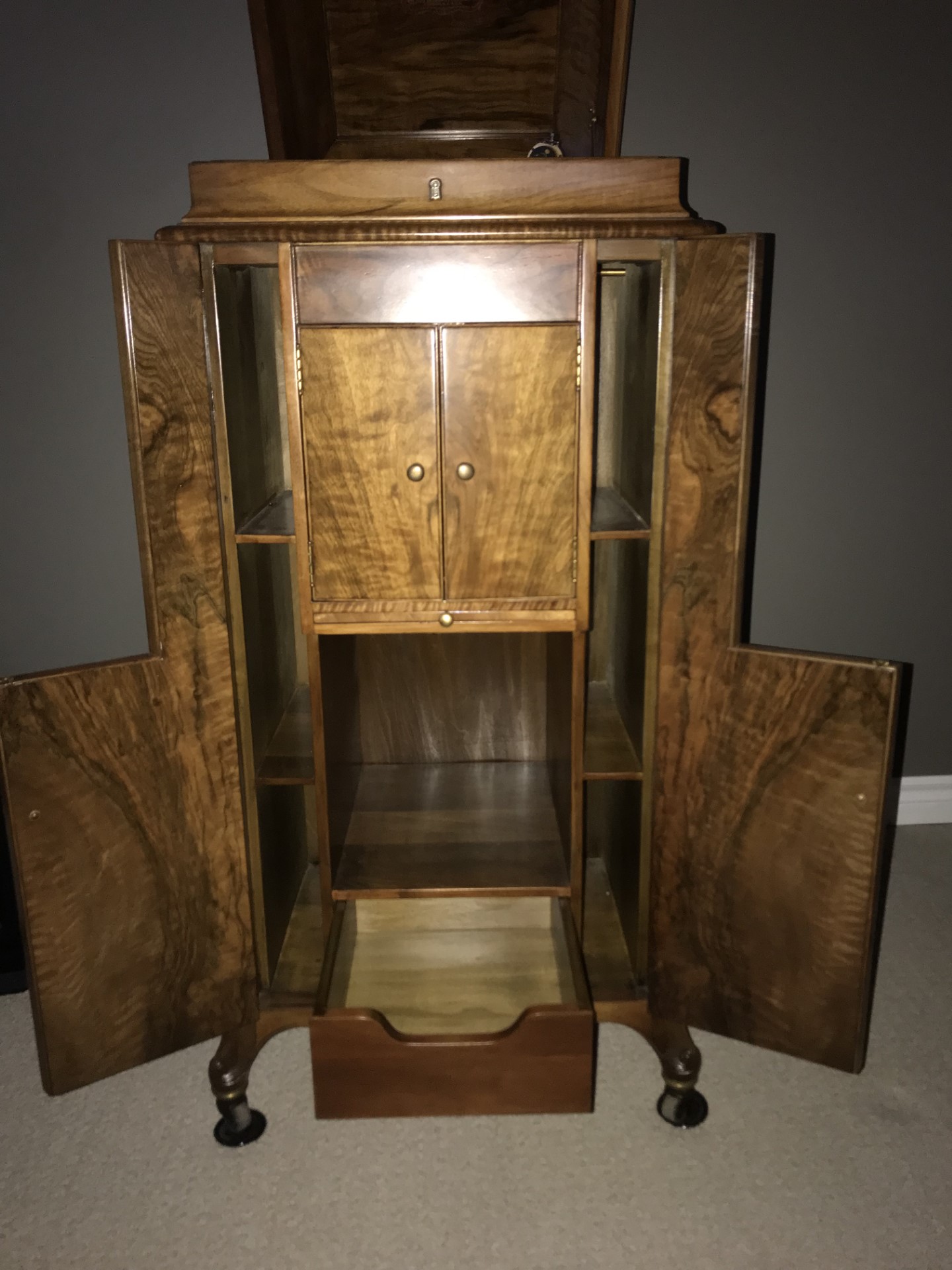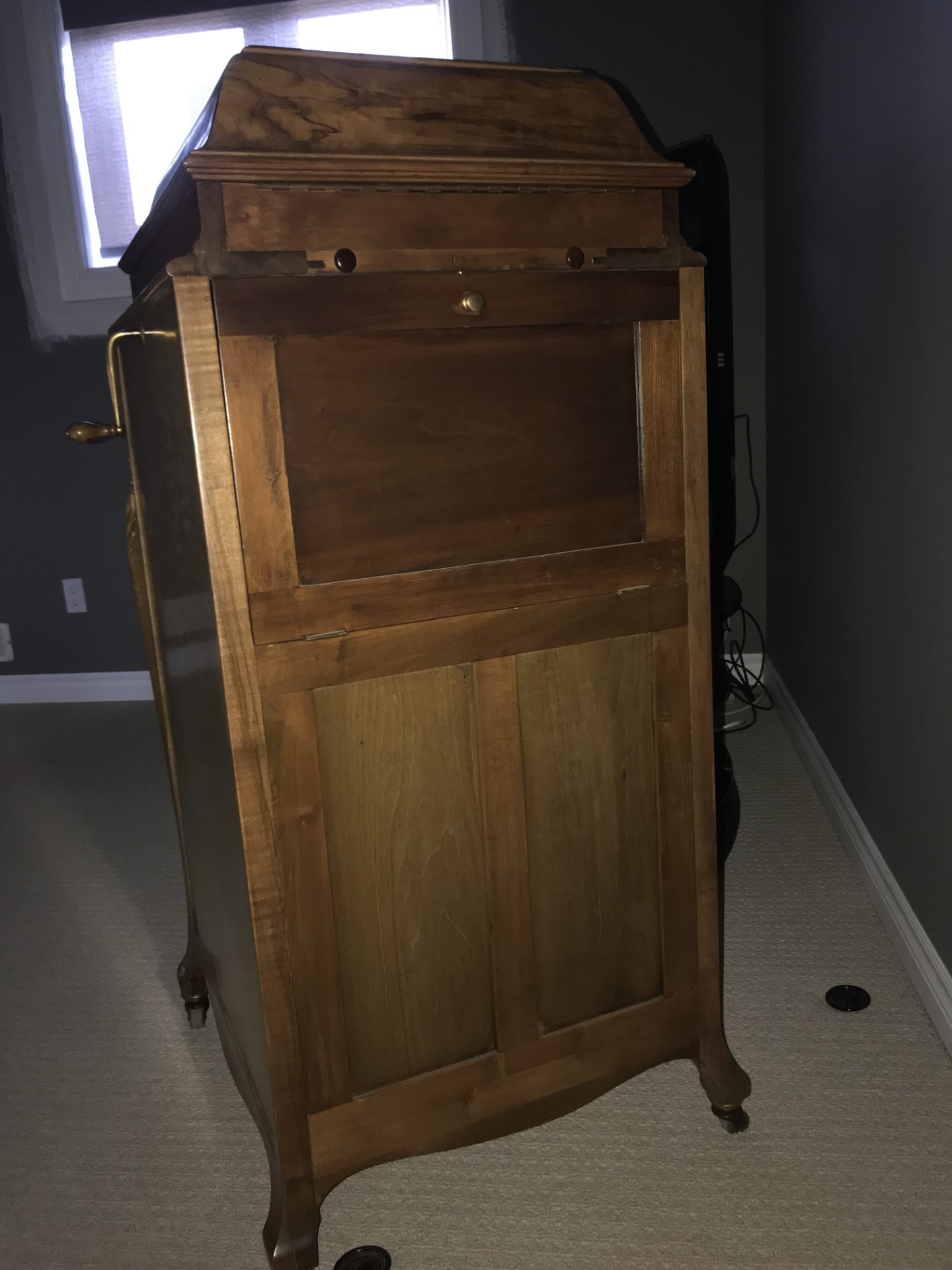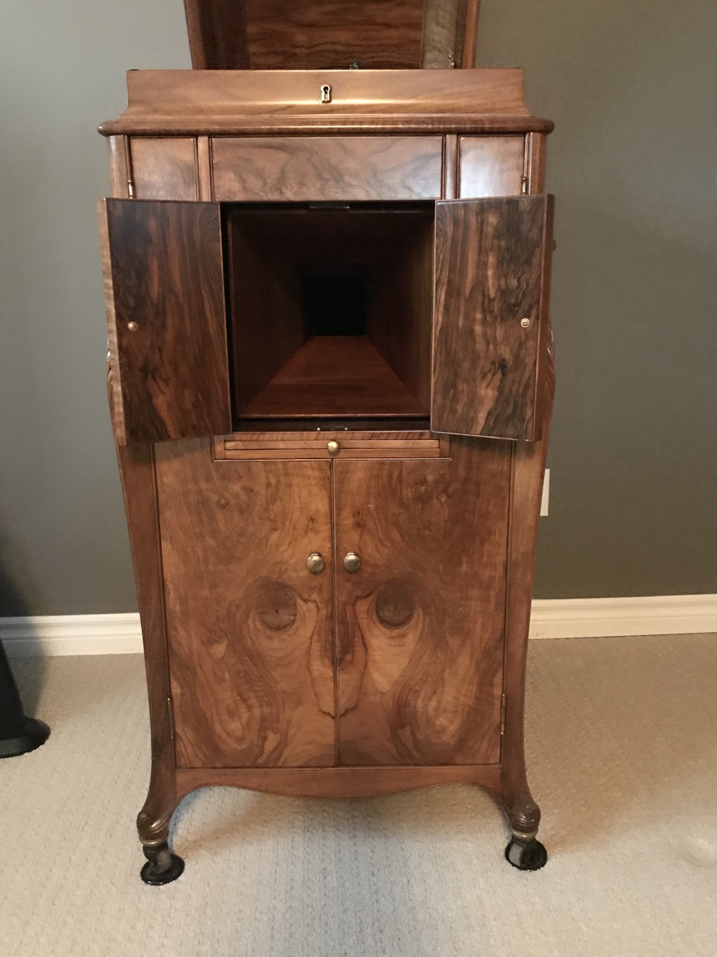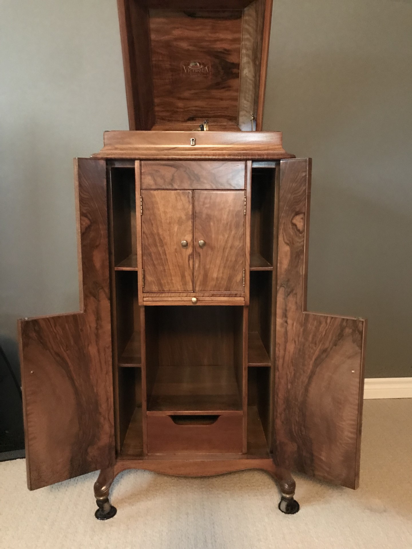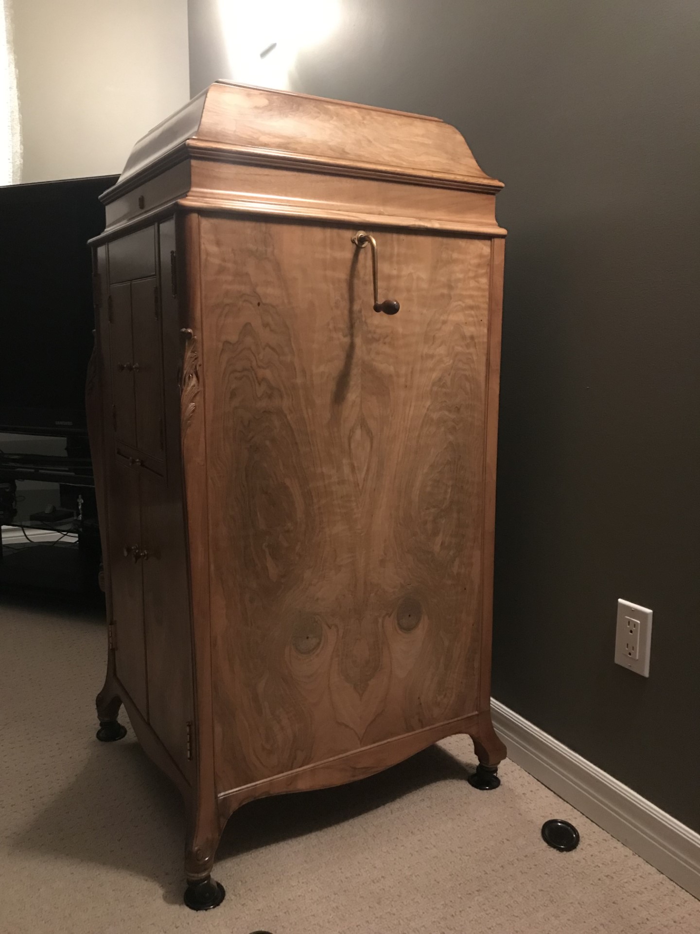 This Victor Victrola XVI was refurbished some time before I bought it. It's a good job but it does have a shine to the surface. Everything works well and the motor easily plays several records on a single wind with no noise.