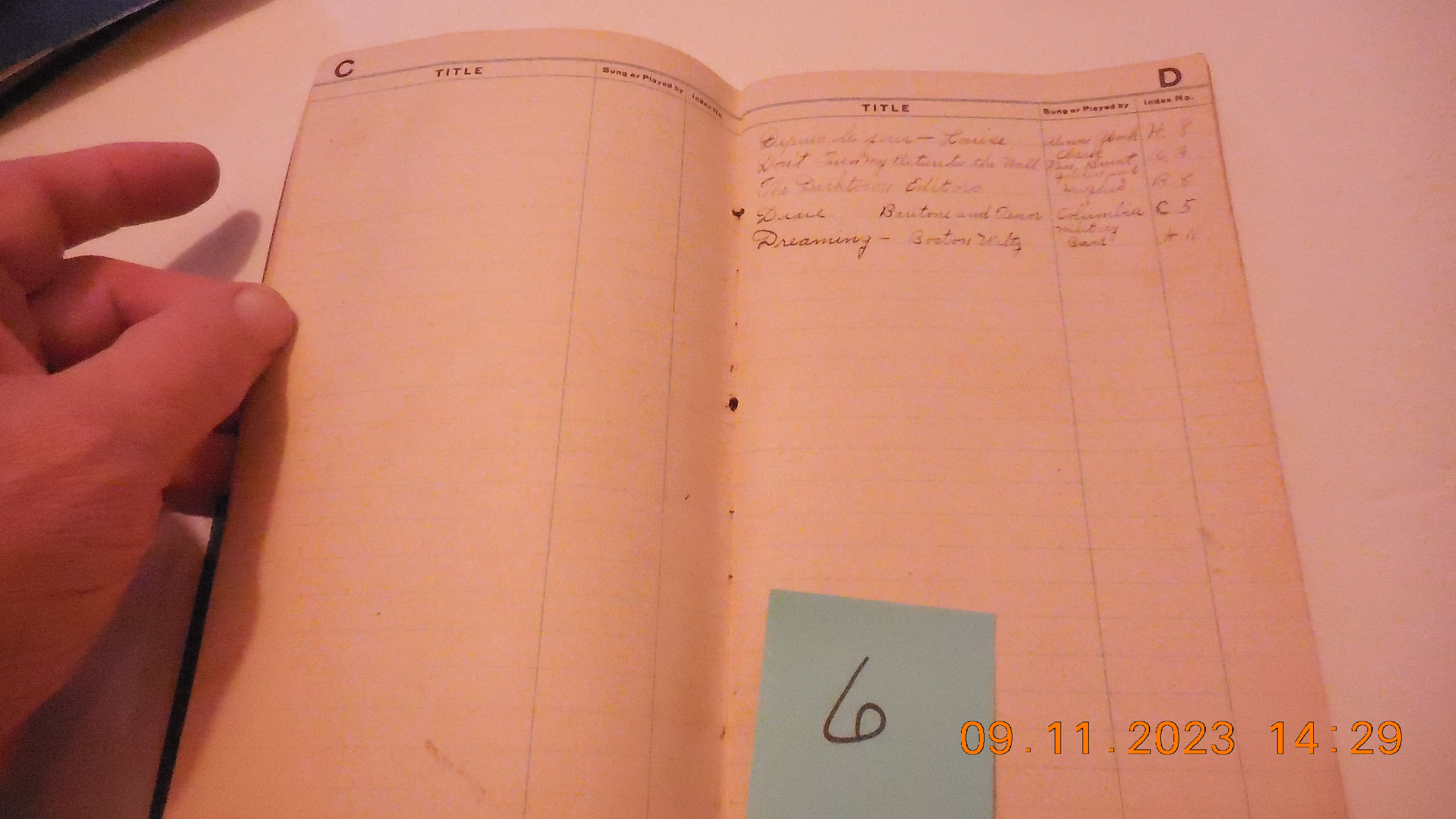 #6 -- Index of Victor Records-- several pages have neatly written entries-- most pages are blank- tape on the inside of spline