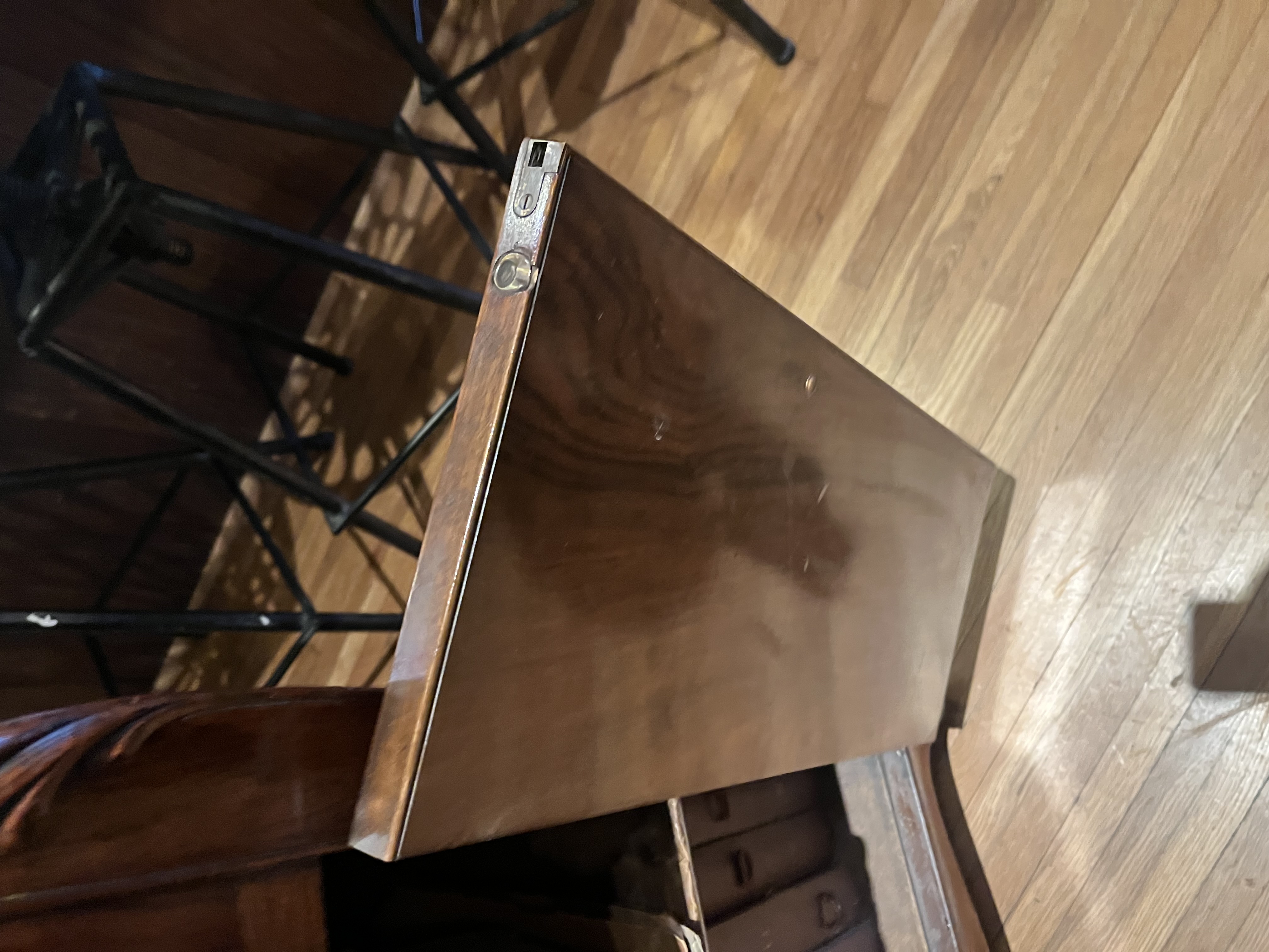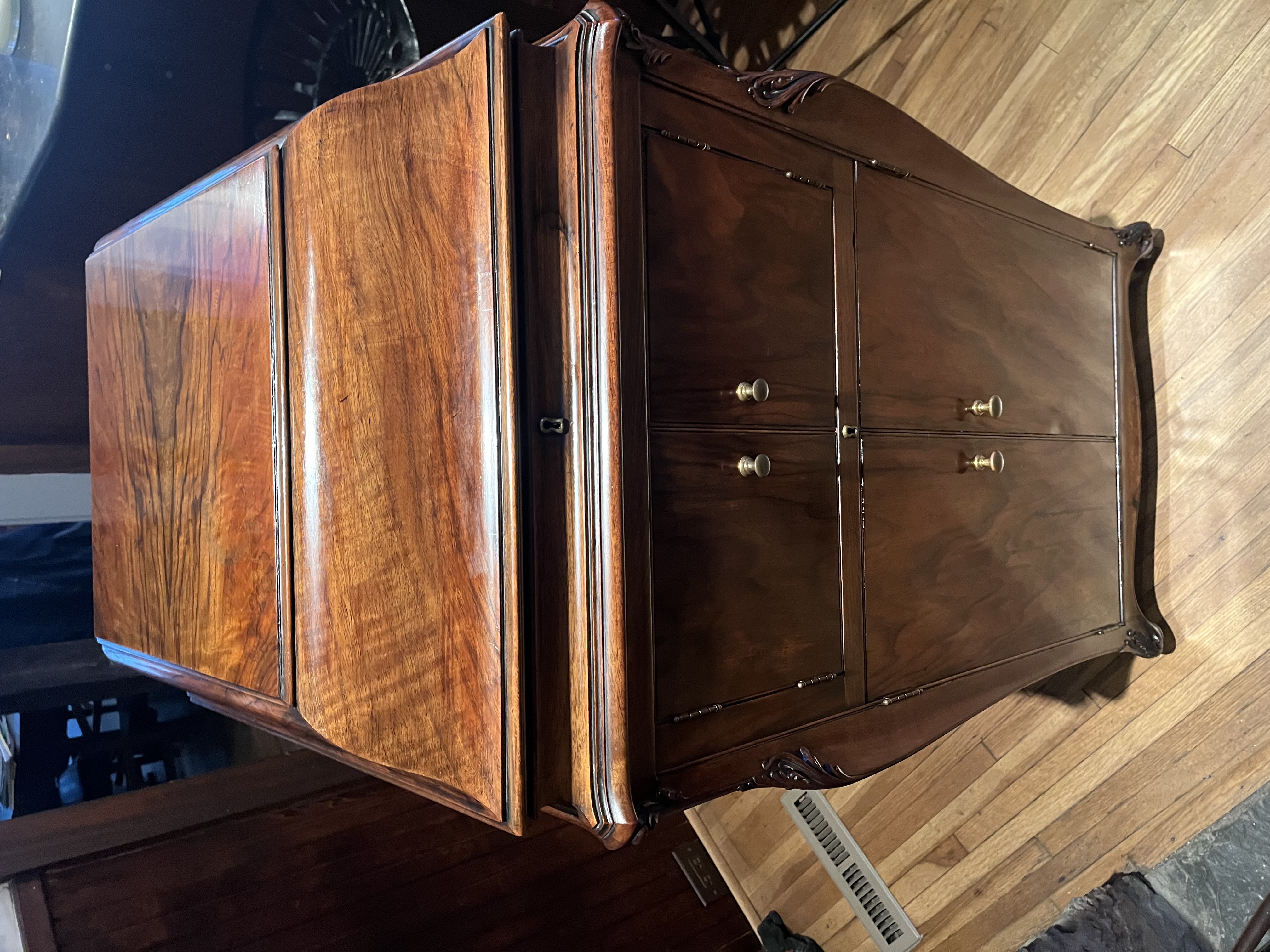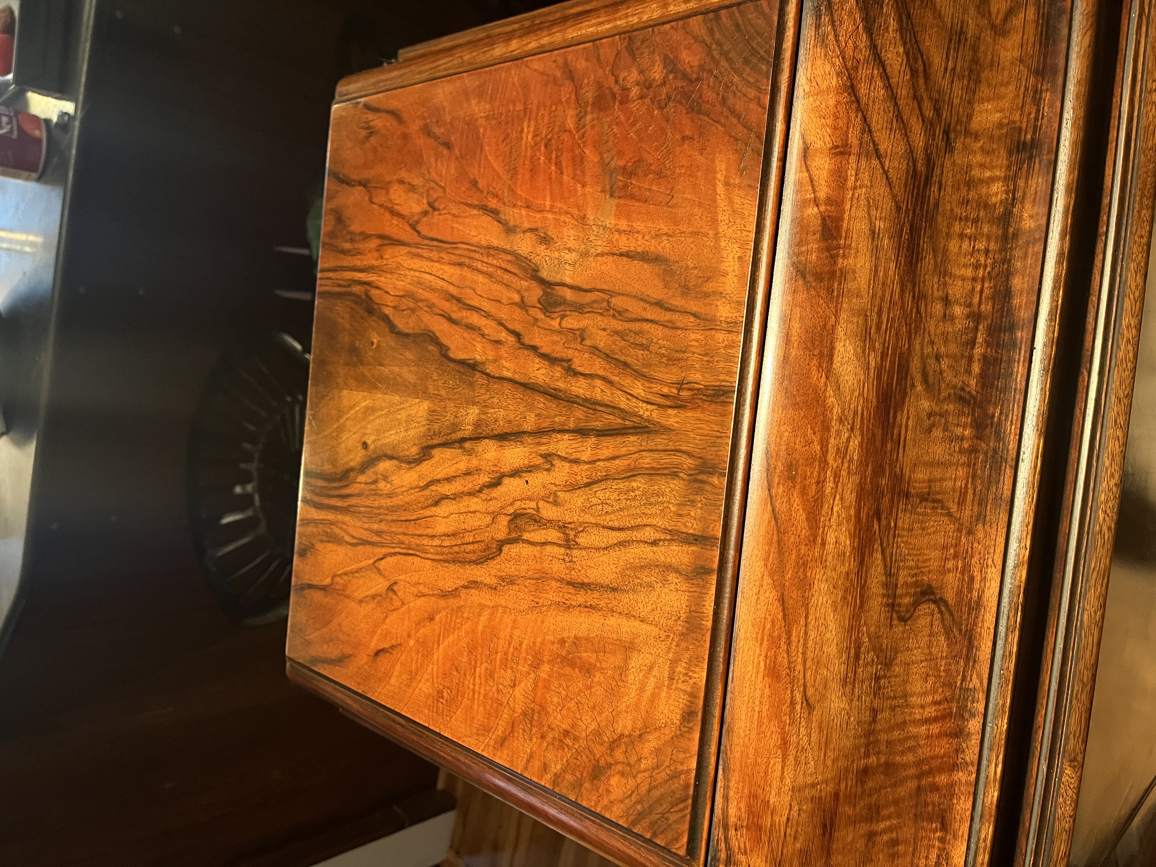 It sports high order book- matched select Veneer, inside & out with ever panel & door receiving the treatment. Very slight veneer lifting on right door, hard to notice.