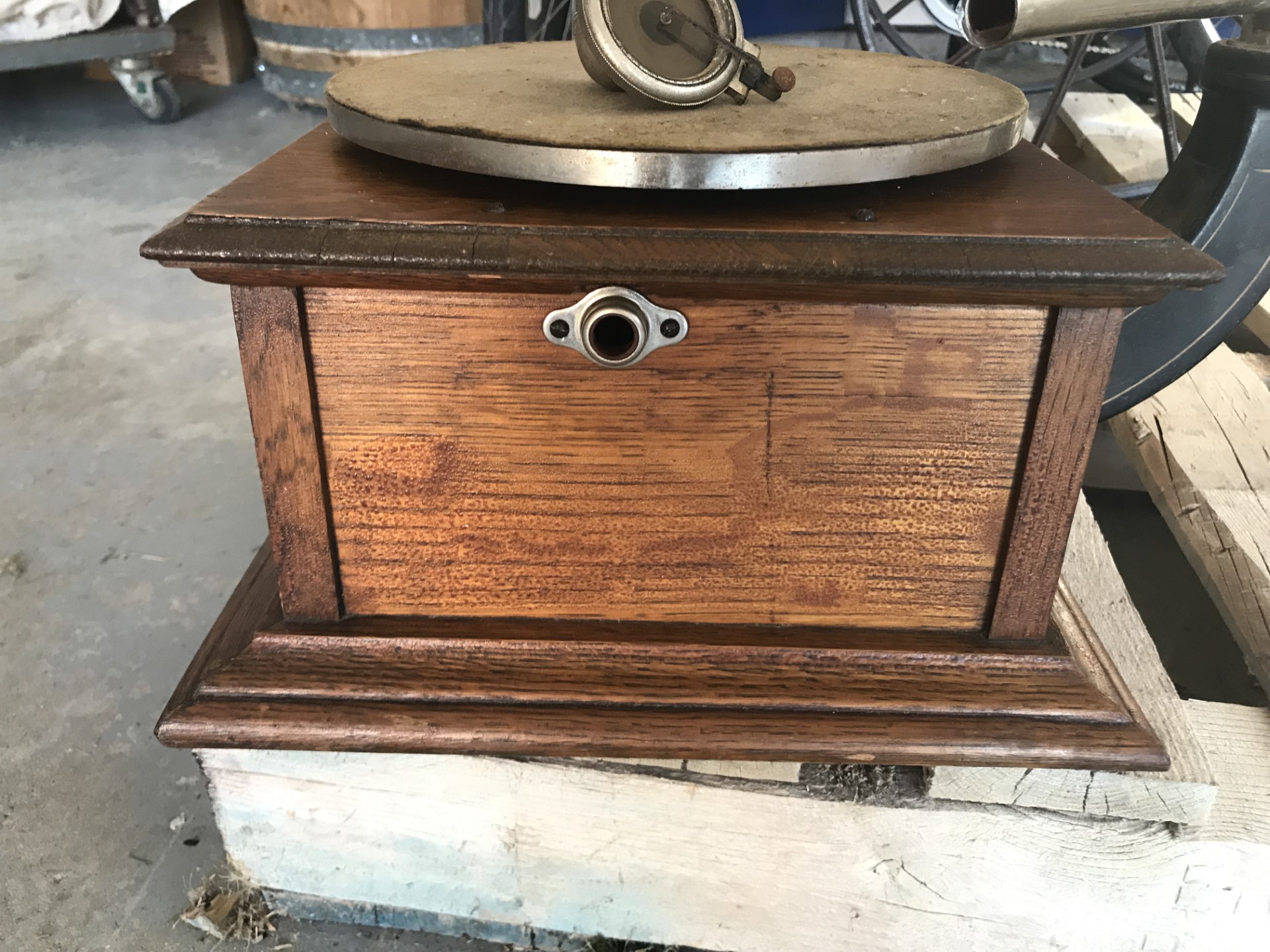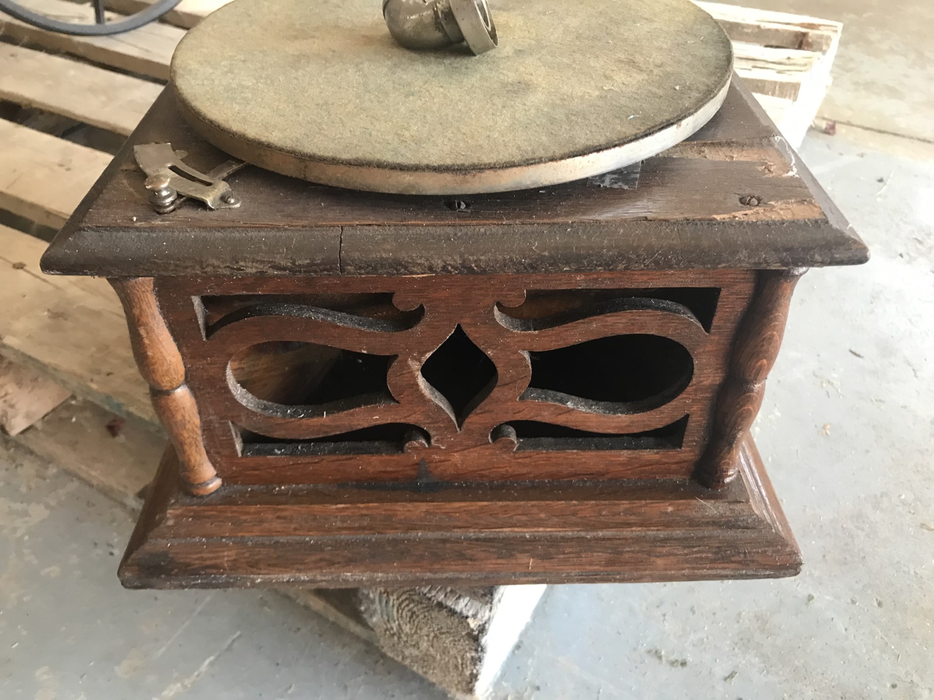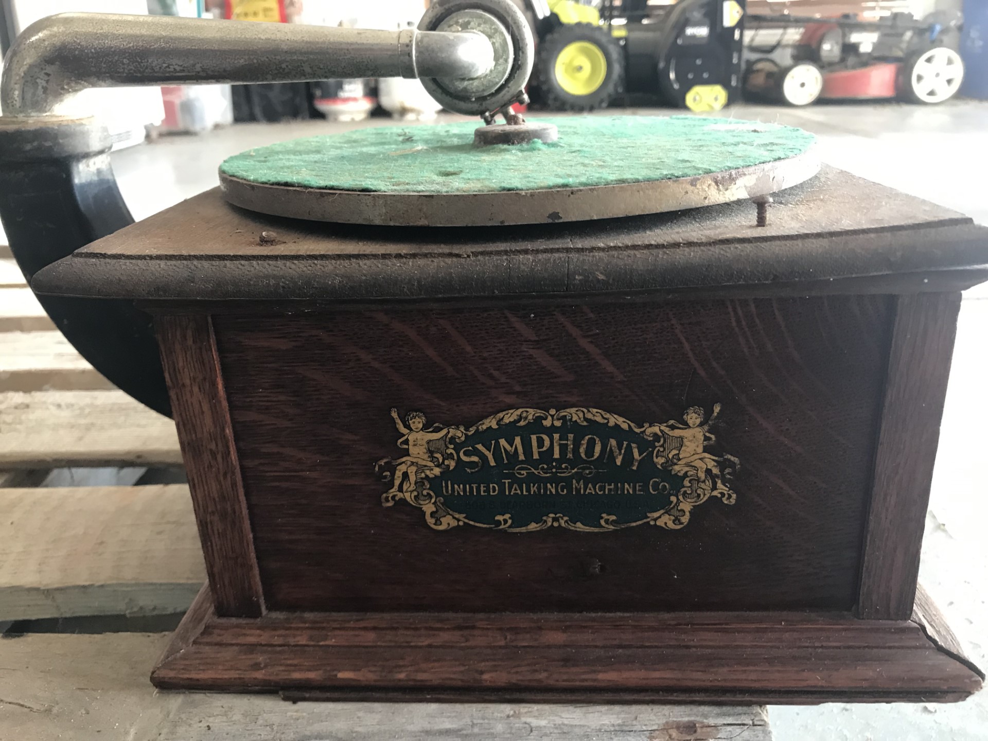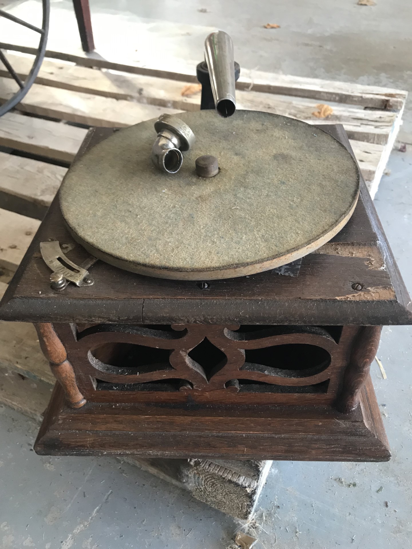 #2 "Symphony" (I think. No decal) - This cabinet is rough with chipped and missing veneer on the top board. Motor cranks but will slip and unwind after a few cranks. No reproducer or crank. Possible wrong platter as it's fit seems off.