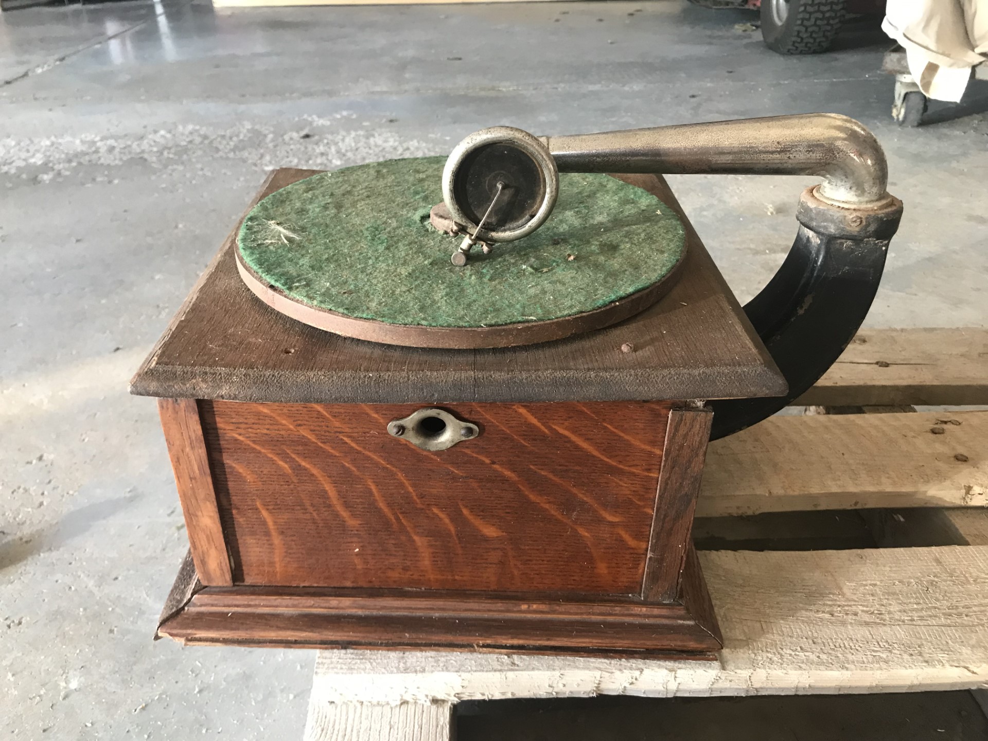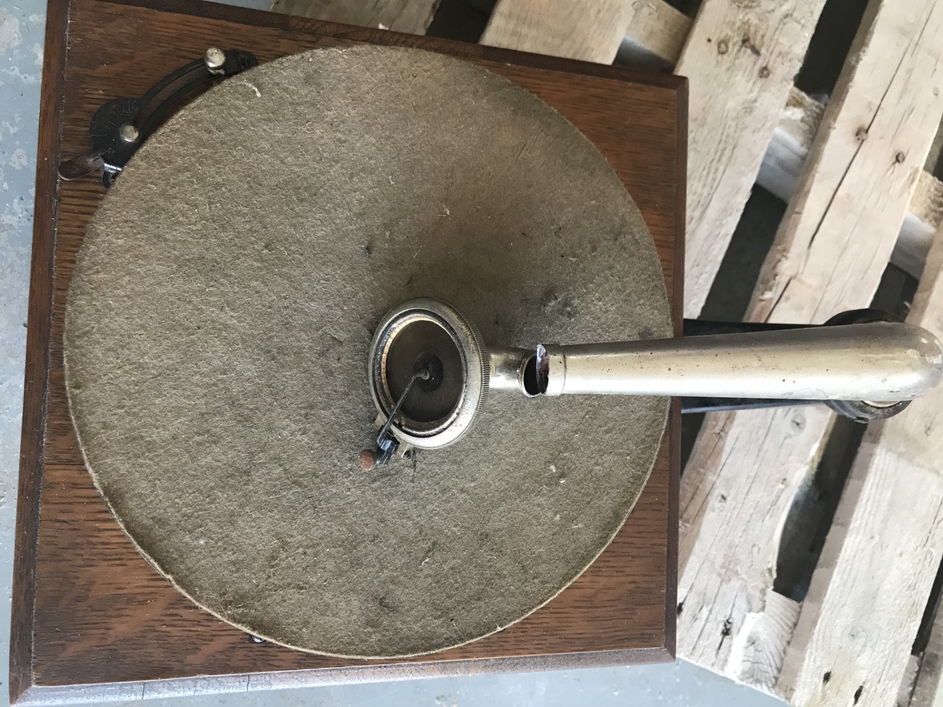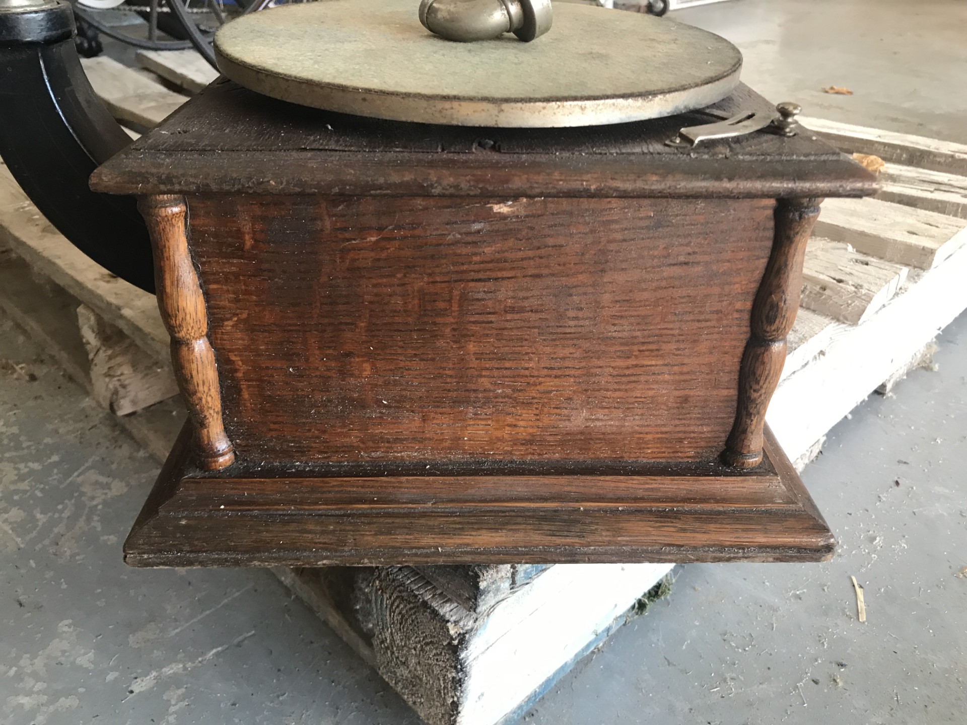 #2 "Symphony" (I think. No decal) - This cabinet is rough with chipped and missing veneer on the top board. Motor cranks but will slip and unwind after a few cranks. No reproducer or crank. Possible wrong platter as it's fit seems off.