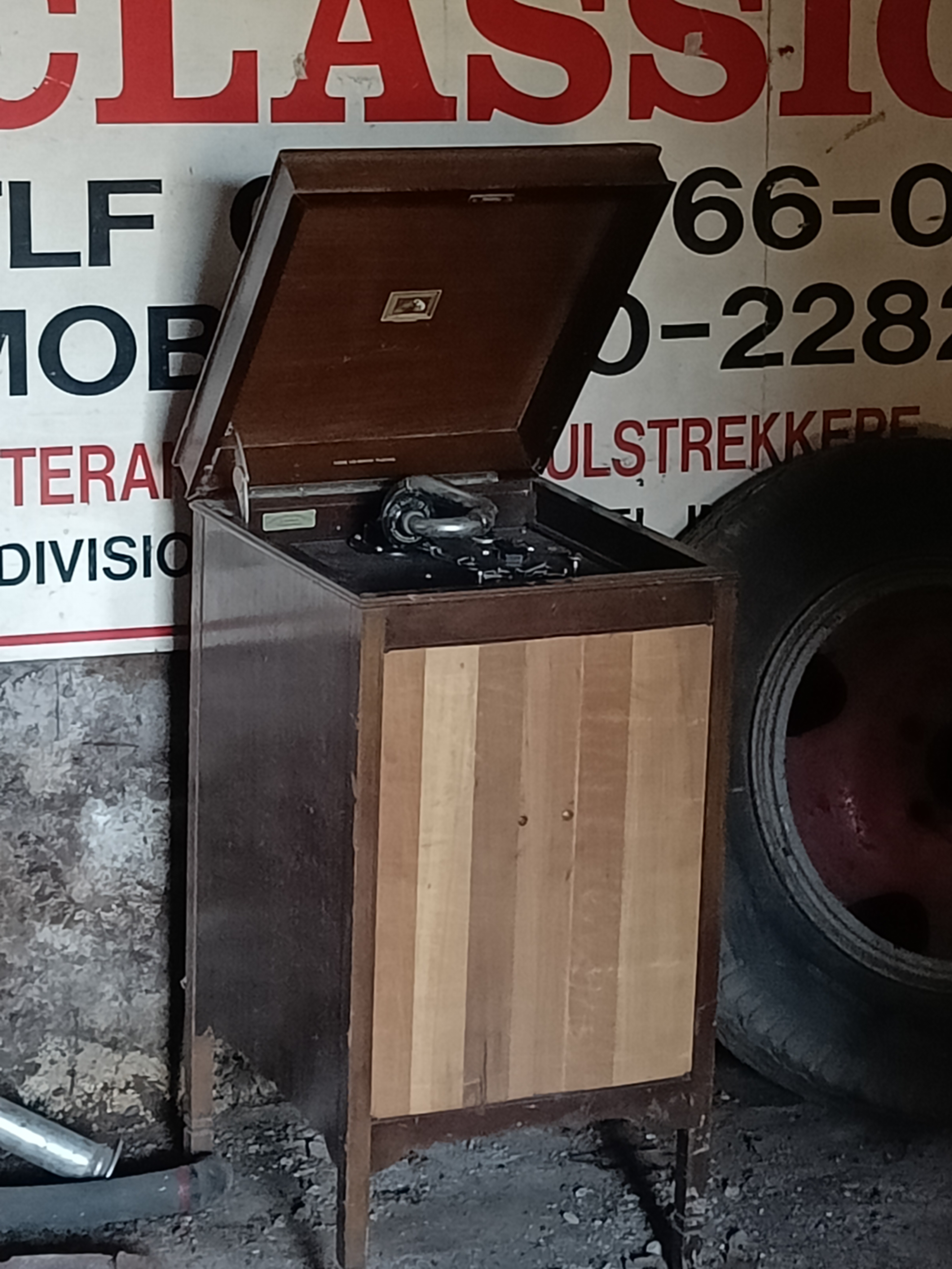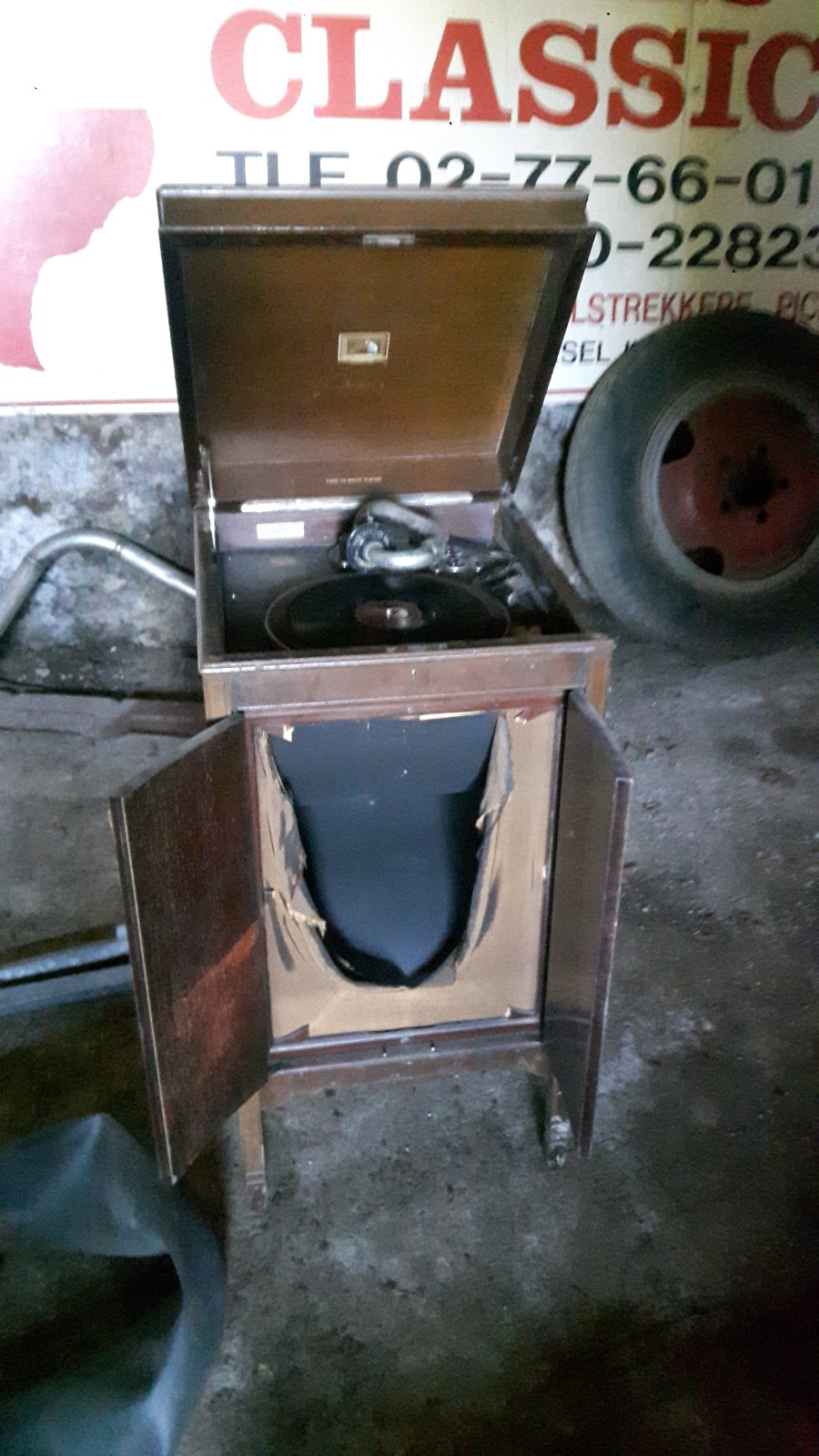 Still, this was a dung cellar find, and it was a sad look really, a HMV 157 standing alone in this dung cellar. I still tool some pity on it, since I knew the landfill was close on the horizon for this machine. I at first wanted to try to restore it, but with doors that were bent because of long time dampness, and also missing veneer on both door, and veneers falling off on the rest of the machine, I understood this would be too difficult, at least for me to restore it.