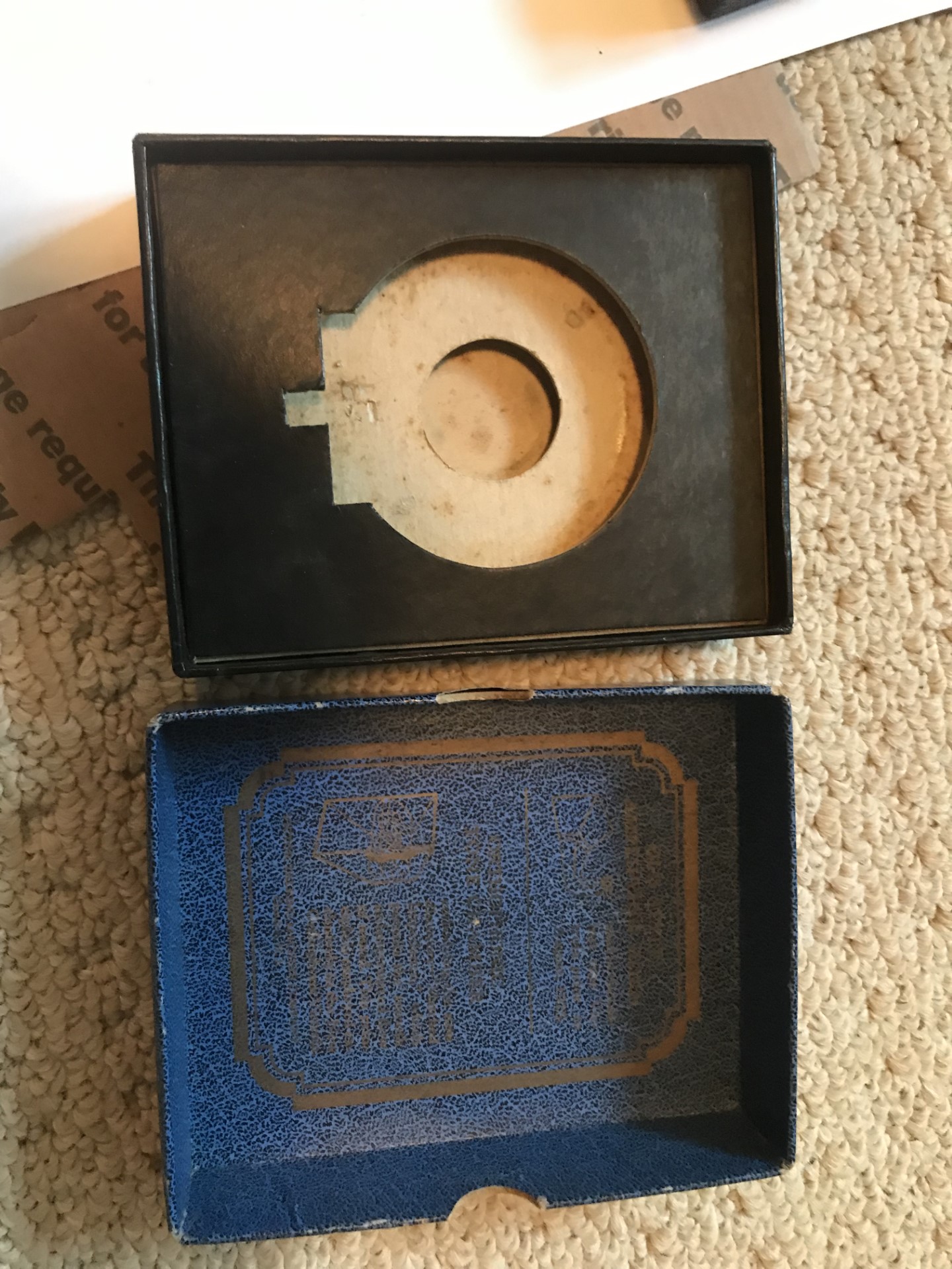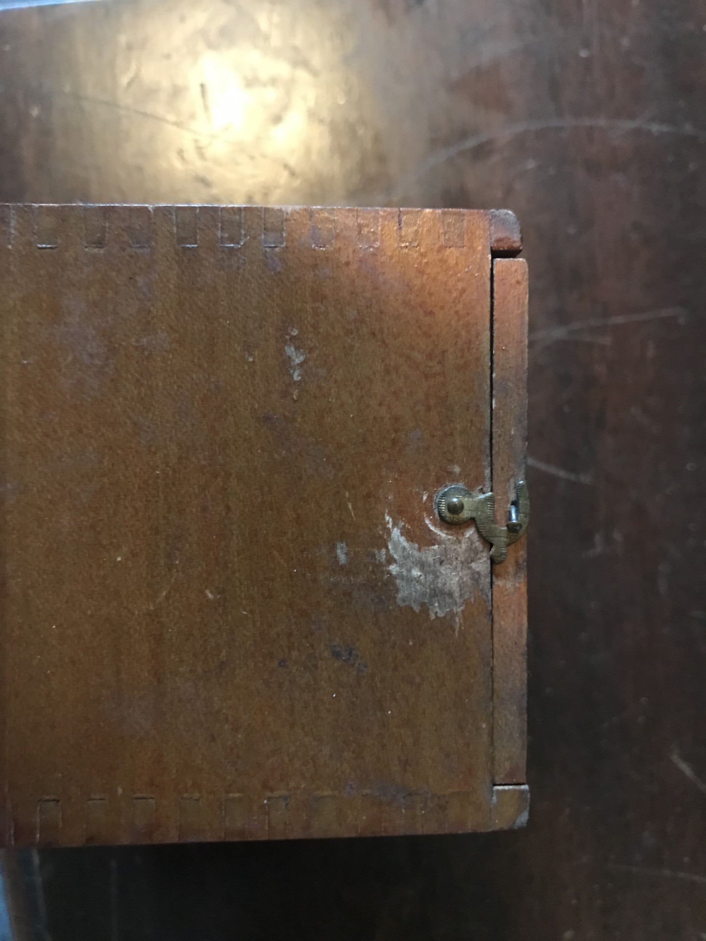 The wood box lid tape is torn so lid and box are separate and the inside shelf has a crack thru it. The latch is present and works good.