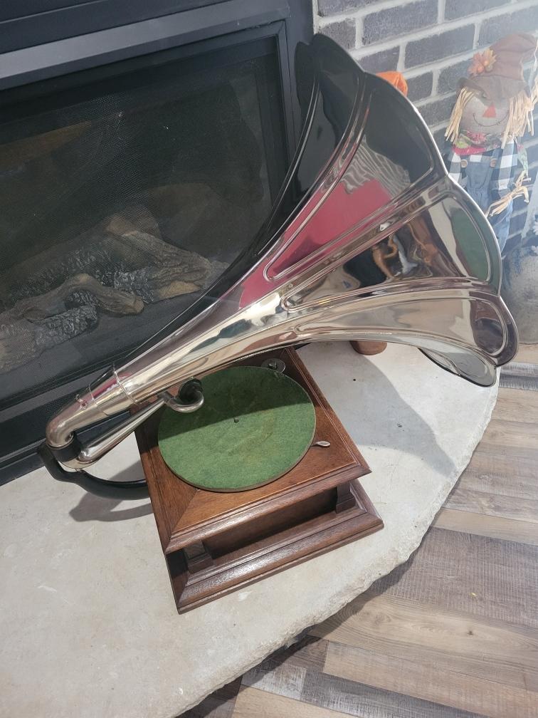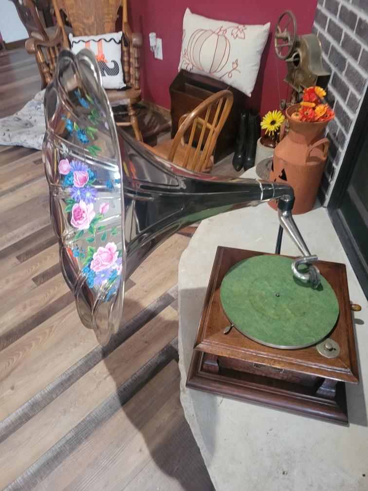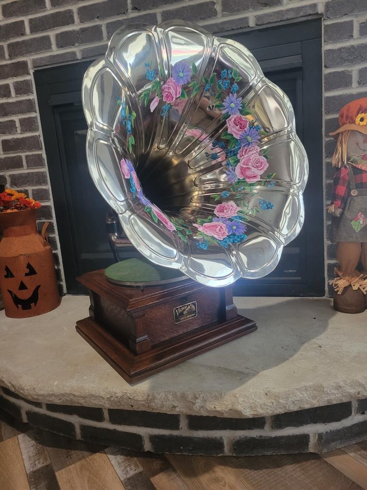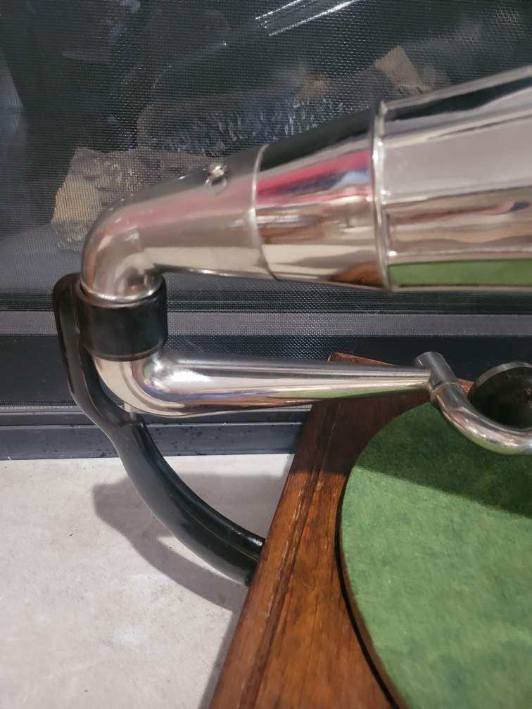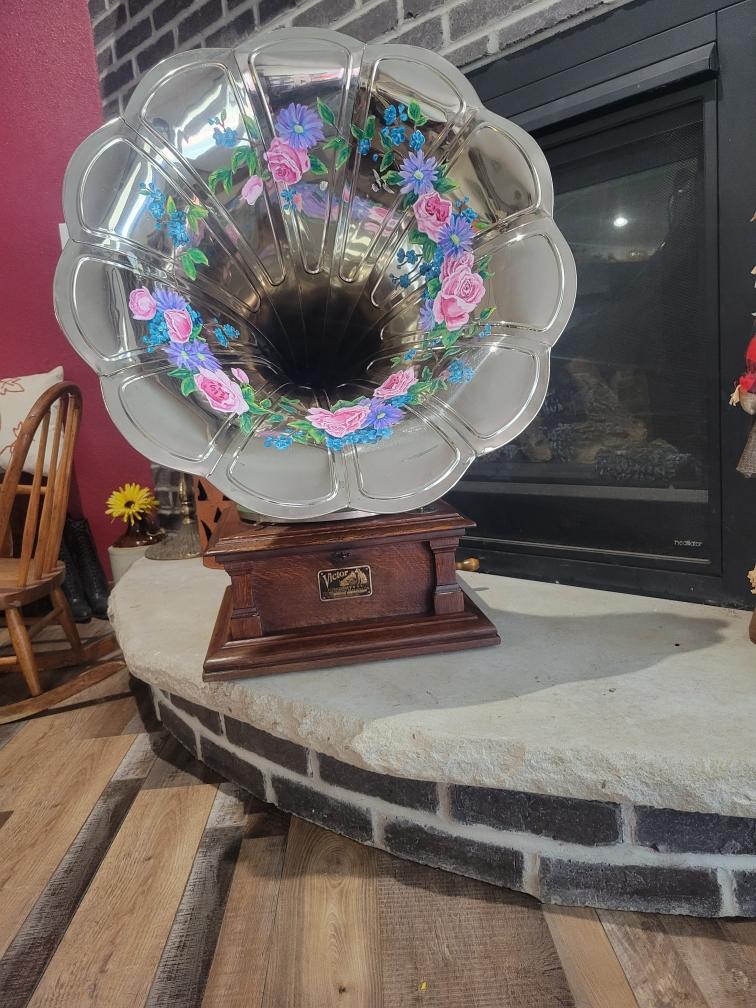 Here is a very nice example of a Victor 5 with an AWSOME nickel horn with painted flowers. The horn is as straight as you will find!!!!!! A true survivor. NO the petals are not bent. Just reflection. The machine is in great shape with the back bracket having some wear. This is the latter slip in style elbow. Asking 2300.00 for it and would prefer no shipping. I can get it to the Midwest show in June. If you really want this shipped, I am sure it would be close to 400.00 with 2 VERY LARGE boxes. First to post SOLD gets it. Partial trades considered. I purchased this from Raphael Cole a while back. I was told to check to see if the needle touched the center spindle and it falls short. FAIR offers accepted. Looks like I should have checked when I bought it. SORRY, I was not trying to be deceptive. Tom