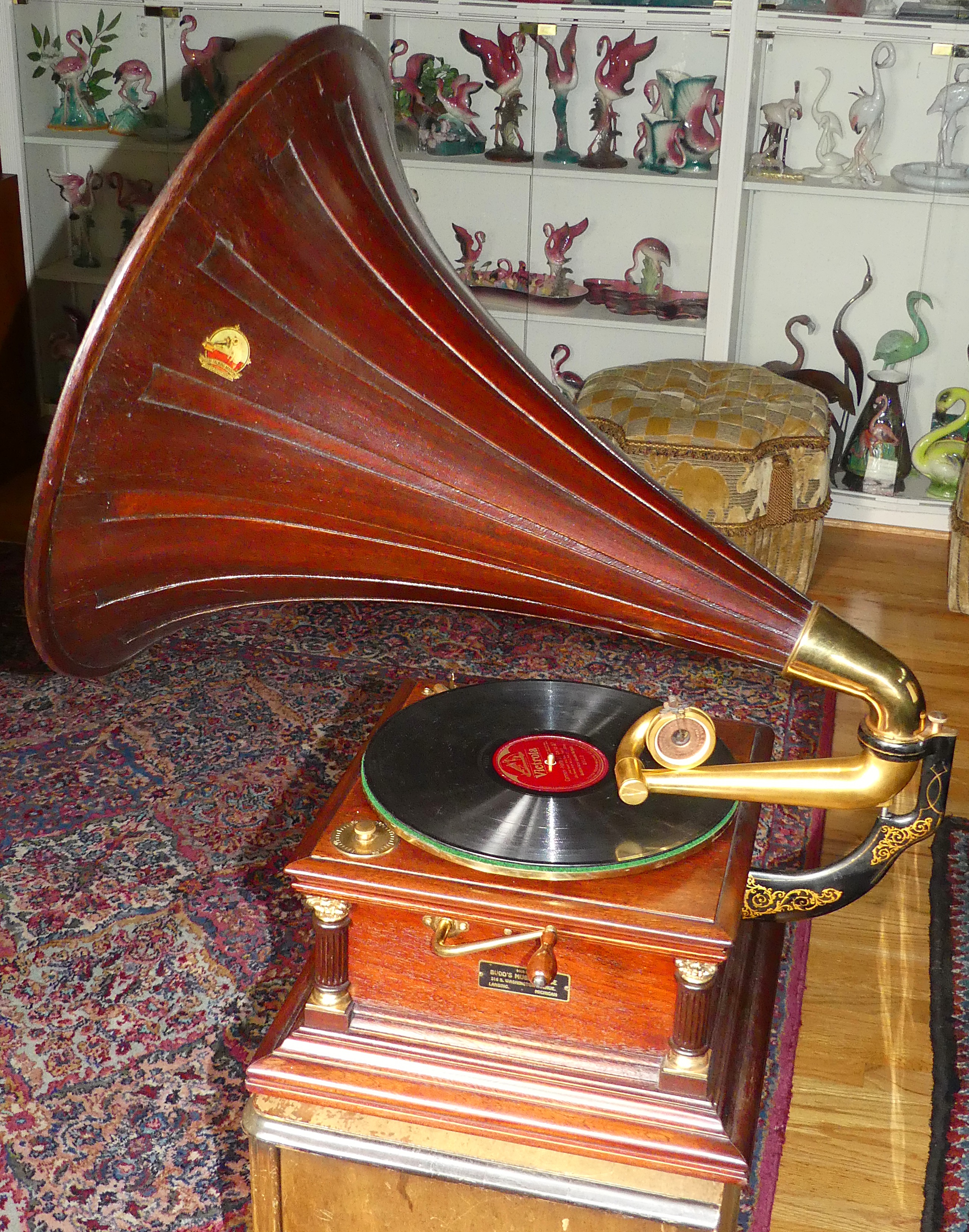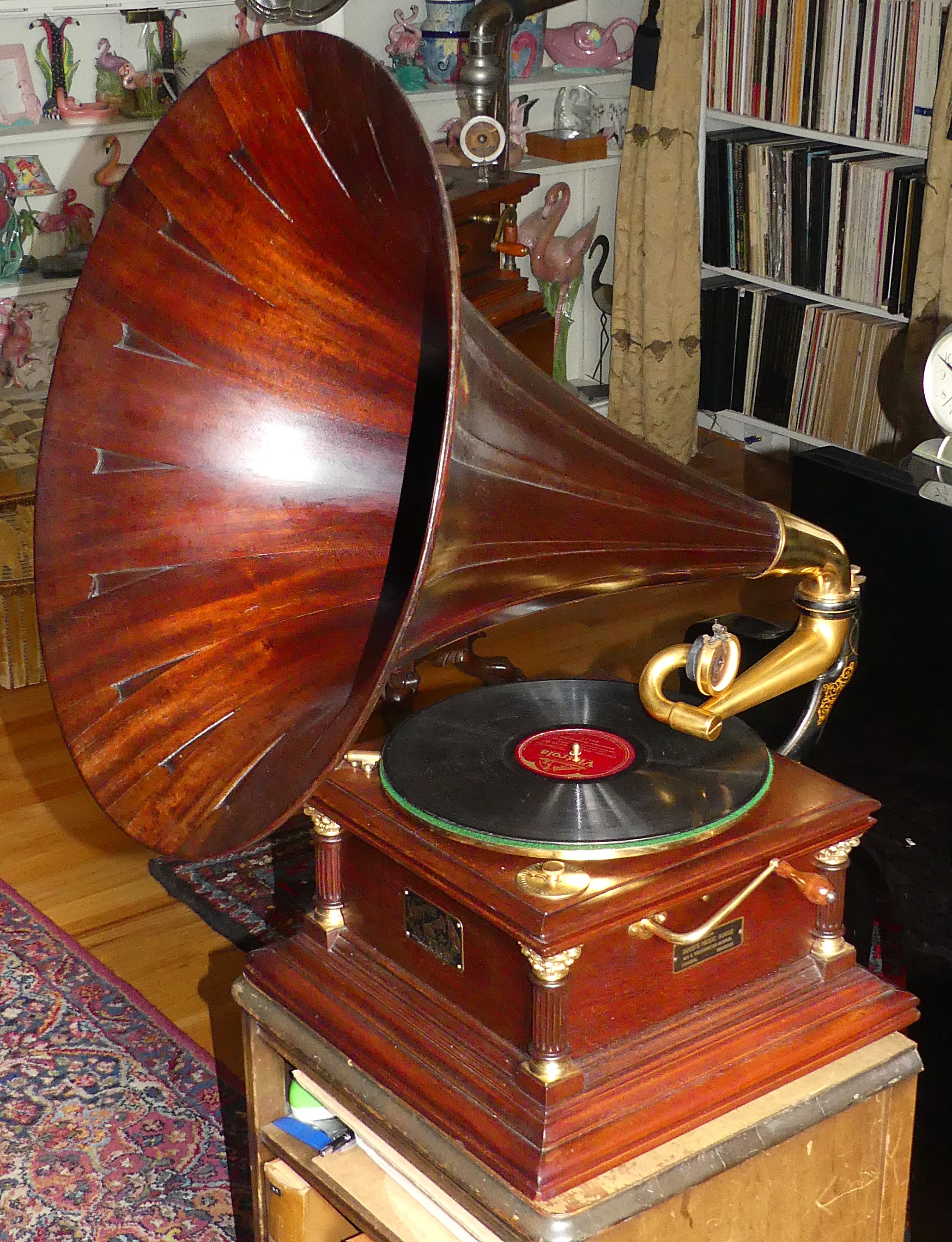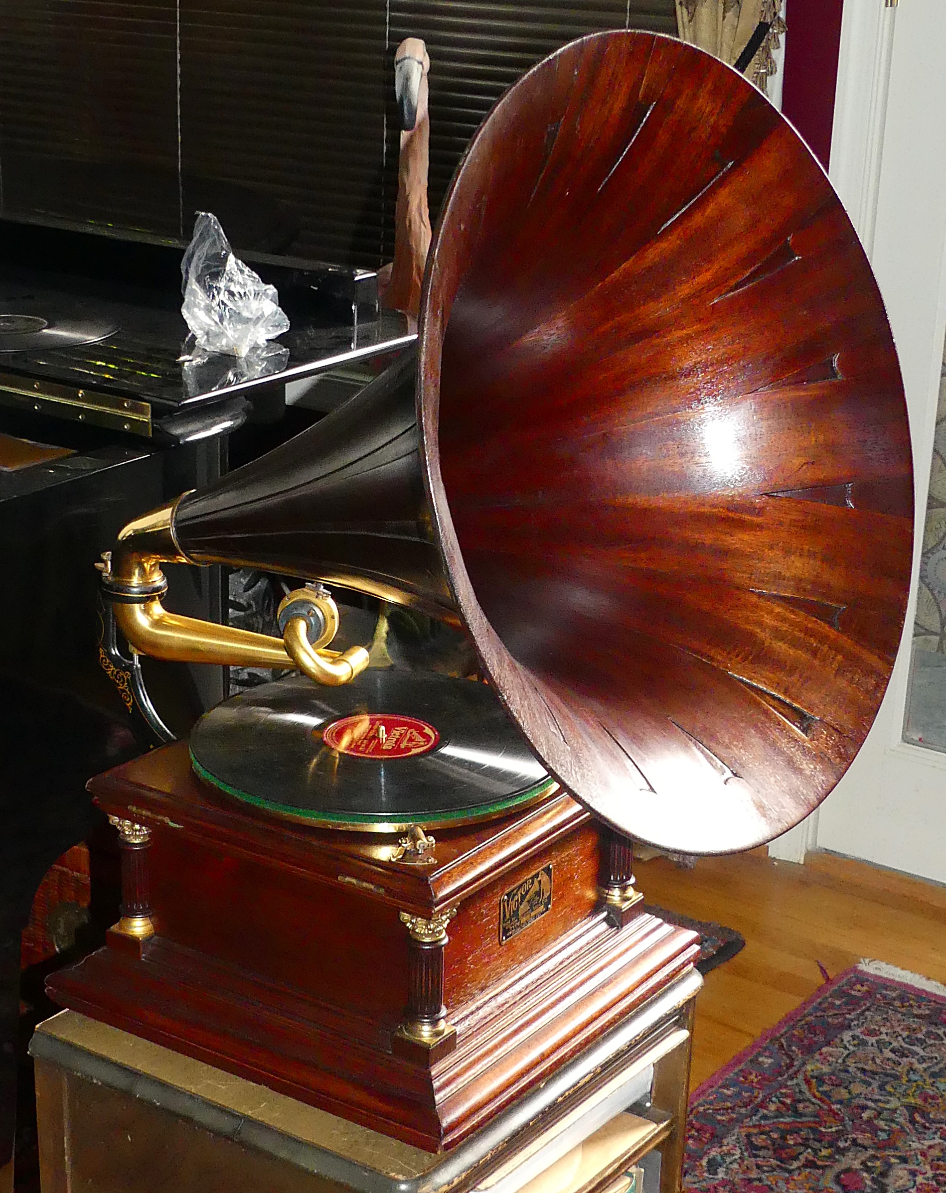 Thanks to forum member daverob, I've now achieved a long-held wish to own a Victor VI. Definitely a step up from the less-than-pristine Victor V that it replaces. Not only does the VI look better, it *sounds* better. A few photos are below. Yeah, it deserves a better stand; that rather drab little cabinet was just the most convenient place to put it when unpacking.