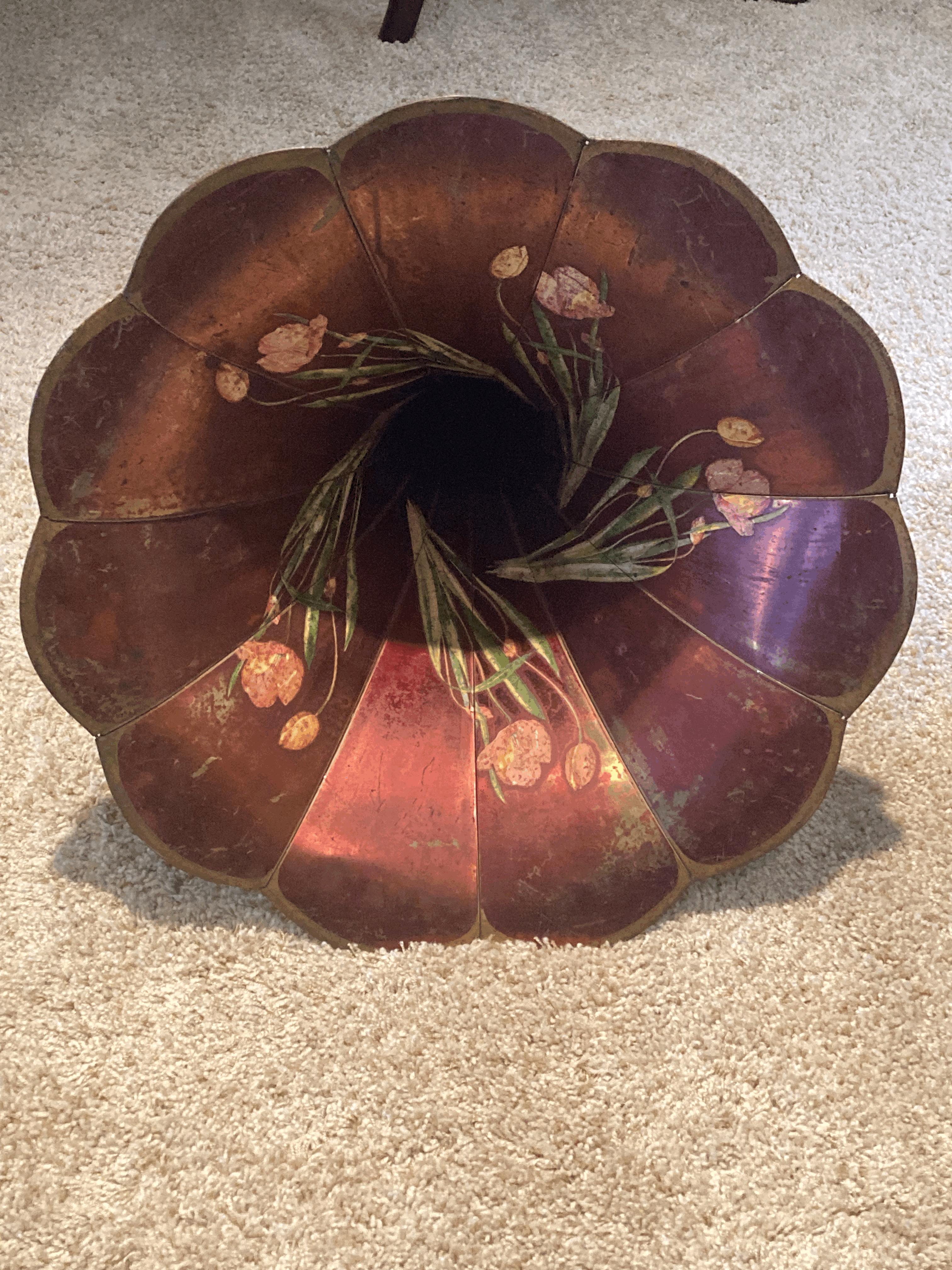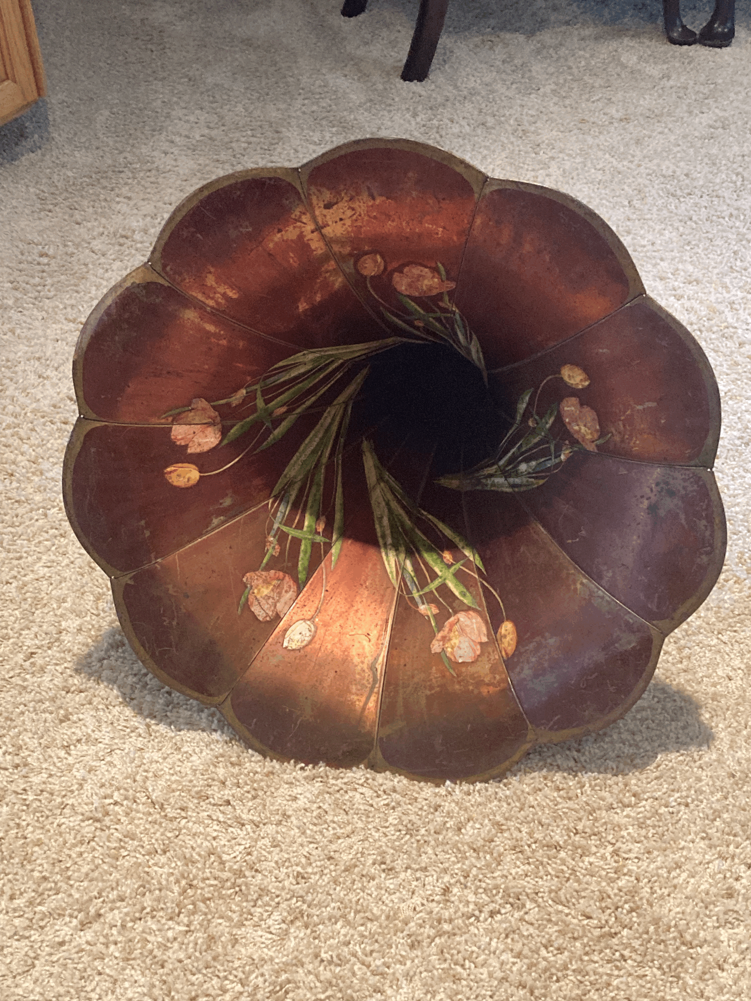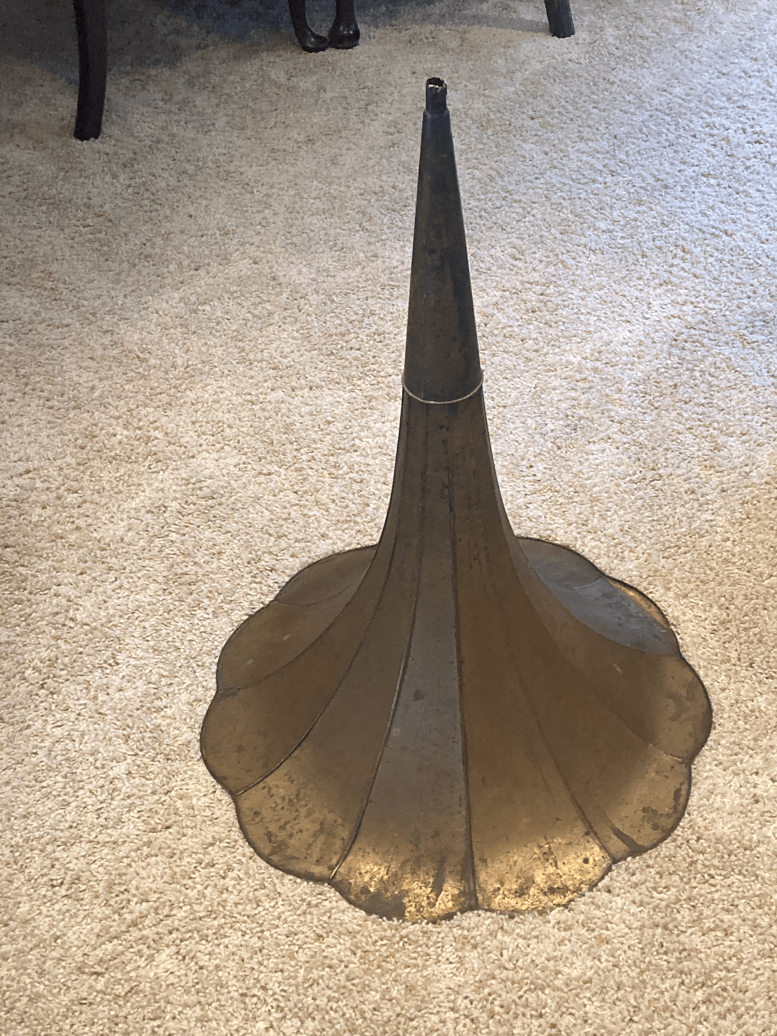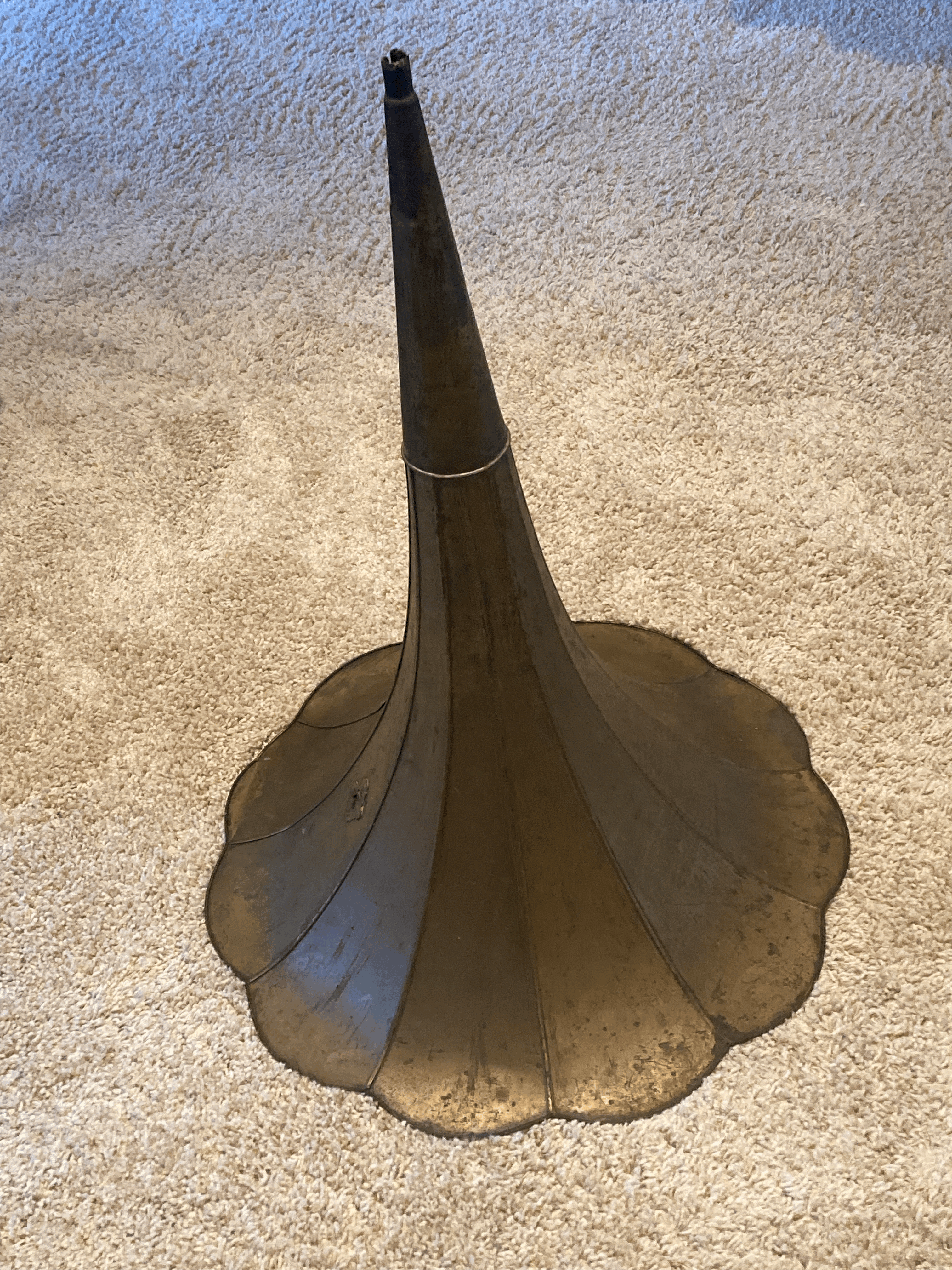I'm selling a nice large morning glory horn suitable for a Triumph or Home. It's a solid horn in good original condition. It's 32" long and 24" across the bell. I'm happy to deliver to either the Midwest or California expos at no additional cost or possibly along my route between Oregon and either expo. The price is $100. Questions?