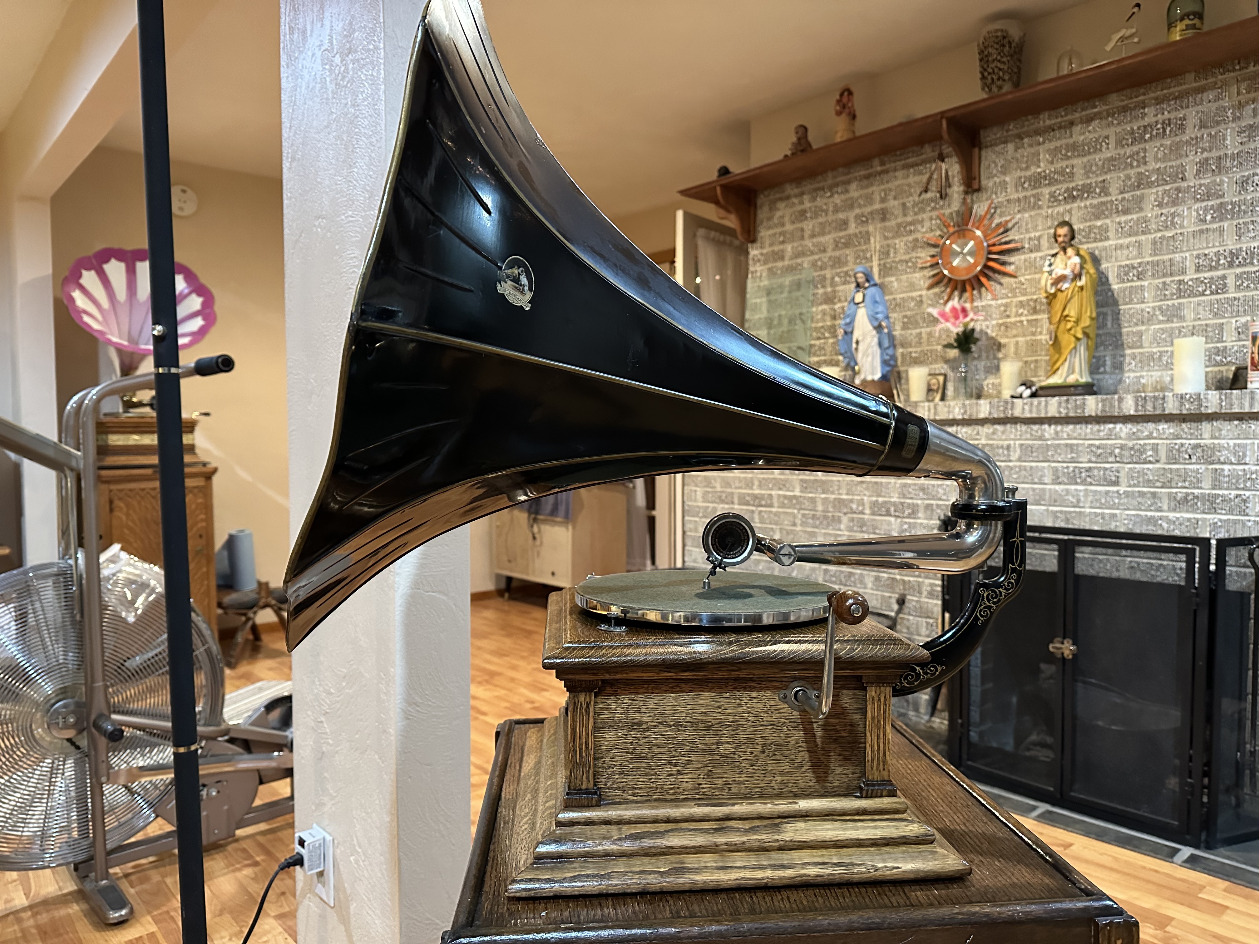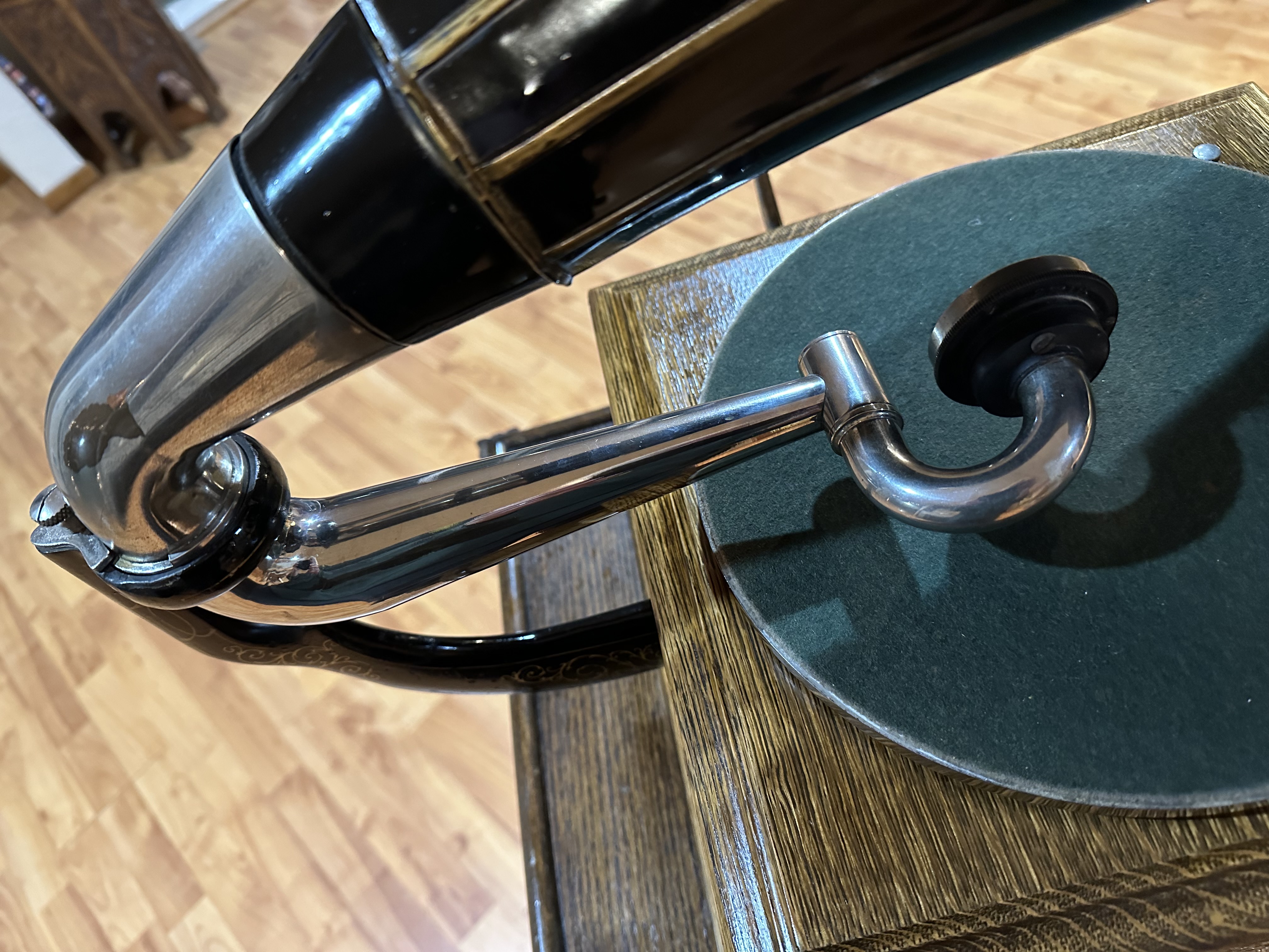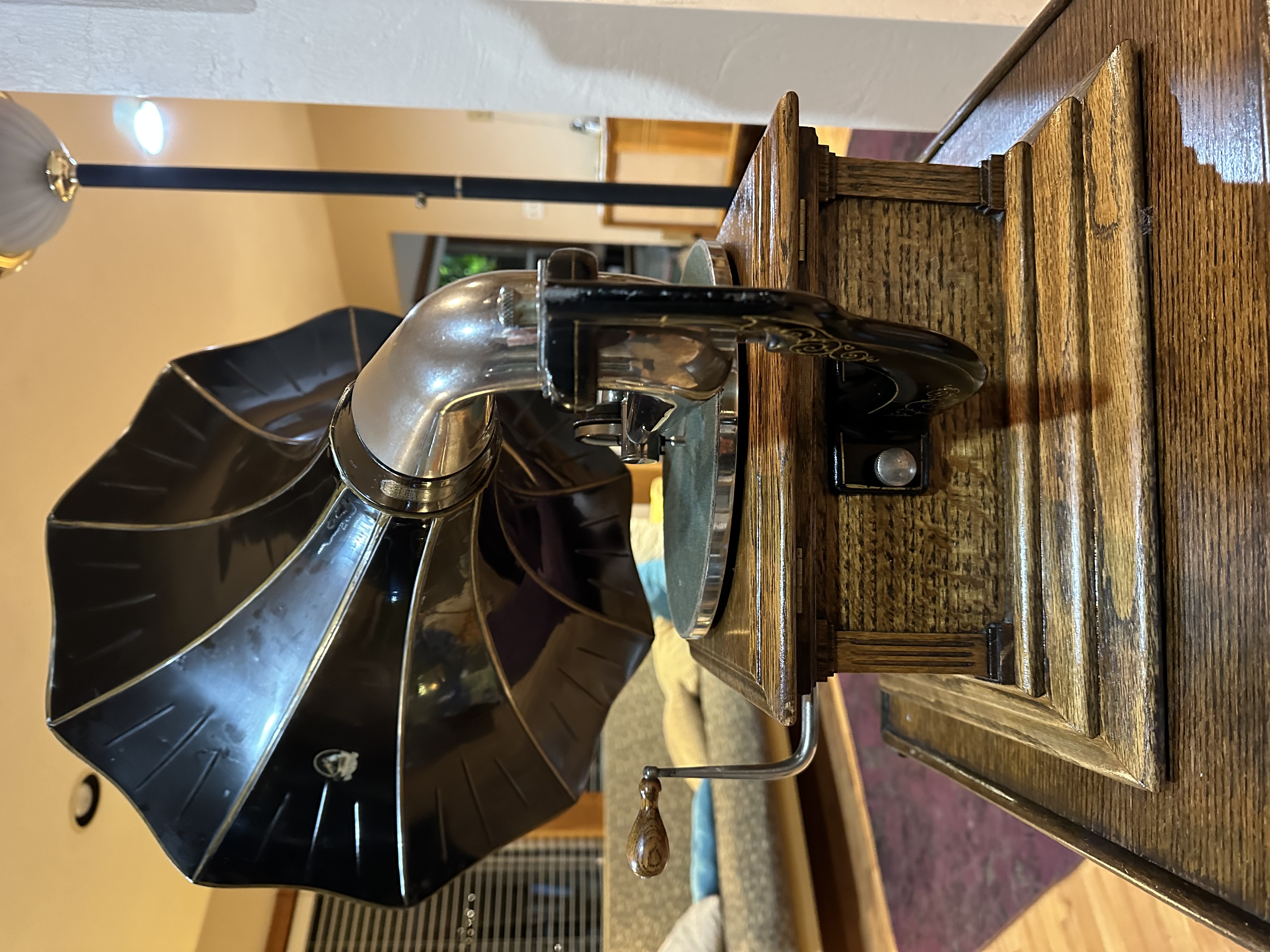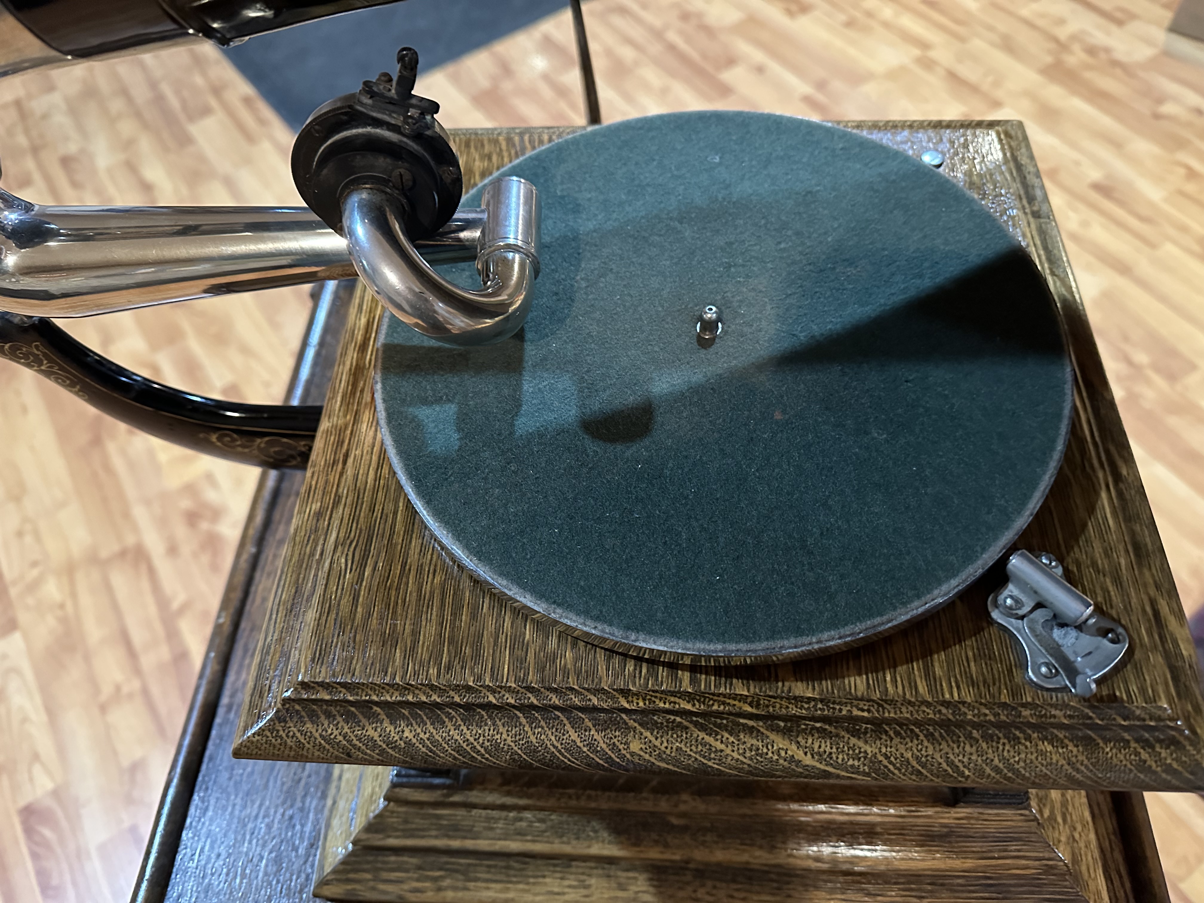 The spring motor is clean and excellent running- quiet like a later Victrola; no thumps, bumps, or speed variations. It plays through a 12" record with plenty to spare.