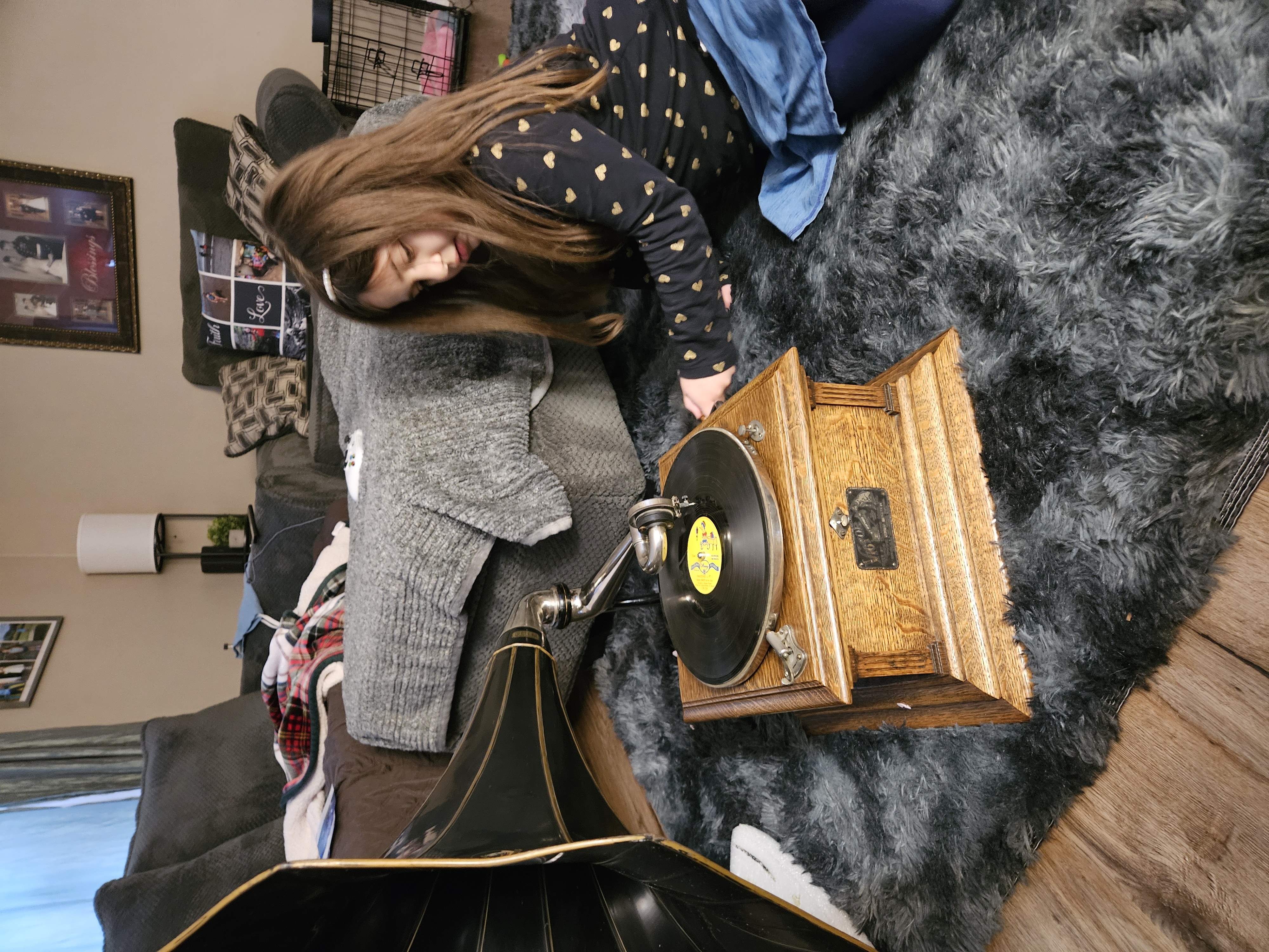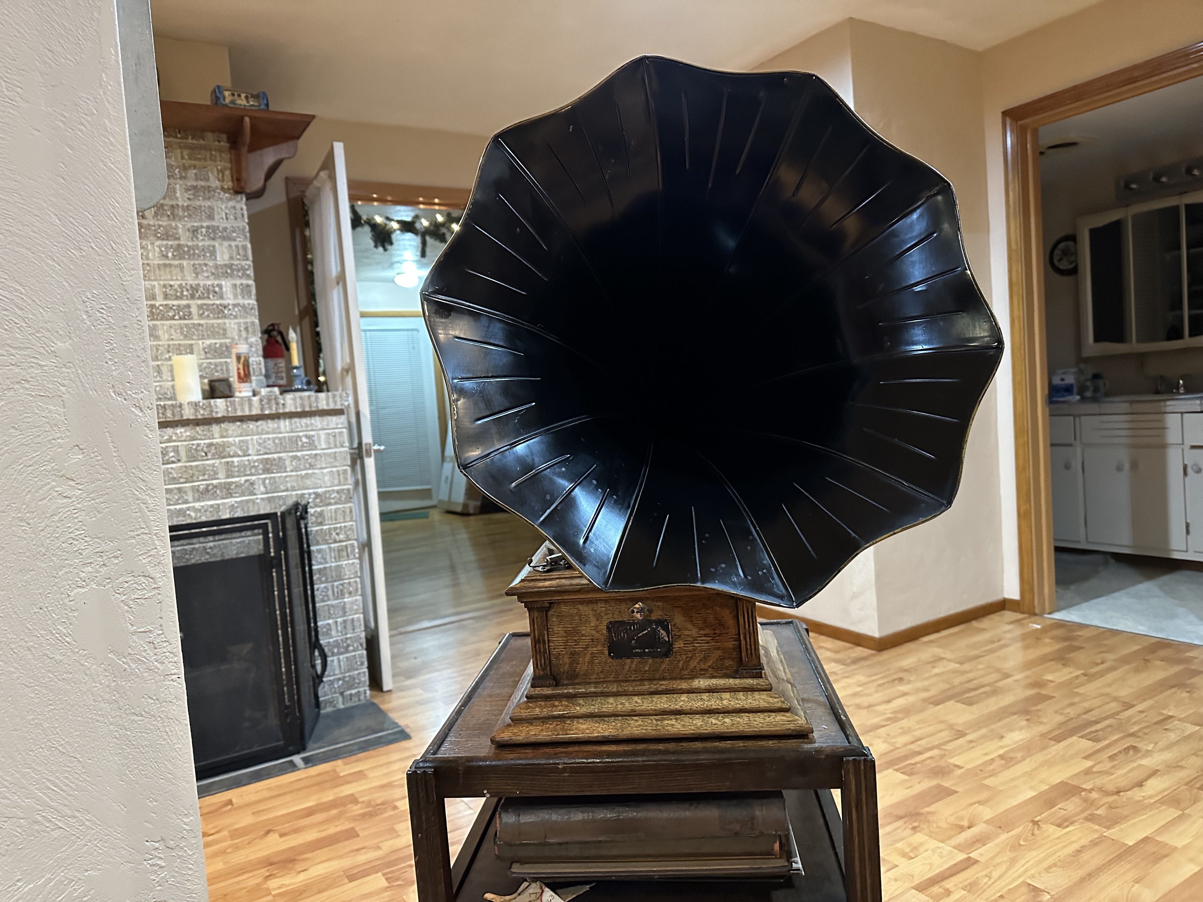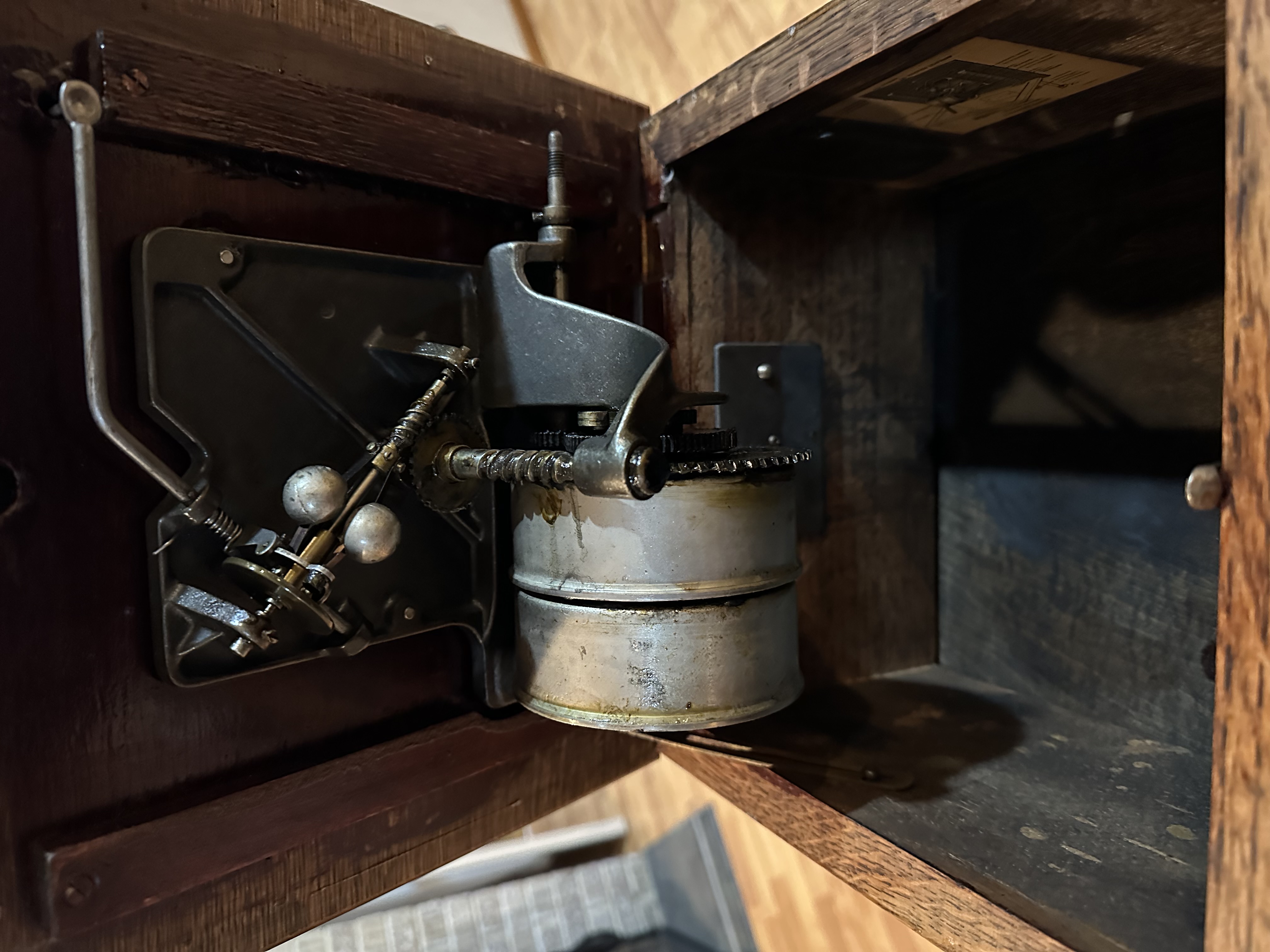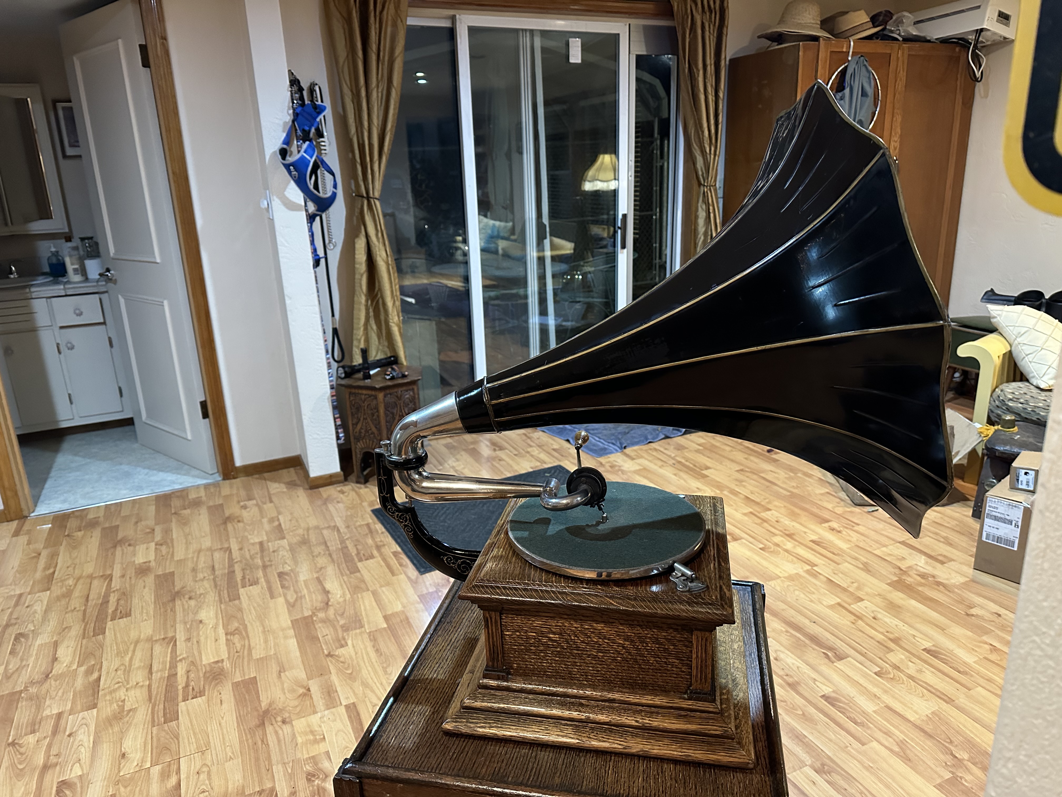 The spring motor is clean and excellent running- quiet like a later Victrola; no thumps, bumps, or speed variations. It plays through a 12" record with plenty to spare.