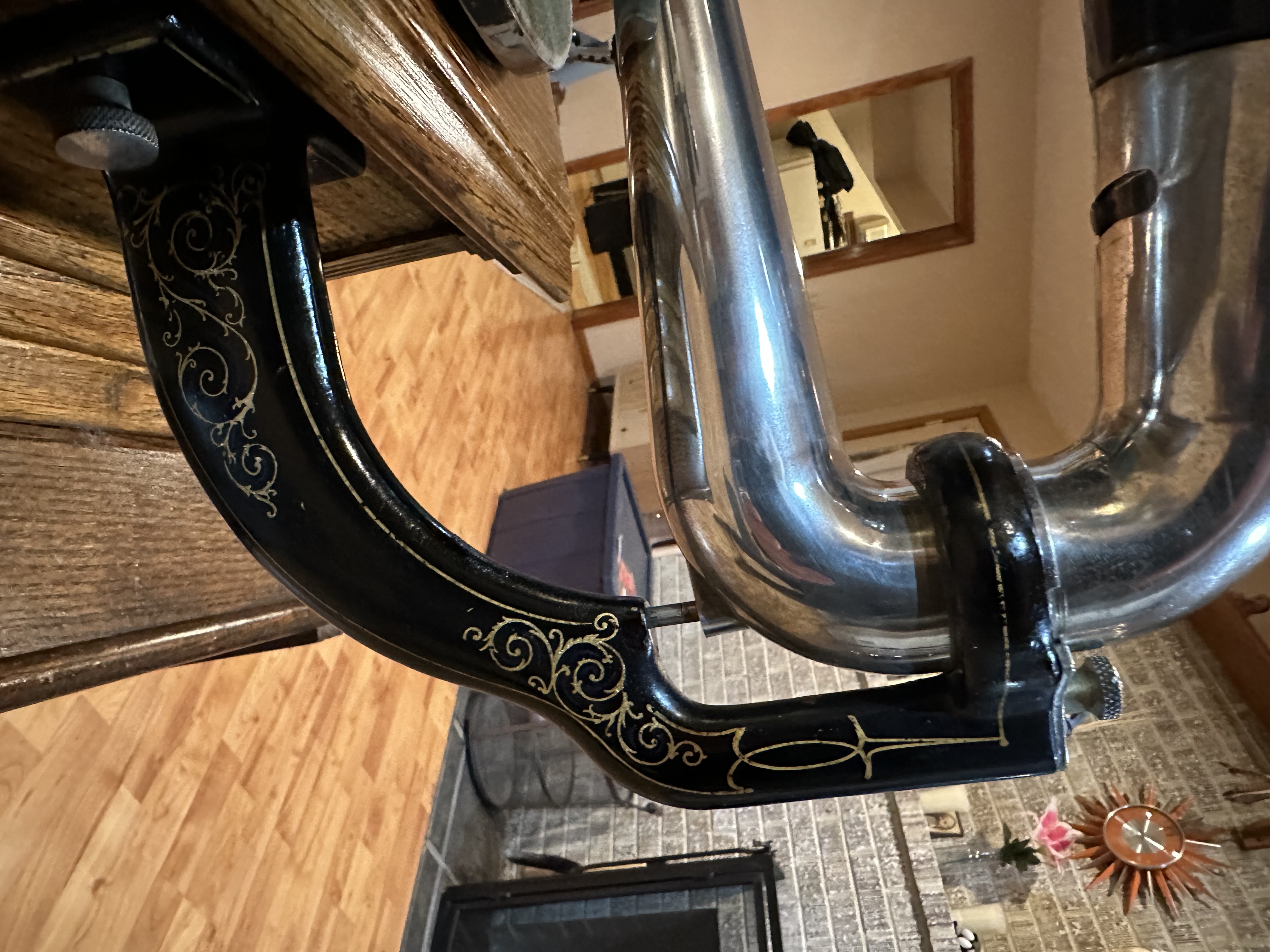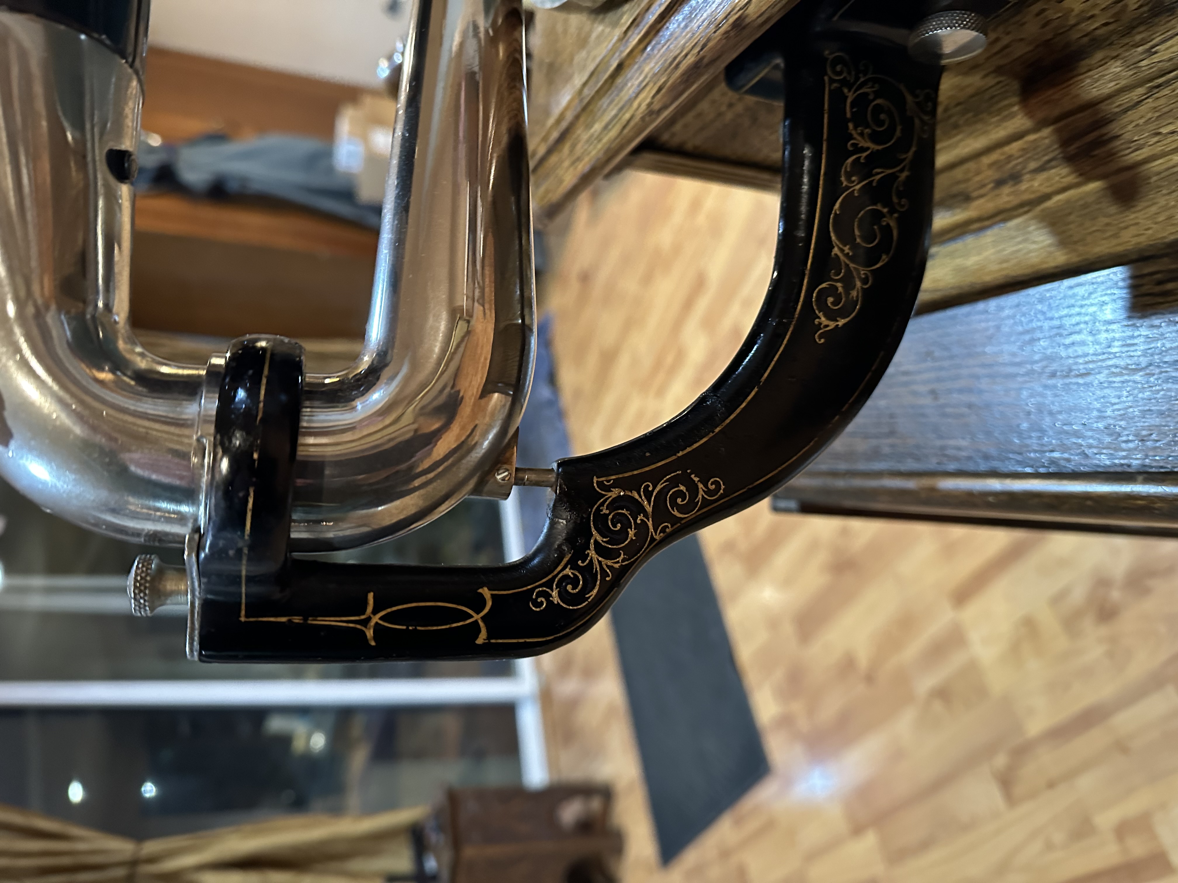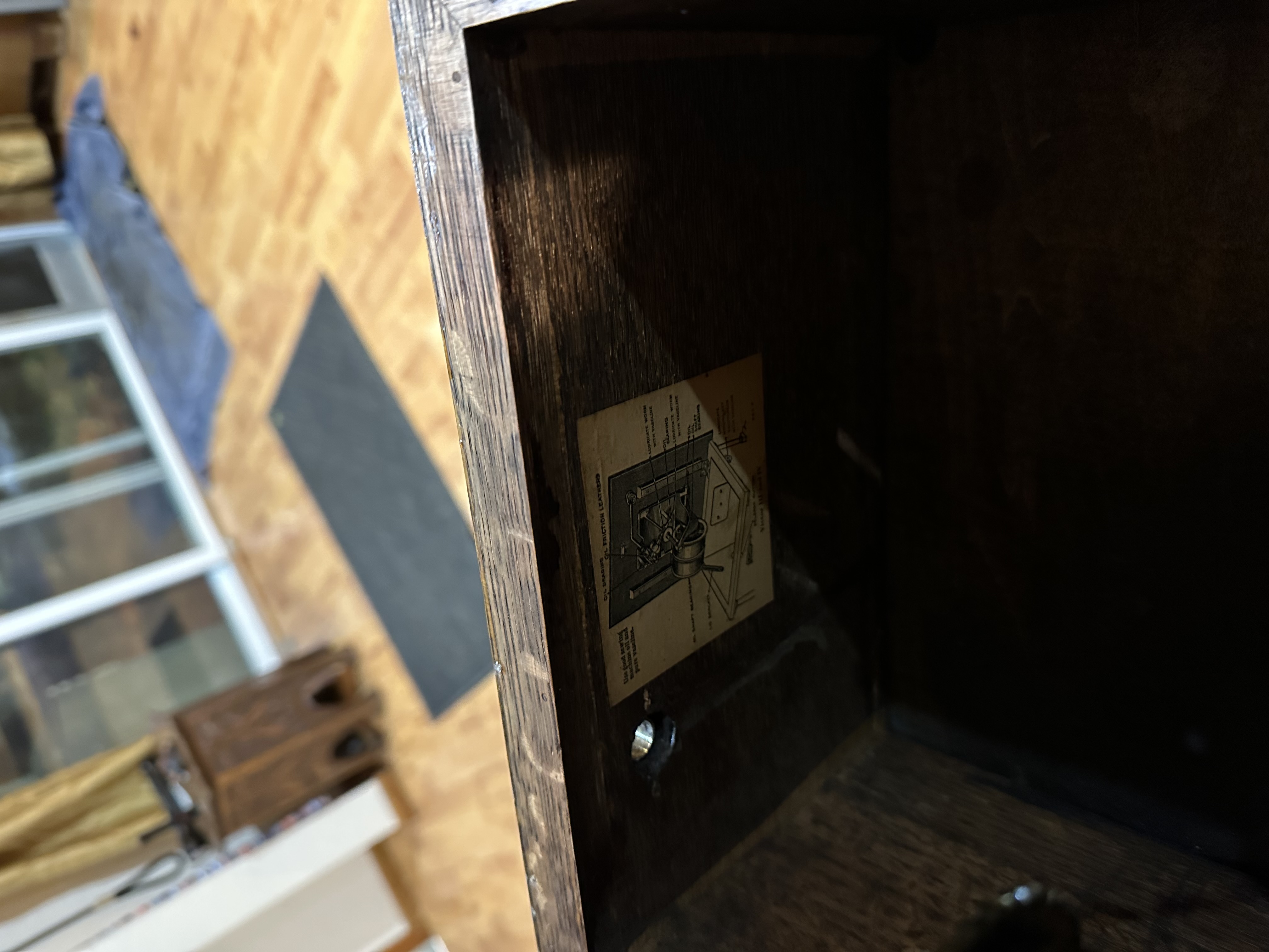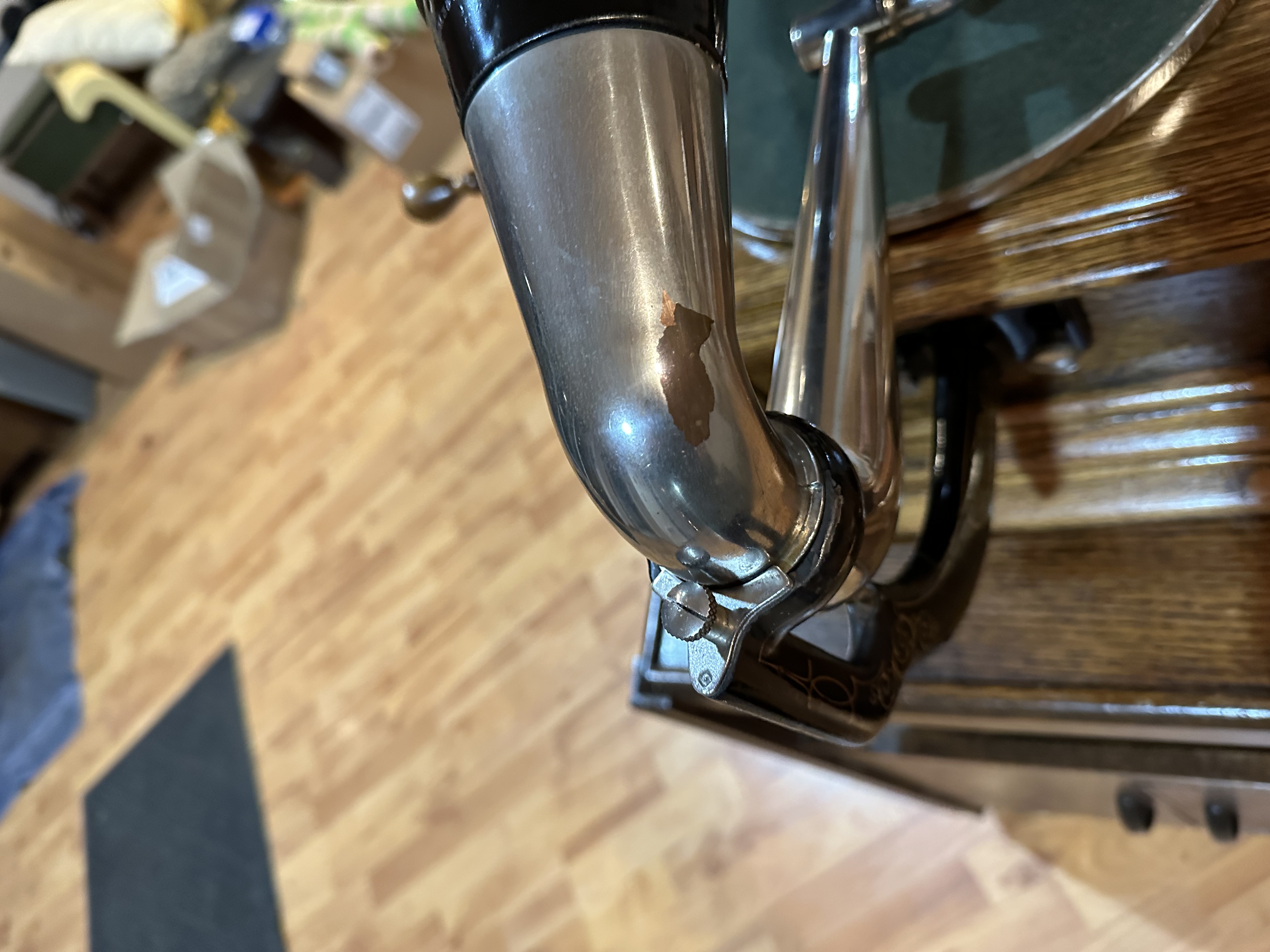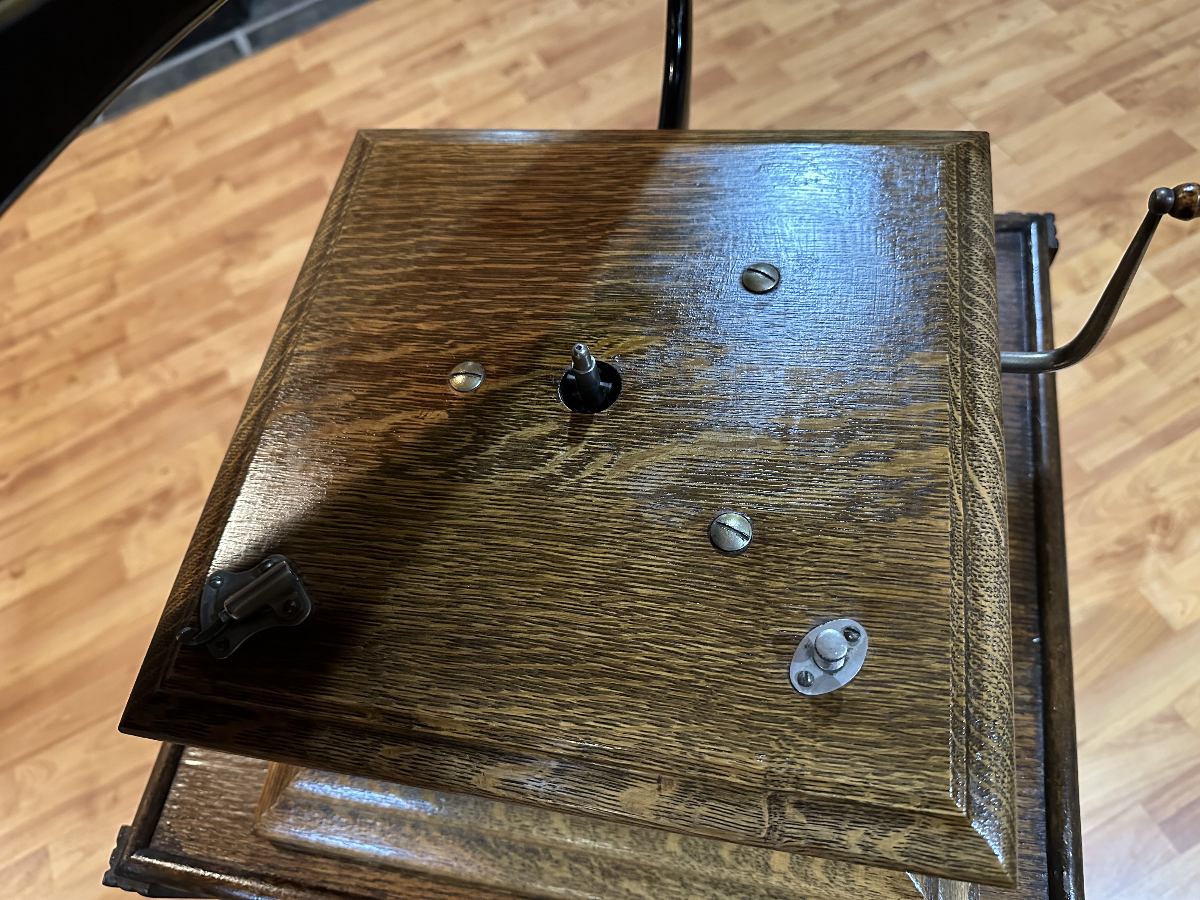 The Exhibition soundbox does have the triangular needle hole, so it may not be original to the machine... or it may. I don't see a suffix on the serial number so who knows. Also, I am absolutely certain the cabinet finish is not original. It's a great "original style" finish, though. The outside finish is a damn good match to the inside of the box. However, on the underside of the motor board, there's a definite glossy red mahogany finish, so my guess is that someone "modernized" it after mahogany came into mode, likely a long time ago, and a subsequent owner put it back to original. Aside from that, the amount of originality to this machine is pretty amazing. It clearly has been cherished.