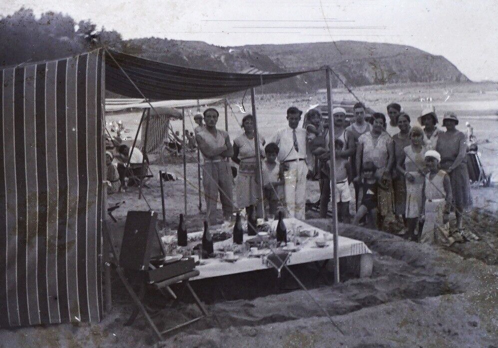 If like me you are already fed up with Winter, which here in Somerset has so far been abnormally wet, cheer yourself up with a look at this pre-war beach scene. A family gathering with a picnic, a gramophone and enough wine to keep everyone happy.