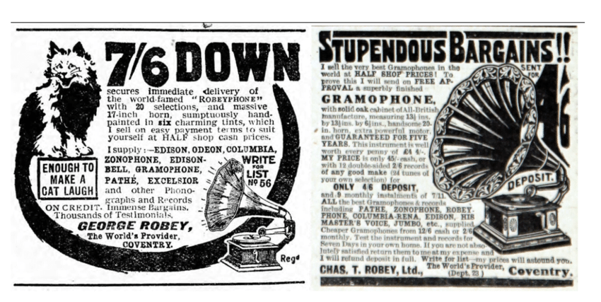 The gramophone was offered for sale by mail order for a 4/6 deposit by Charles T Robey Ltd. Coventry.