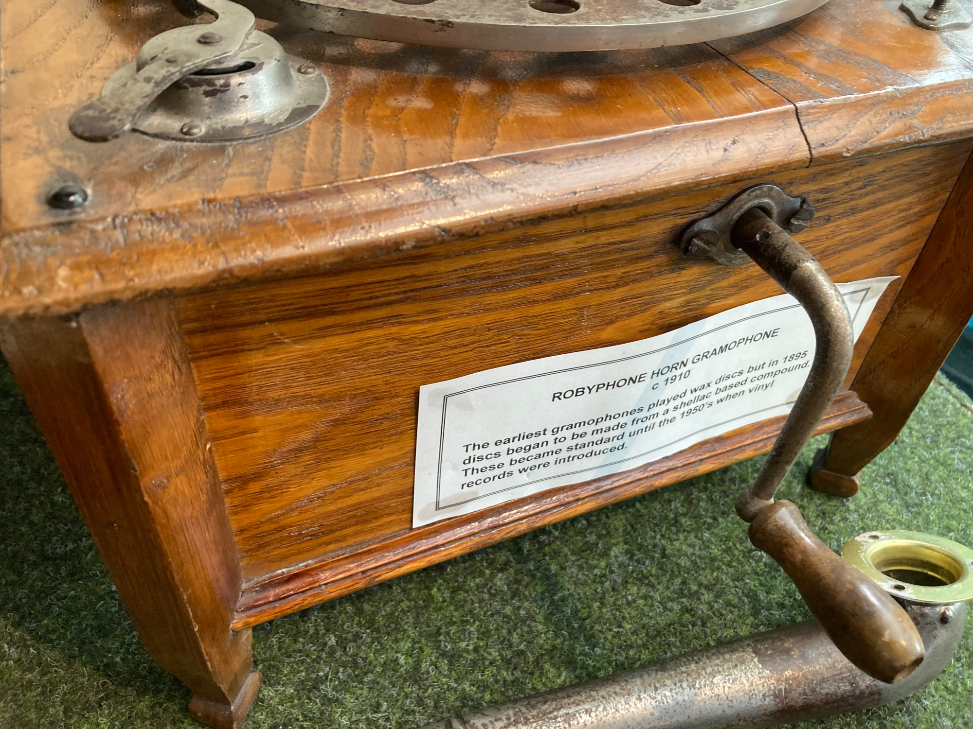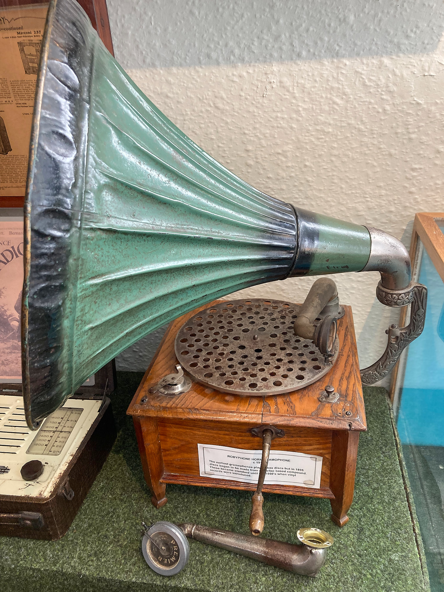 Just resurrecting this thread as last week I visited the Nidderdale Museum in Pateley Bridge, North Yorkshire, UK. On display in the 'Entertainment' section was this Robeyphone machine. The descriptive note attached to it wasn't very informative (as well as mis-spelling the name) so I don't know the story of how it came into the museum's possession (I wish I'd asked now!). Anyway, what on earth has happened to it? It looks like the original tone arm lying in front but why someone would take it off and attach another arm/soundbox to the motor board is anyone's guess - I wonder where the sound comes out!
