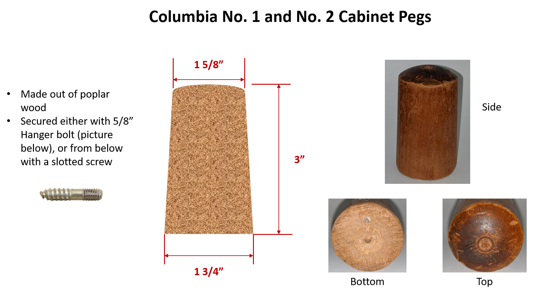 I'll start by sharing details on the Columbia wooden pegs, most often missing, and used in cylinder cabinets. Below is a picture and measurements that will help anyone who has, or knows someone with lathe skills to make these.