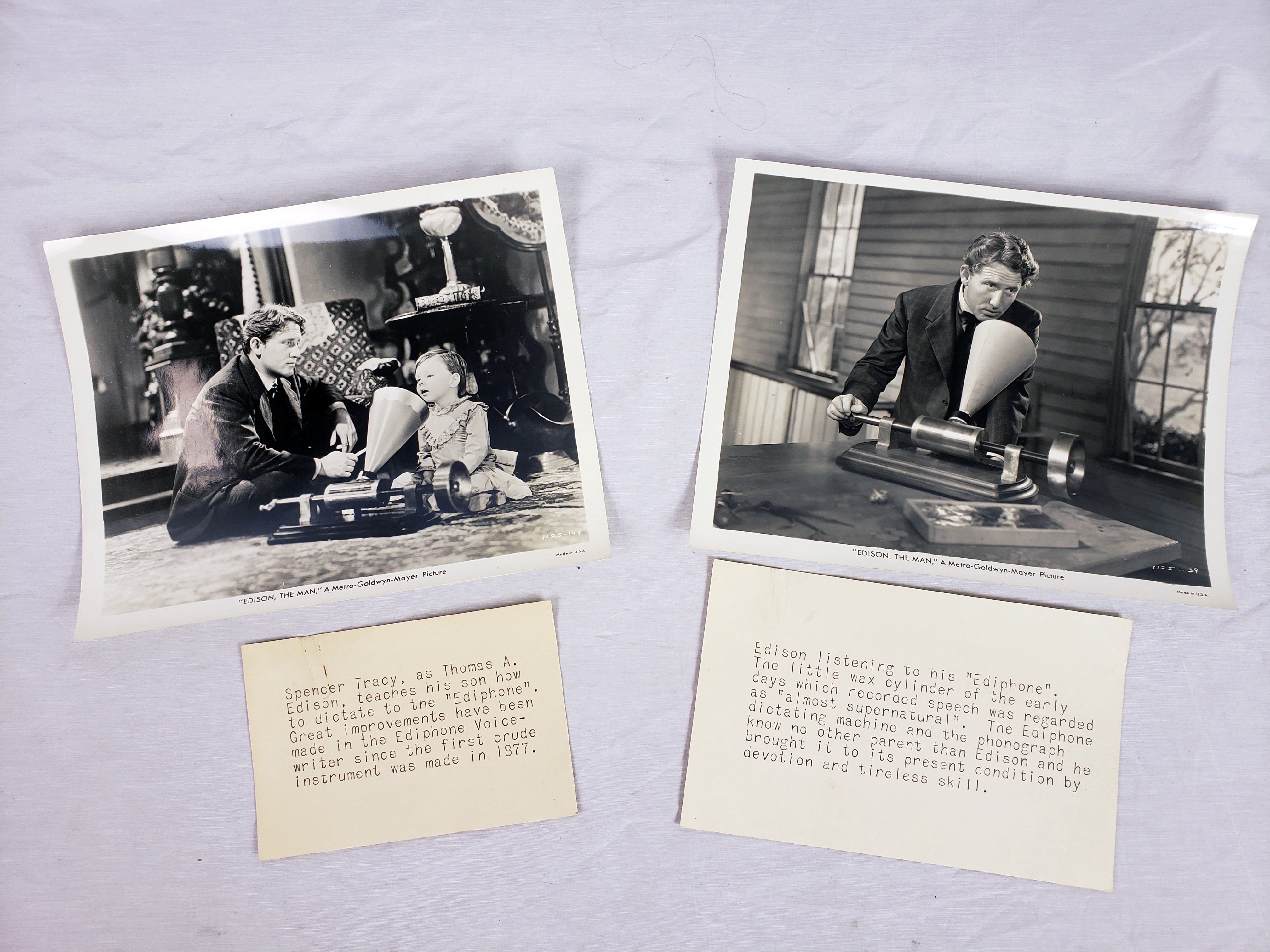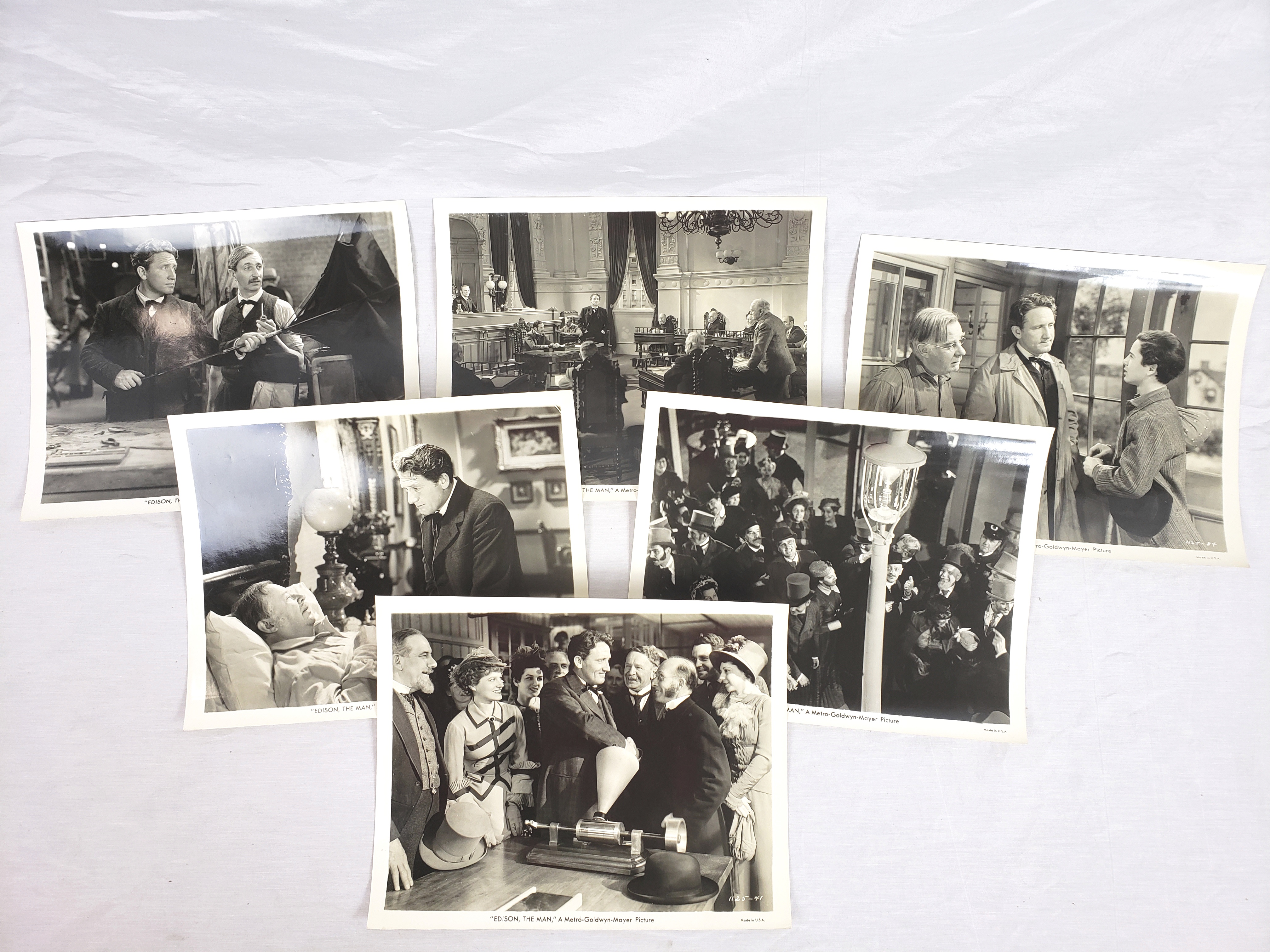 For your consideration, here's what I believe to be a complete set of twenty-five (25) 8x10 glossy prints from the movie "Edison The Man" starring Spencer Tracy. Each print is in excellent condition with no tears, creases, folds, or pen/pencil marks. A couple of them are discolored compared to the others. See the photos for each photo content and condition. Some show the movie prop used for a tinfoil phonograph, others refer to electricity or lighting.