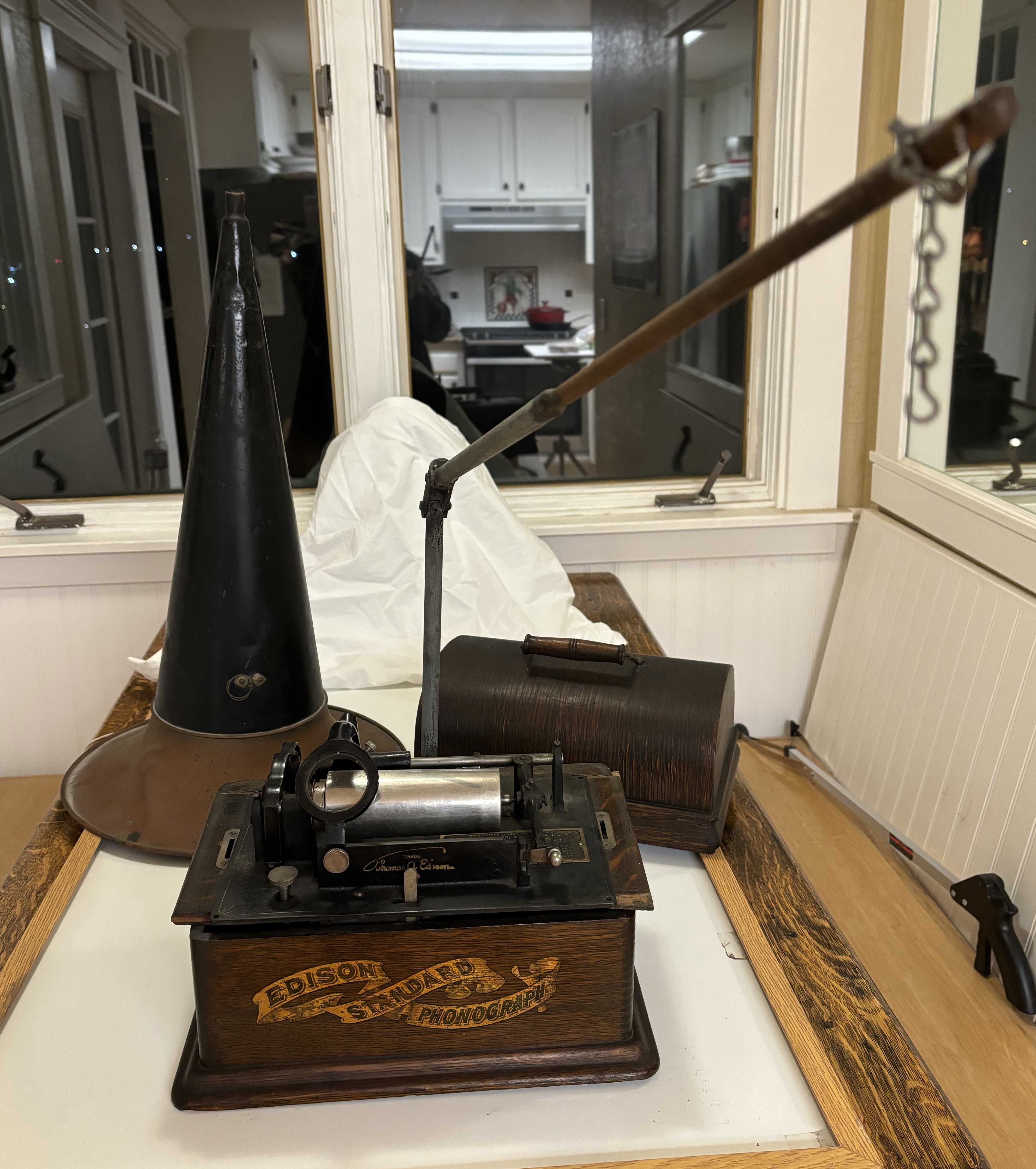 You have a nice looking Model A Edison Standard from around 1902/3. George Paul can give you a more accurate date. Your machine plays two minute cylinders. It was sold with a 14" horn with a black body and brass bell. It was common for owners to upgrade to a larger aftermarket horn and yours is an example. I believe your reproducers comes from a later business machine and is not correct. You should be able to locate a C reproducer which will give you good results. The Edison Standard was a very popular machine and sold in large numbers because it gave owners good performance. Welcome to our hobby. I hope you enjoy your Standard.