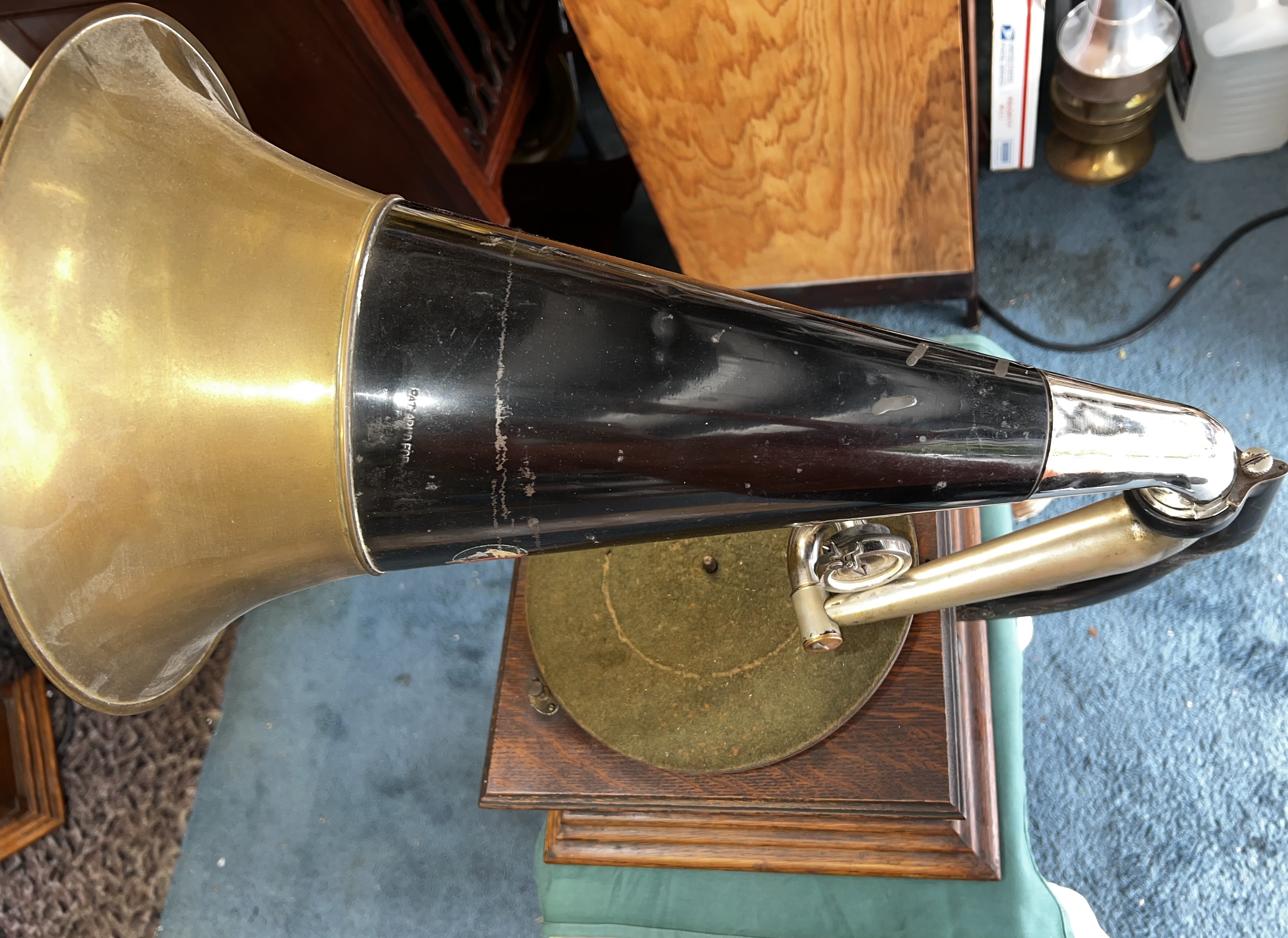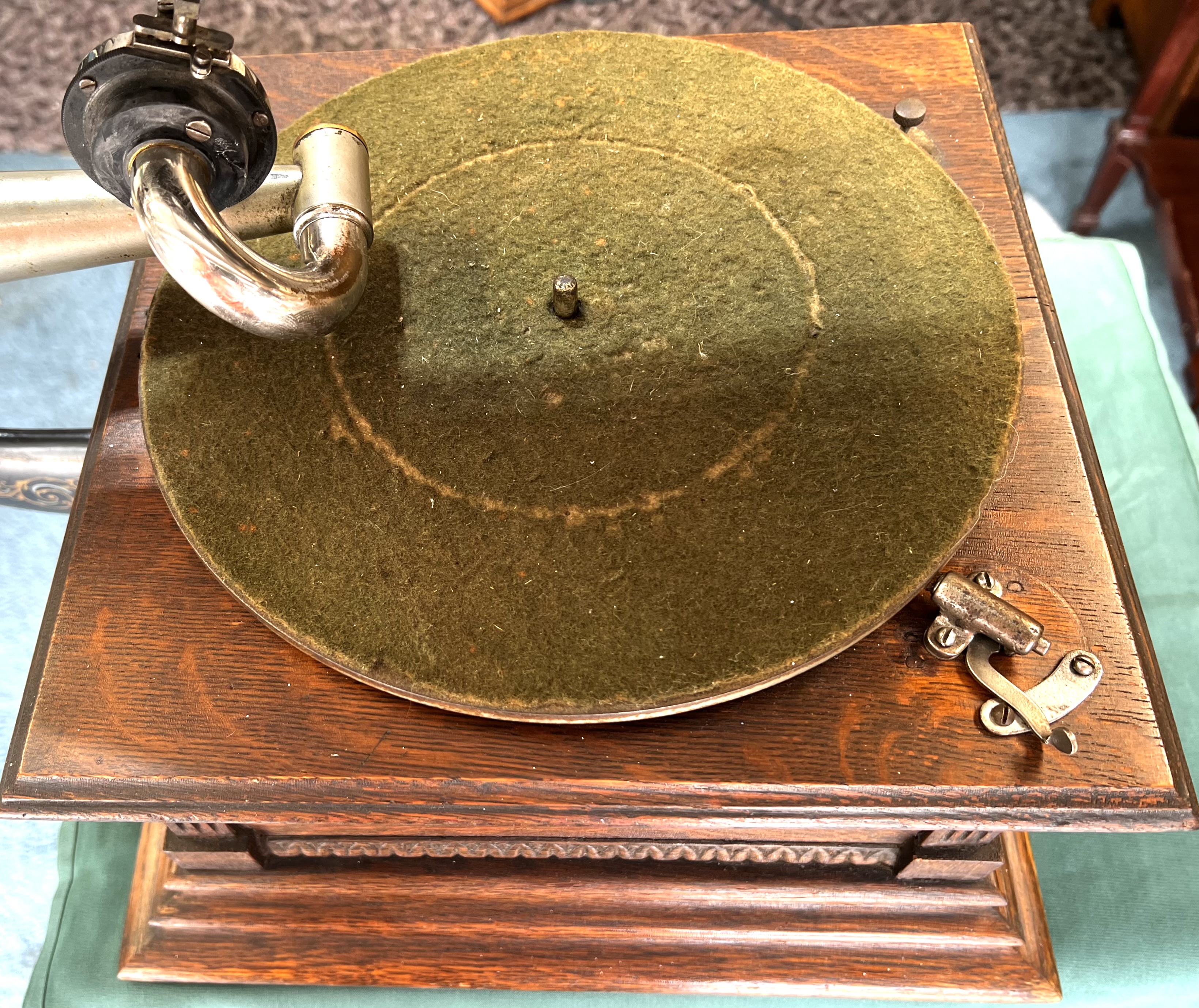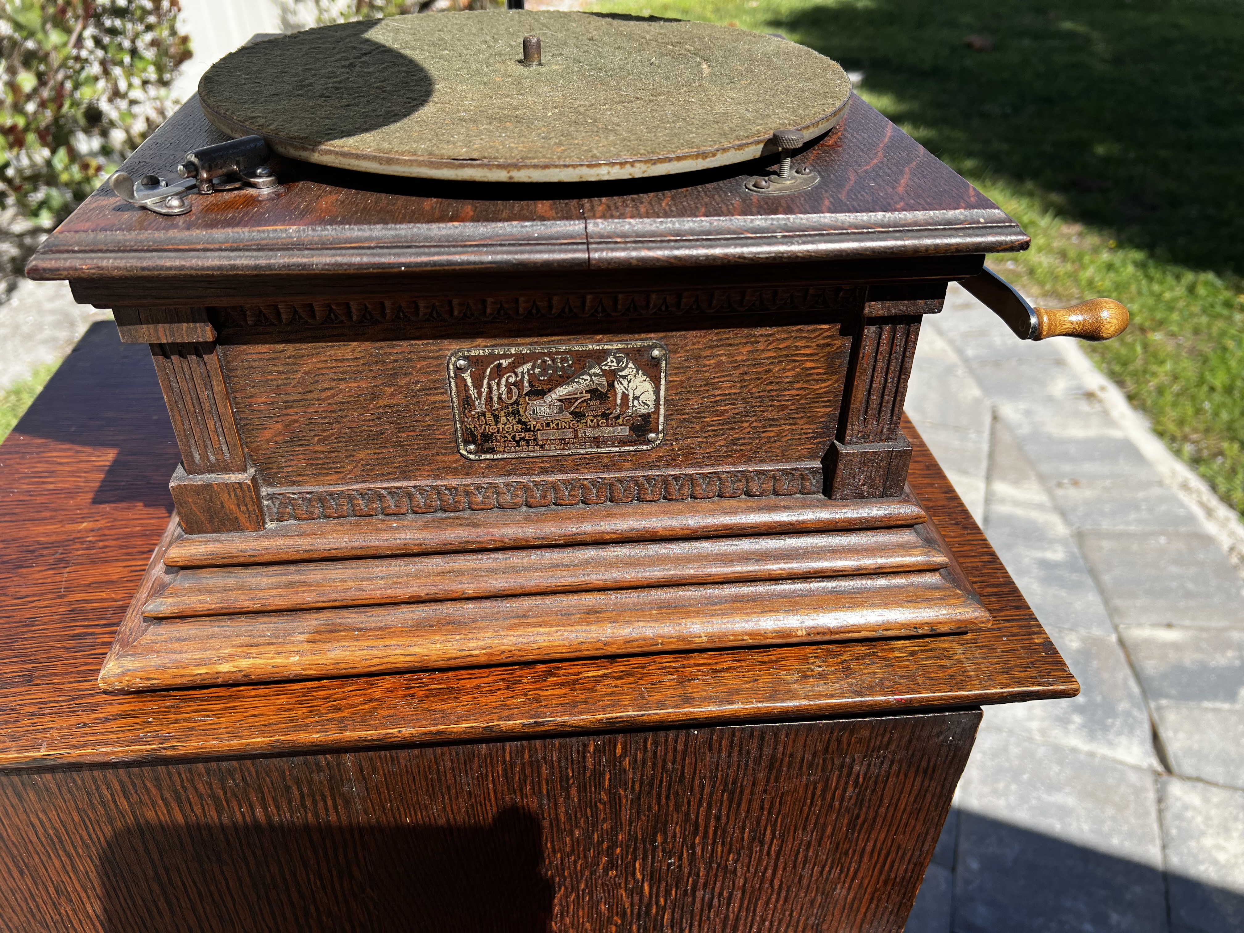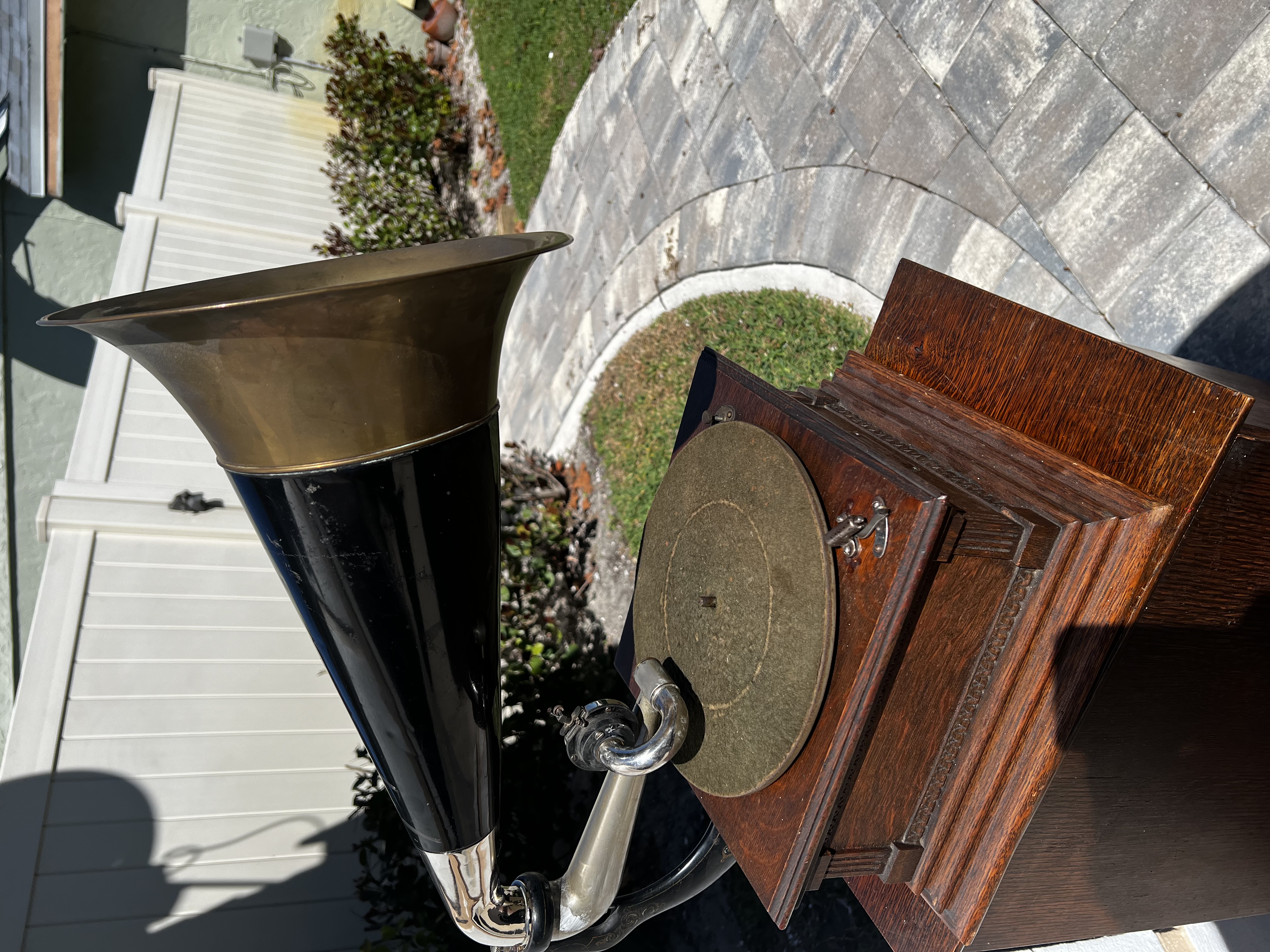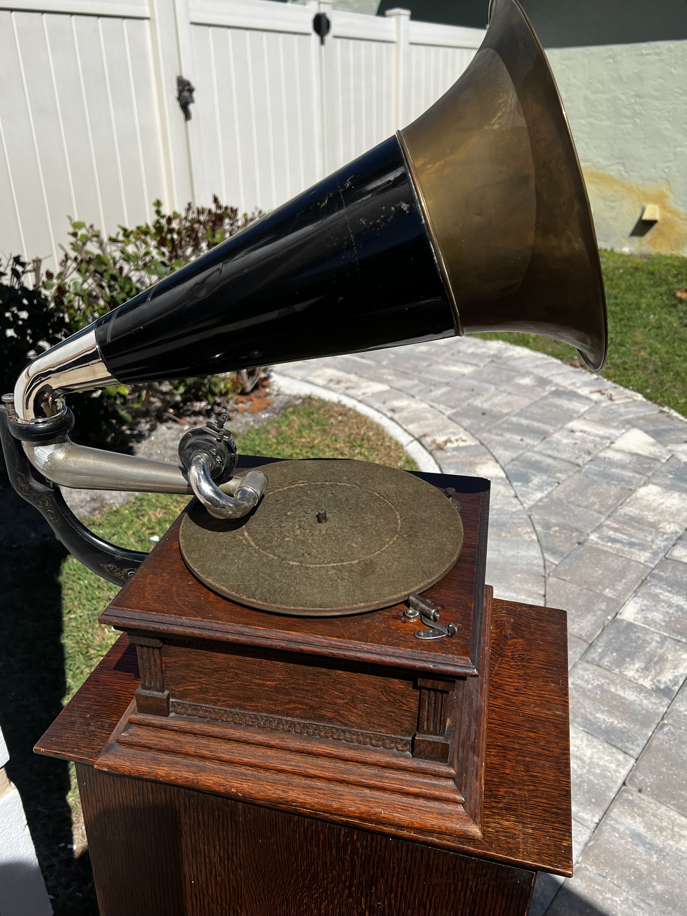 I’m offering this mostly original Victor Monarch for sale. This looks like an easy project for someone that wants to fully restore it or just clean it up and use it. The bevel gear type motor runs fine with a little thumping occasionally as the spring unwinds. The gears are all in good shape and other than the typical gear noise, which these motors are known for, it’s good to go. The cabinet finish is very dirty and the nickel finishes are worn in places but begging for someone to clean and polish. The 10” turntable and felt are original as is the backmount and mounting screws. The backmount is missing some striping as seen in the pics. The crank and elbow are reproductions. The horn measures about 11-½” in diameter and 17-½” long showing some dents that could use some help from an expert like John Duffy. The cabinet is very solid, all corners are tight and all trim is intact. Finish appears to be original but worn. There are 2 small repaired holes around the bullet brake indicating it had a different type brake at one time and someone installed the proper type later. There are also 2 small holes in the top rear part of the motor board as well as a split in the motor board not going all the way across the board just the front, should be an easy fix. Take a look at the pics. Exhibition reproducer is the later style with triangular shaped needle chuck and sounds good. If you have any questions or want to commit to buy please PM me. Payment to be with money order or personal check. Shipping will be at actual cost. I use Pirate Ship so it will be discounted charges. I’m experienced at shipping and use high quality packing materials. I’ll be selling a few more machines soon along with some parts. Thanks, Joe