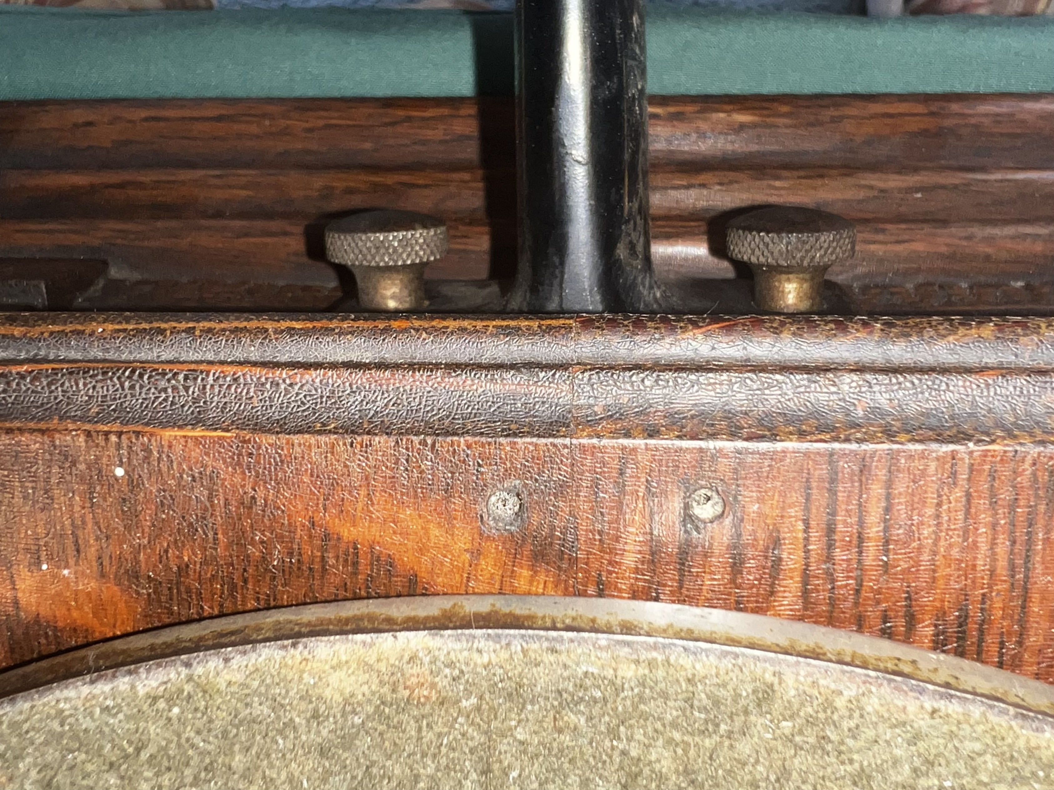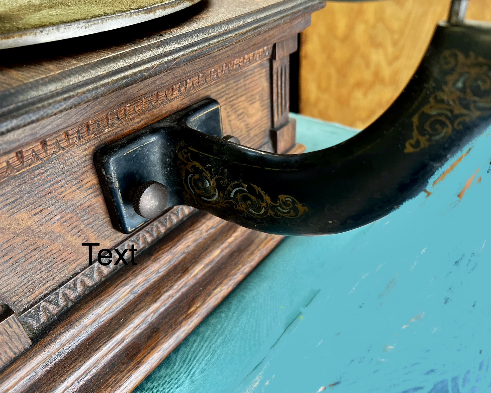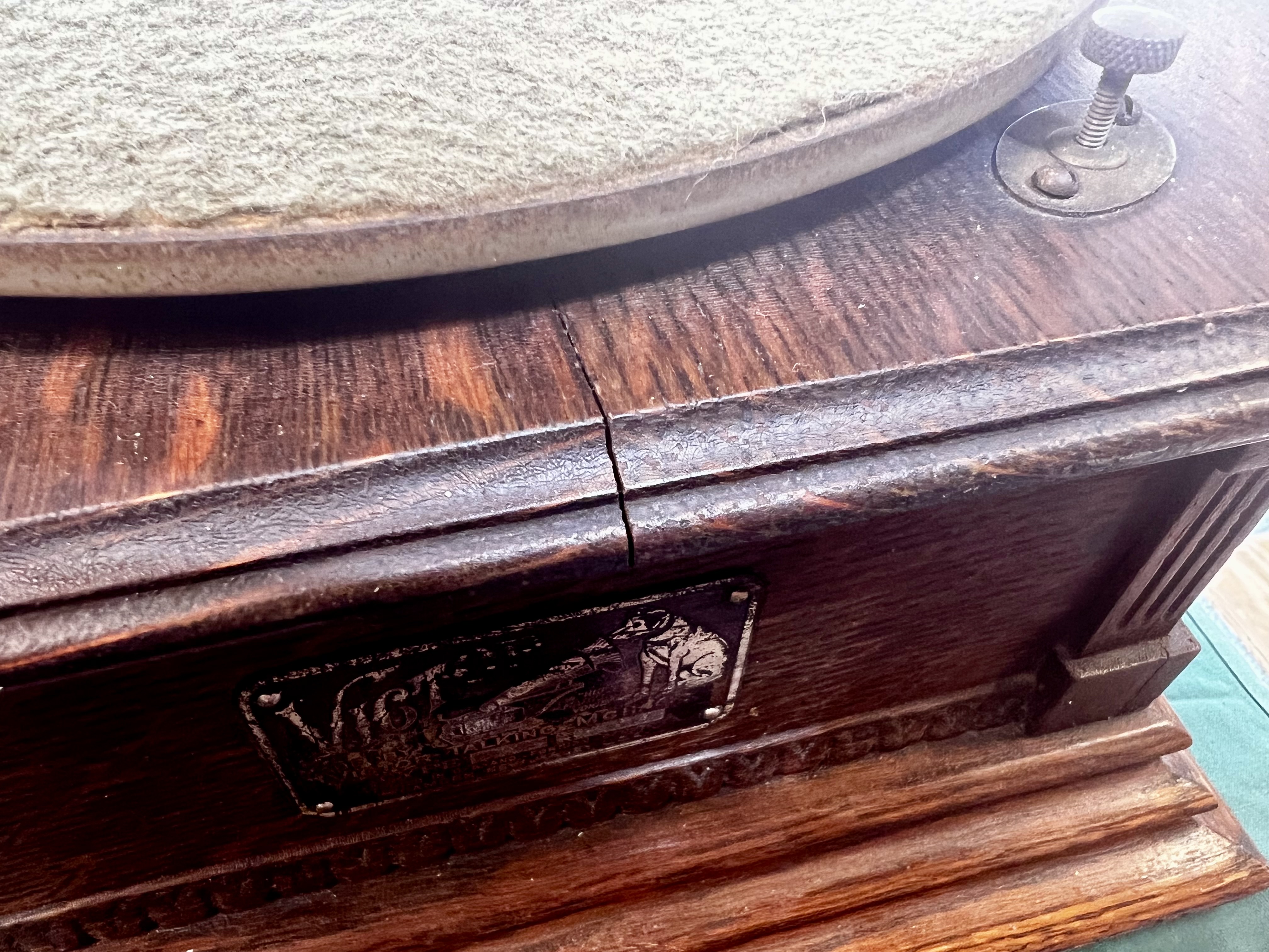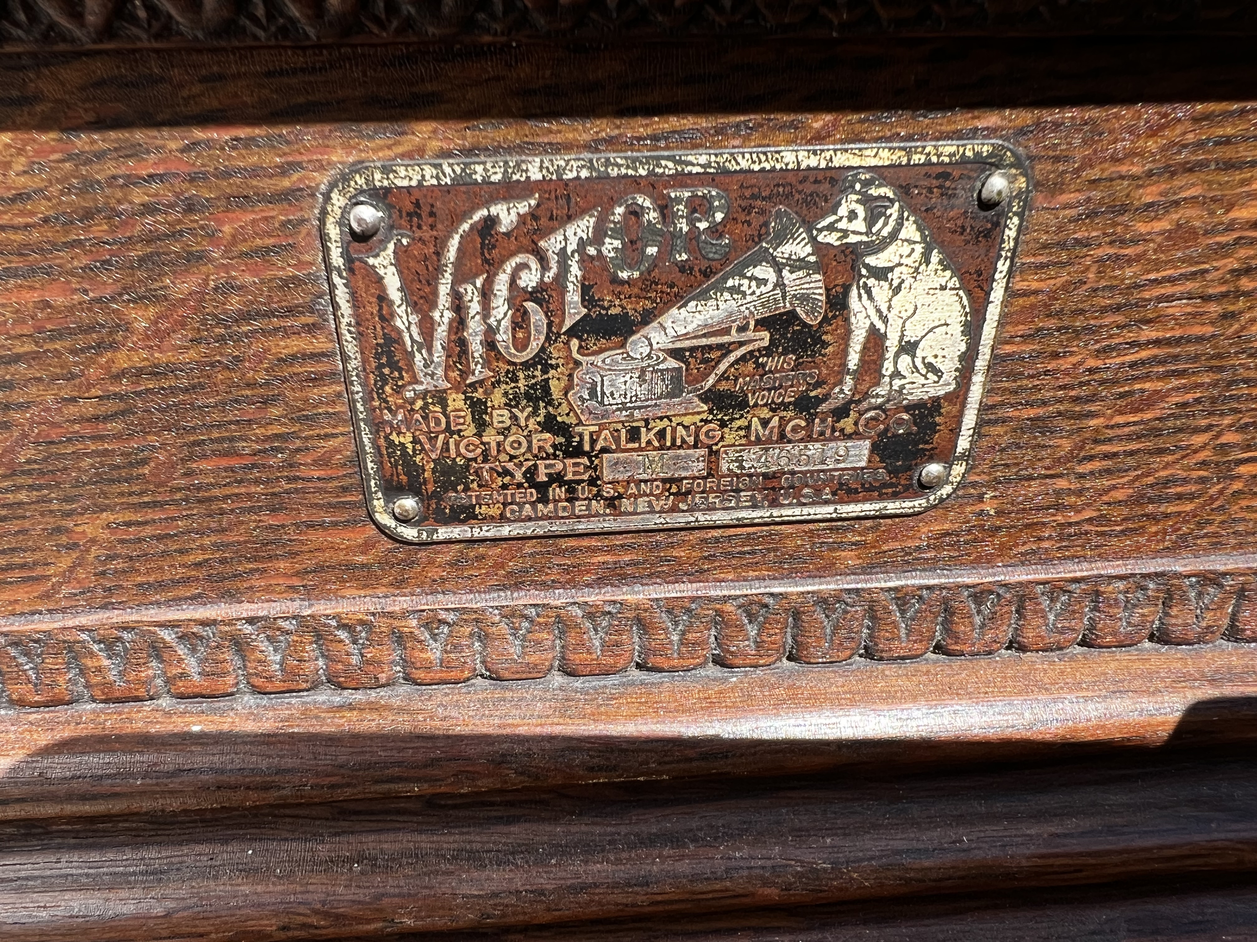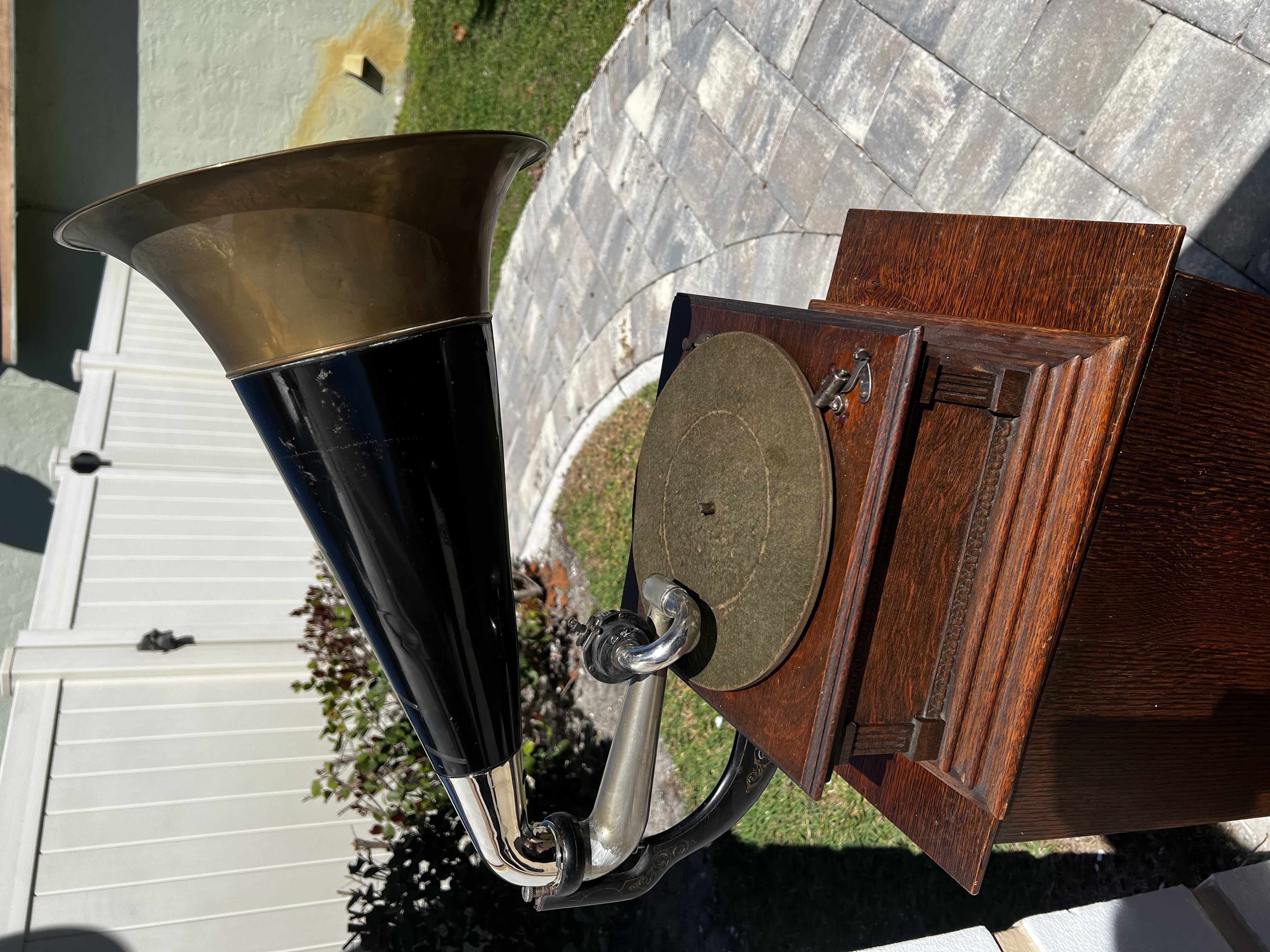 I’m offering this mostly original Victor Monarch for sale. This looks like an easy project for someone that wants to fully restore it or just clean it up and use it. The bevel gear type motor runs fine with a little thumping occasionally as the spring unwinds. The gears are all in good shape and other than the typical gear noise, which these motors are known for, it’s good to go. The cabinet finish is very dirty and the nickel finishes are worn in places but begging for someone to clean and polish. The 10” turntable and felt are original as is the backmount and mounting screws. The backmount is missing some striping as seen in the pics. The crank and elbow are reproductions. The horn measures about 11-½” in diameter and 17-½” long showing some dents that could use some help from an expert like John Duffy. The cabinet is very solid, all corners are tight and all trim is intact. Finish appears to be original but worn. There are 2 small repaired holes around the bullet brake indicating it had a different type brake at one time and someone installed the proper type later. There are also 2 small holes in the top rear part of the motor board as well as a split in the motor board not going all the way across the board just the front, should be an easy fix. Take a look at the pics. Exhibition reproducer is the later style with triangular shaped needle chuck and sounds good. If you have any questions or want to commit to buy please PM me. Payment to be with money order or personal check. Shipping will be at actual cost. I use Pirate Ship so it will be discounted charges. I’m experienced at shipping and use high quality packing materials. I’ll be selling a few more machines soon along with some parts. Thanks, Joe
