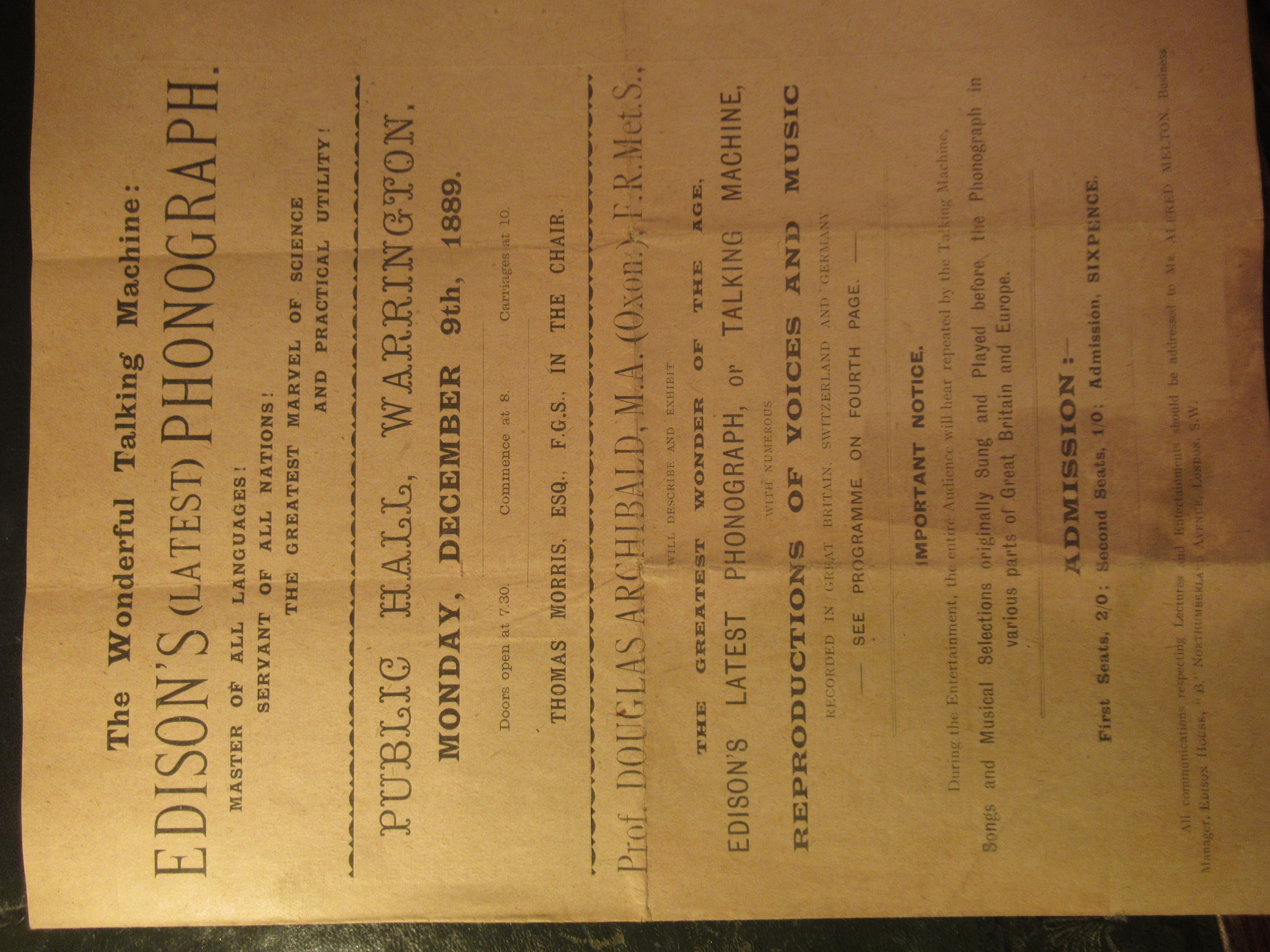 I recently acquired this programme from December 9th 1889 for a public demonstration of "Edison's (latest) Phonograph" in the Public Hall , Warrington. While it is all very interesting, there is something I have never come across before.....The talk on how the phonograph works begins with "The Chinese Legend of the Bamboo Phonograph". I assumed Google would tell me something about an early Chinese invention which used bamboo to reproduce sound but it came up with absolutely nothing !