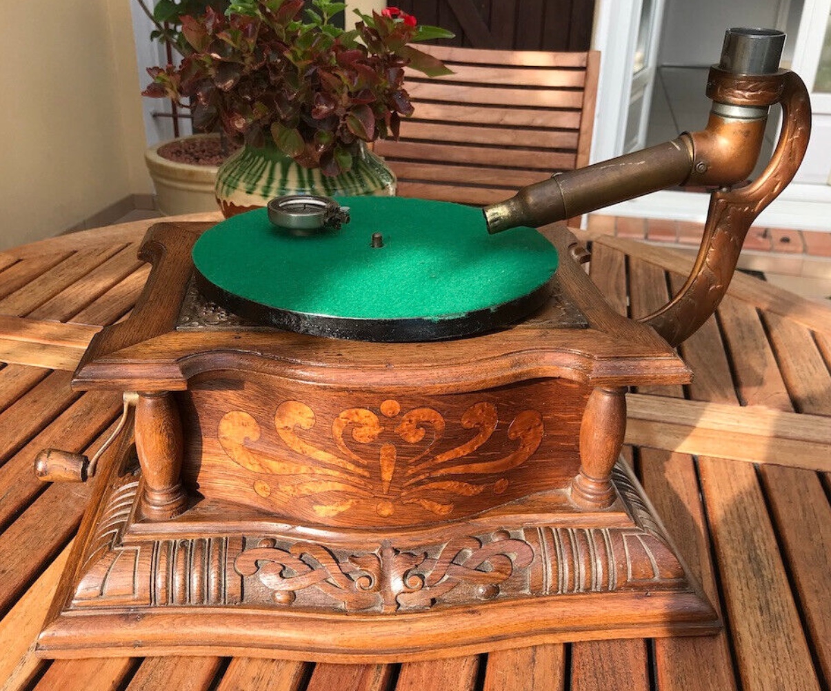 This interesting and rare Zonophone, the Grand Opéra De Luxe created in 1904, is presented in the catalog of that date as the most luxurious and expensive of the brand's models. This example, initially equipped with a floating brass bell, was modified after 1904 to provide it with a stem and an acoustic arm similar to those of a Gramophone in order to make it more maneuverable. The phonograph is working. It is offered without a horn, with an unbranded player and a Zonophone player. Note that the Swiss-made engine is not the original one and that the cruise control needs to be completed. Box dimensions: 42 x 35 x 20 cm Weight: 15 kg