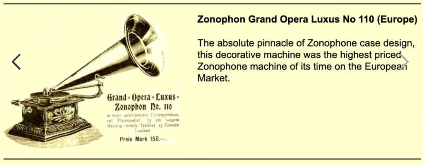yes, on the world of antique phonographs (page 76, 3-61) but it's a front mount machine with the usual zonophone horn!jamiegramo wrote: Mon Mar 04, 2024 5:25 pm Note I remember: I’m sure a similar Grand Opera Luxus 110 machine is also pictured in one of the Fabrizio Paul books.