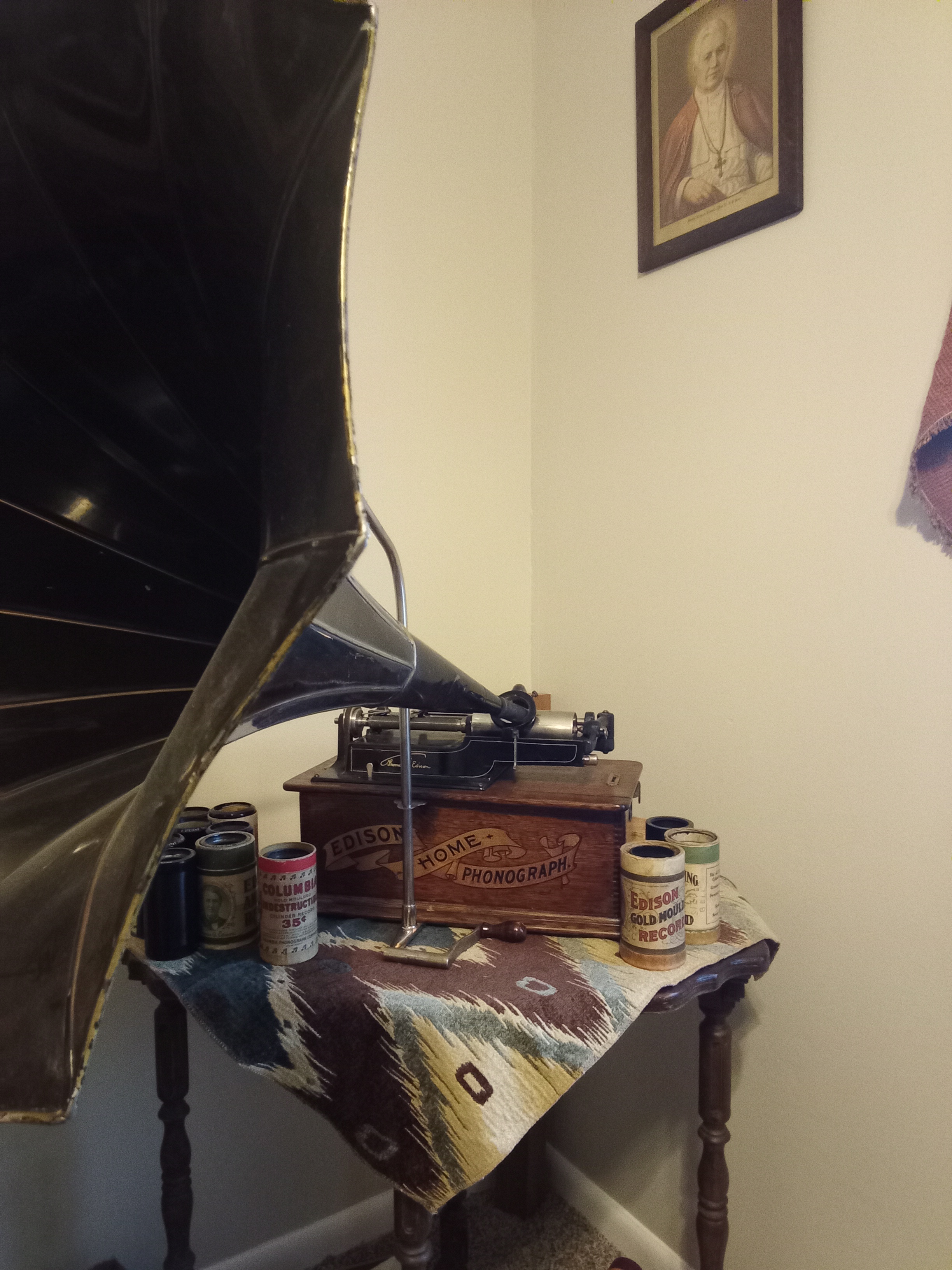 Home B for reference. Sitting on a radio table from the 1920s in the corner of my library/office/record mausoleum/disaster area as Pope Pius X looks on disapprovingly from his lithograph on the wall. I recommend antique prints as you can acquire a king, president, pope, movie star, mythological figure, or anyone really for about ten dollars. On the radio people who have "bought a congressman" have to pay lots more and and Emily Post would say it's not nice stapling them to the wall for decoration.