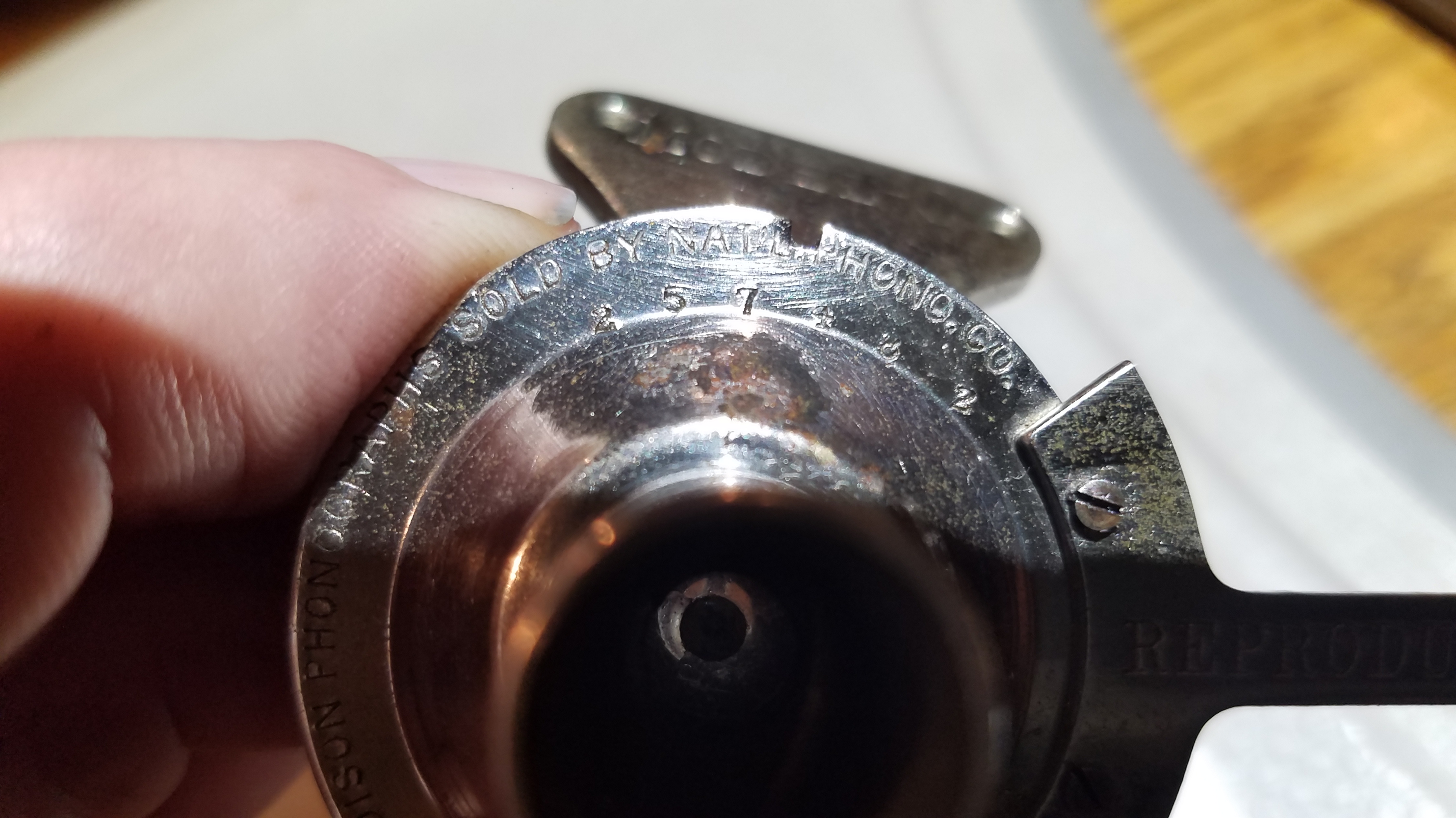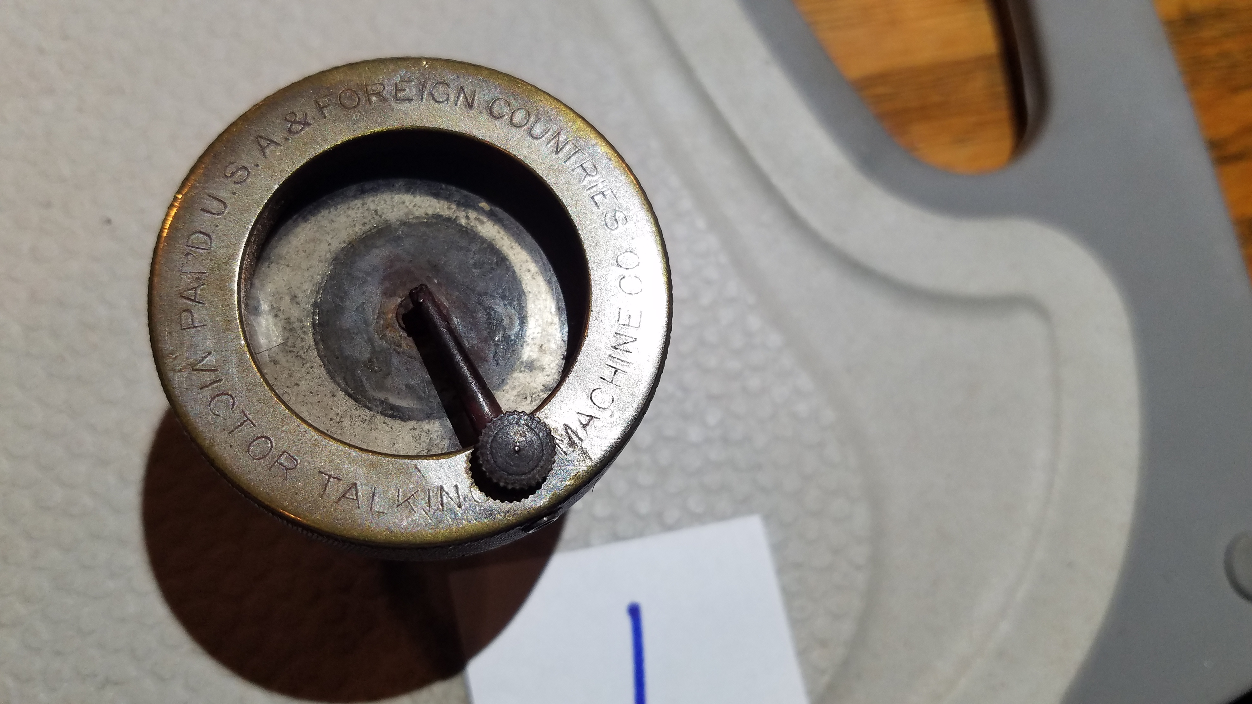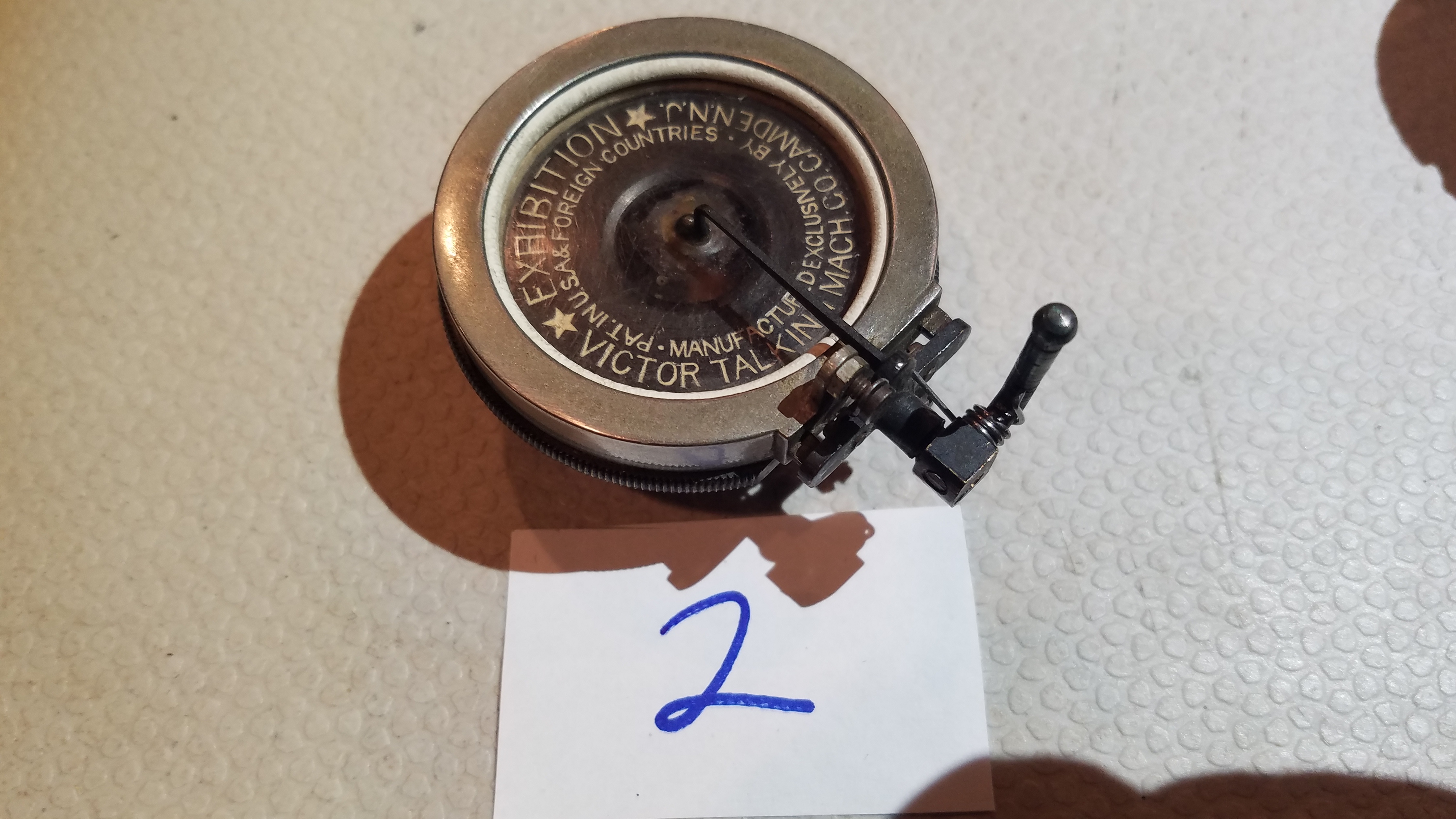 4) Edison "N"- **Custom adaptation**- This was purchased from a friend. He had asked Steve Medved to adapt this "N" to play 2-minute records with a large diaphragm. Please look at pictures. Instead of a 4 minute stylus, a 2 minute "C" stylus was mounted. Steve labled it as "2 min" --he overhauled the diaphragm and gaskets. He also patched a couple rim chips (see pics). Plays great-- If you want a large-diaphragm reproducer for 2 minute records-- without the expense of an "S" or an "O", then here it is! :) -new price= $175