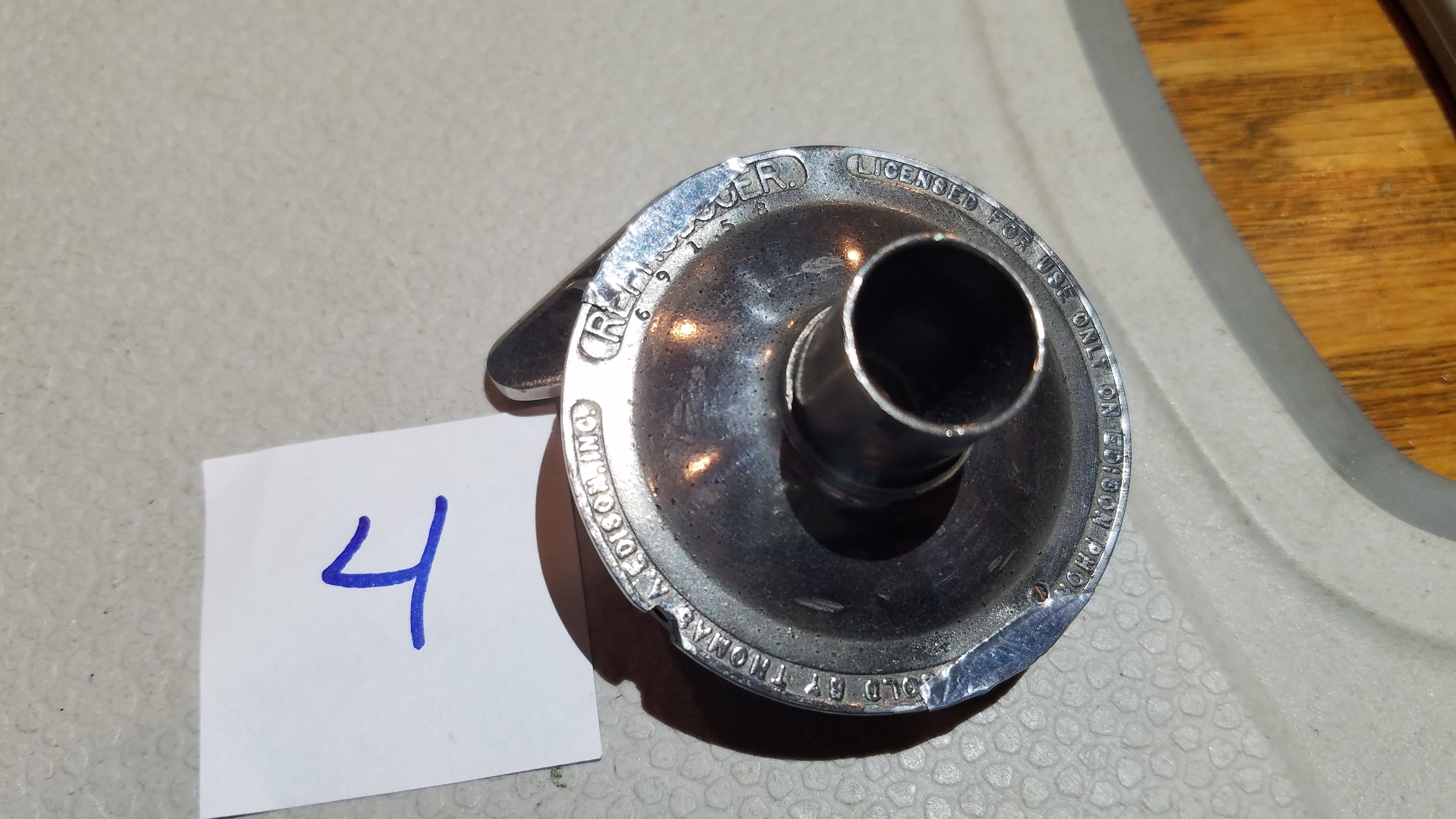 1) Moved to Ebay- Victor Concert Long Throat-- All original-- Plays quite well. Has not been rebuilt, but play tested and sounds good. Original needle bar and link are intact. Connecting tube has been cleaned down to the brass (but that's covered up when mounted on a machine) new price= $195 2) SOLD--Lever-style Exhibition-- Very nice condition-- Rebuilt-- New gaskets and back flange. Good Nickle plate. Original lever was badly worn and non-functional. A talented forum member (Ken Brekke) fabricated a new lever that is identical to original. Works great. - $175 3) Moved to Ebay-- Victor "O" -- Specially made Exhibition with one-piece housing. Used on the "O" and I believe on the very early VV-IV, but others can chime in to verify that. In nice shape-- New Gaskets and has been adjusted. Original diaphragm is tinted. Plays well. - new price= $150 4) Edison "N"- **Custom adaptation**- This was purchased from a friend. He had asked Steve Medved to adapt this "N" to play 2-minute records with a large diaphragm. Please look at pictures. Instead of a 4 minute stylus, a 2 minute "C" stylus was mounted. Steve labled it as "2 min" --he overhauled the diaphragm and gaskets. He also patched a couple rim chips (see pics). Plays great-- If you want a large-diaphragm reproducer for 2 minute records-- without the expense of an "S" or an "O", then here it is!