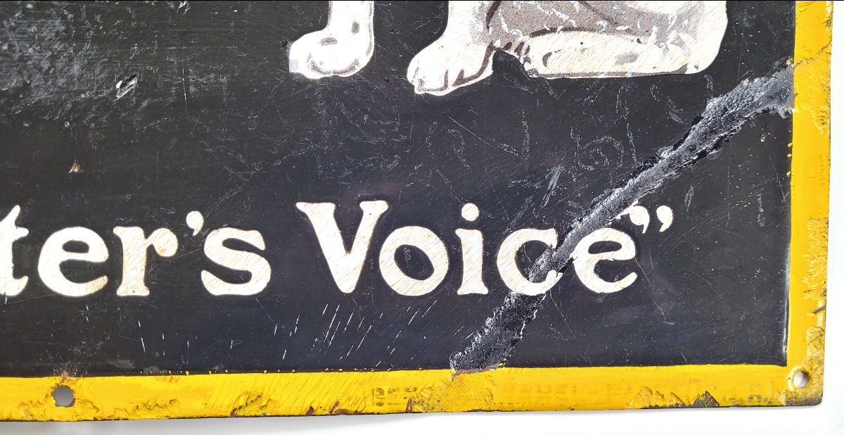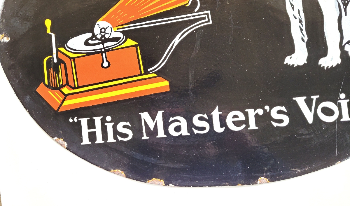 For sale are two single-sided porcelain metal signs featuring the "His Master's Voice" Nipper trademark.