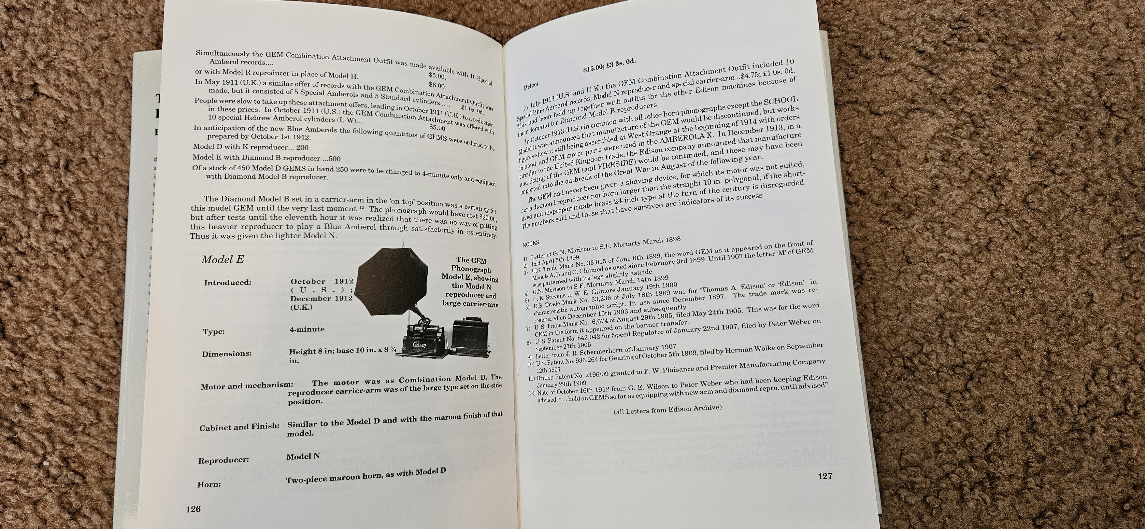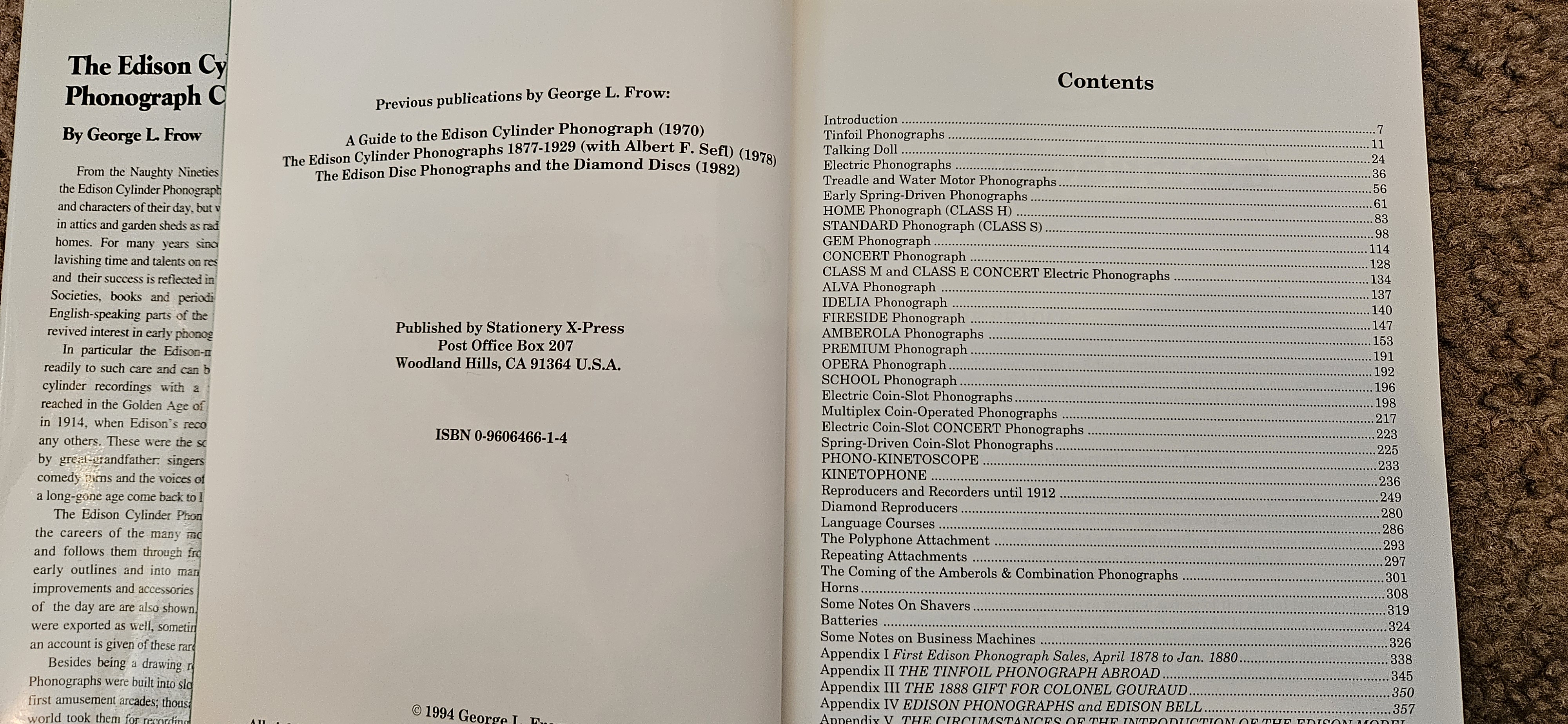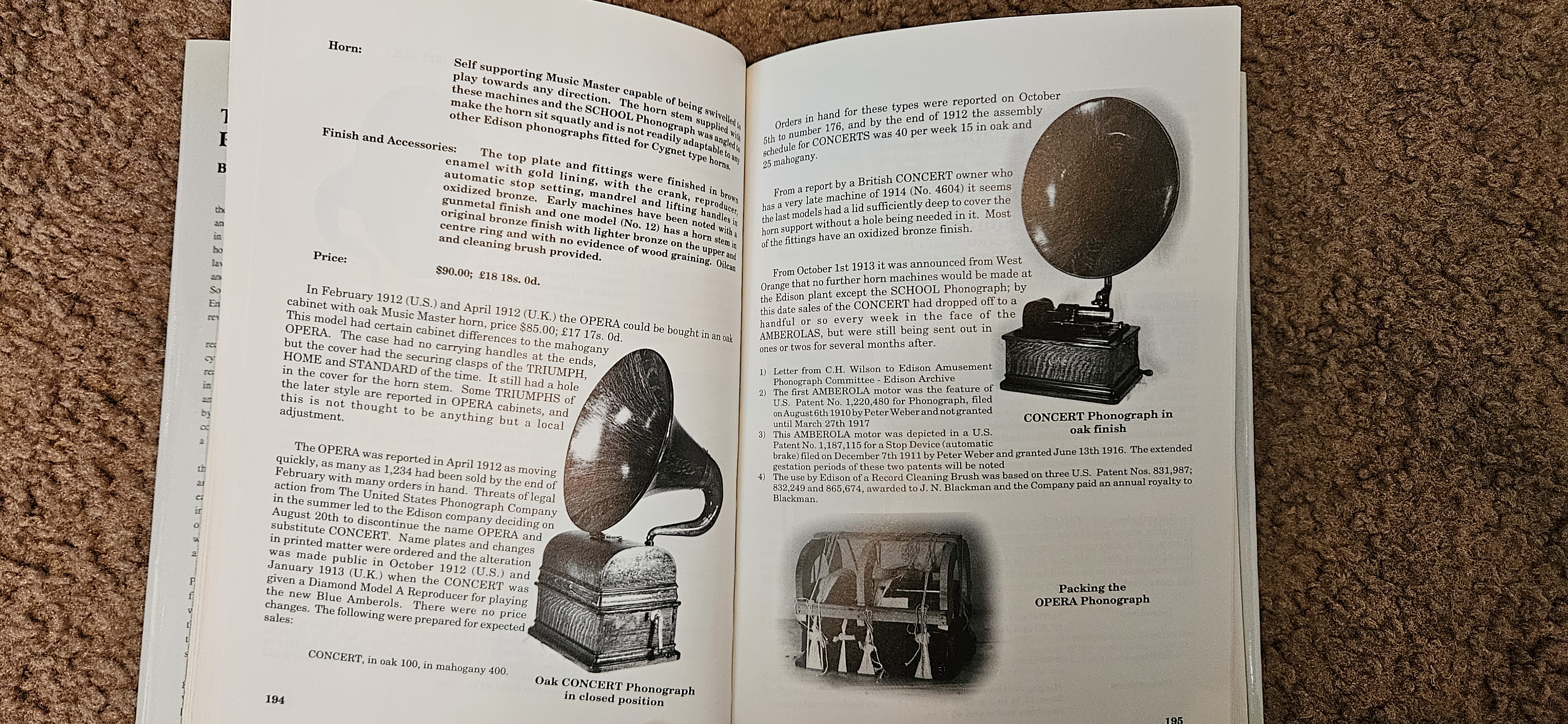 This book is a must have if you don't have it and are interested in learning about Edison cylinder phonographs and accessories. It's a great resource to learn the approximate date of manufacture, difference between all the models, and all the reproducer models available and so much more.