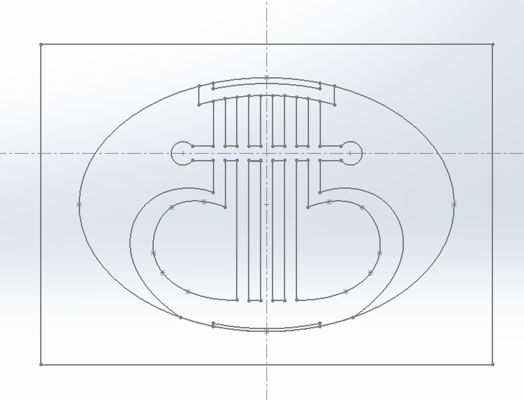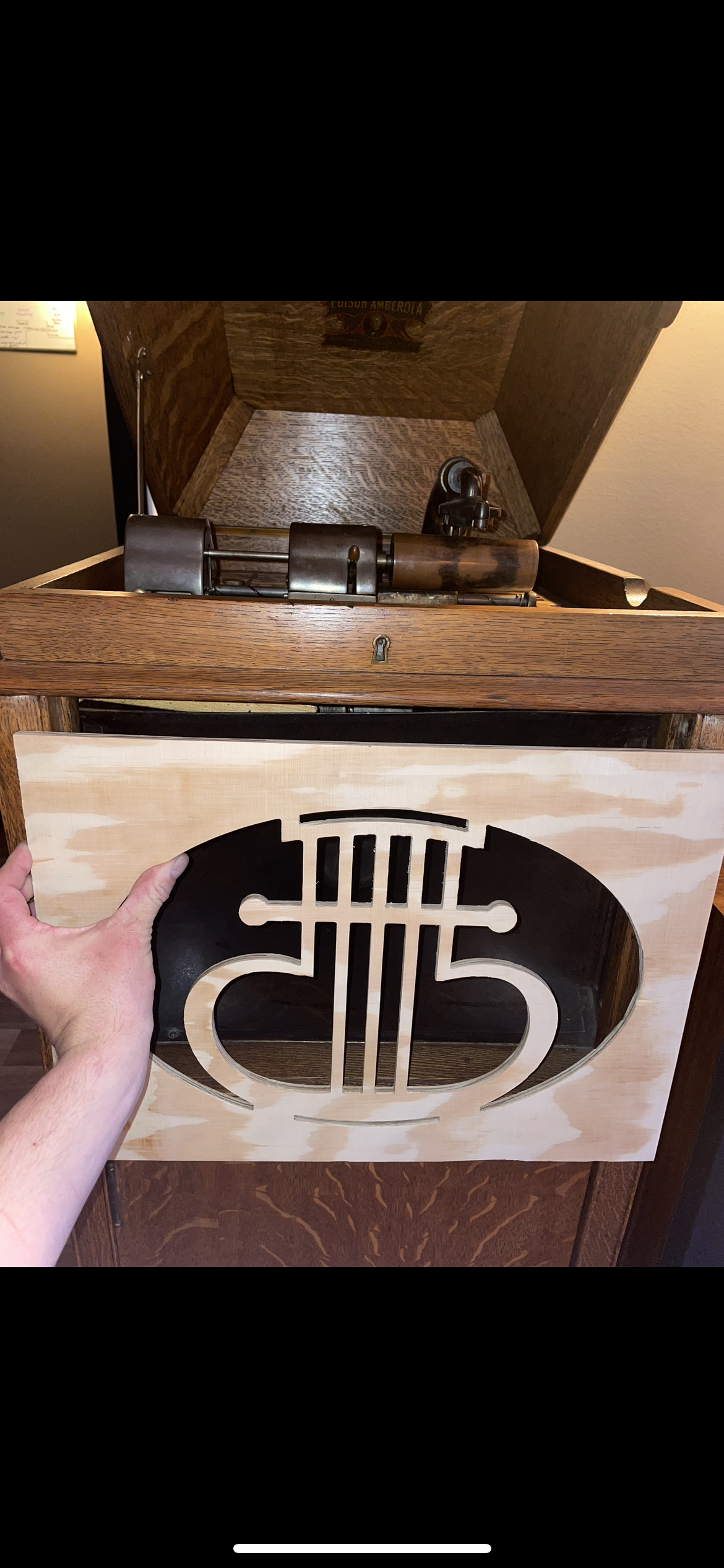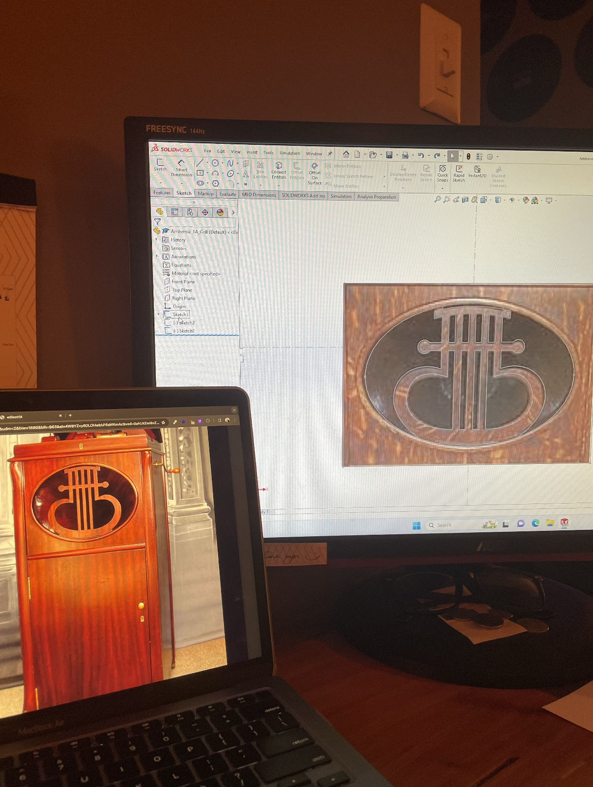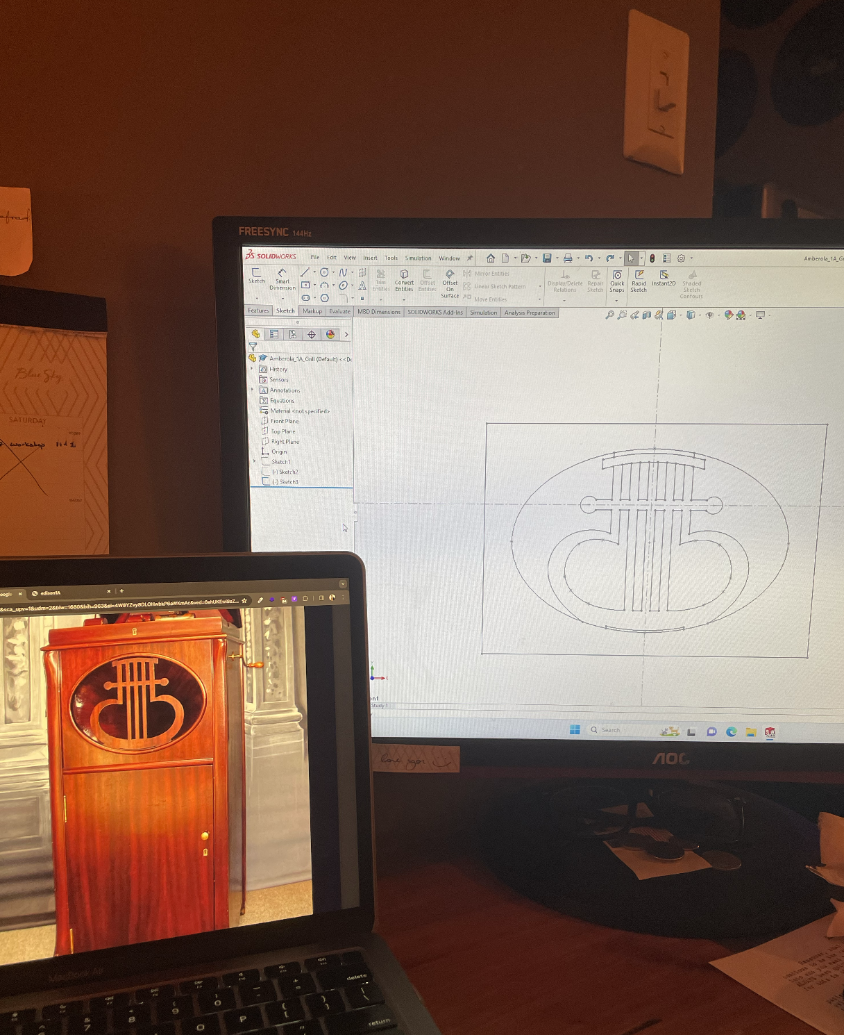 I ended up using the best straight on photo I could find of a lyre grill on the internet; and used it to model the grill in Solidworks. I re-sized the photo in Solidworks to match the opening in the cabinet. This should get all the measurements to really close. I can then export this file and use it on the CNC machine to cut the grill out exactly as I have modeled it. Of course I won't have 90 degree corners, but I will carefully fix those with a chisel after it is done on the CNC. Still figuring out how I am going to make the oval trim piece....