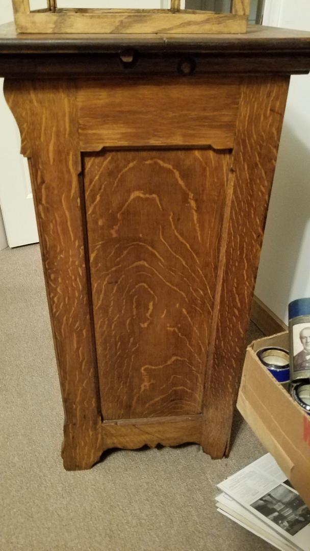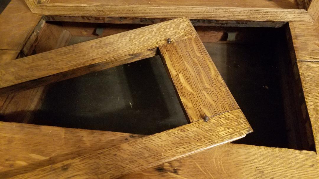 The oak top frame (for the glass) was made by a woodworker friend about 20 years ago. He copied the frame pictures of an original frame that I provided him. It will need hinges to attach to the cabinet.
