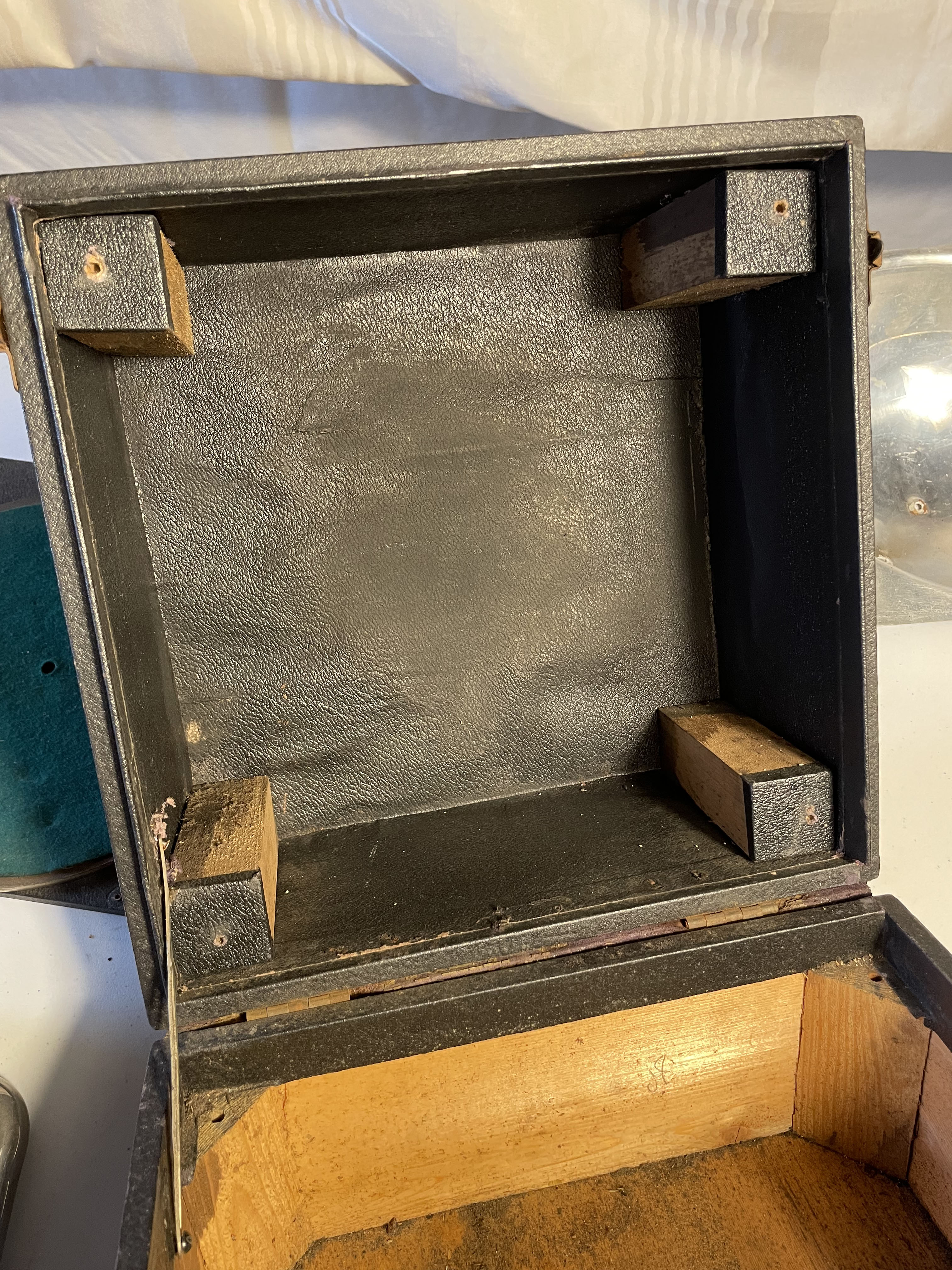 - The case is a black leatherette (textured resin on cloth) covering thin plywood or possibly fiberboard.