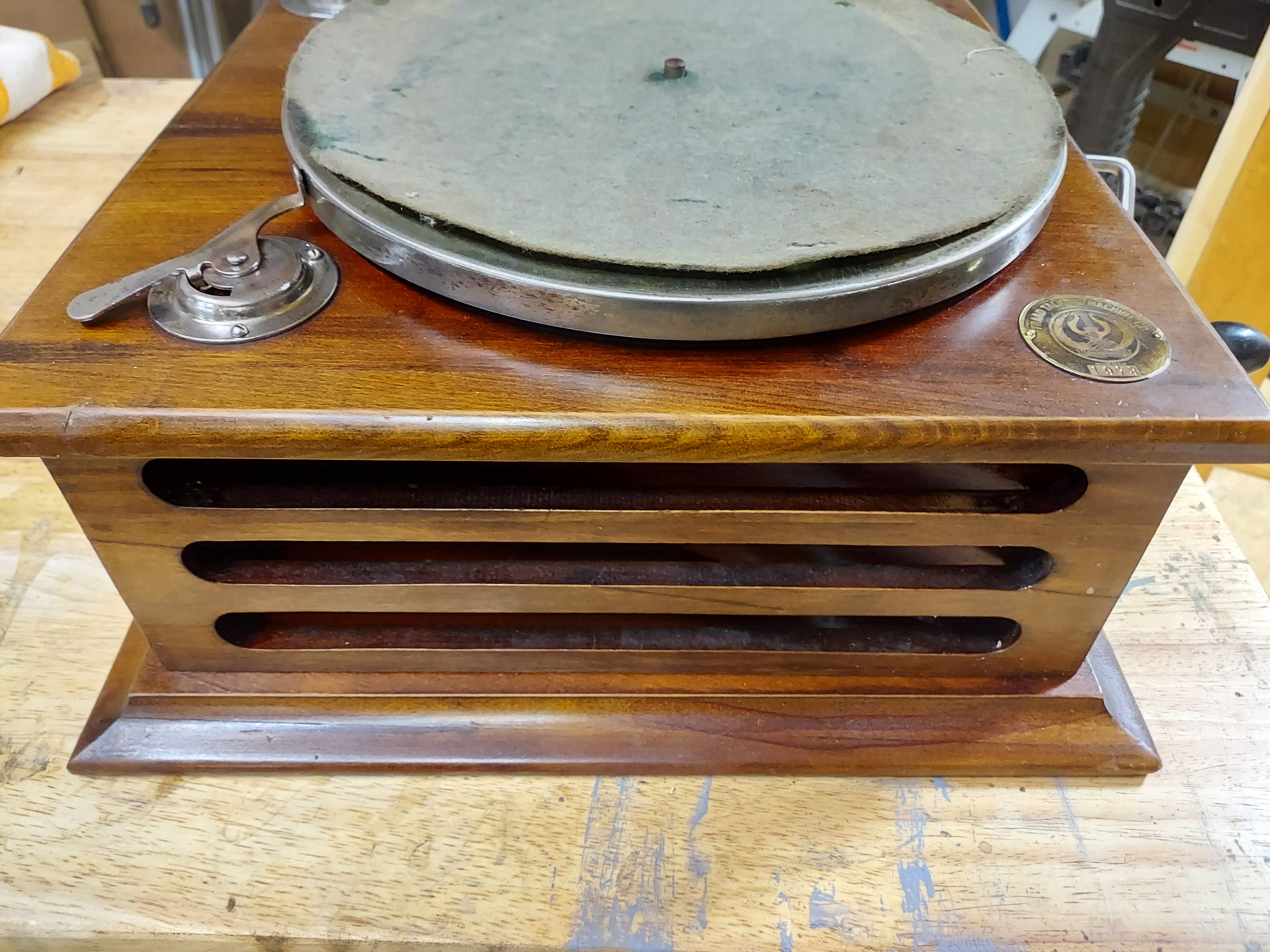 I picked up a lidless tabletop phonograph from the Fraad Talking Machine Company. The tag says the model is the Symphony. Serial number is 1978. I can't find much of anything about it. Unfortunately it did not have a tonearm or reproducer so I'm not even sure what I'm looking for.