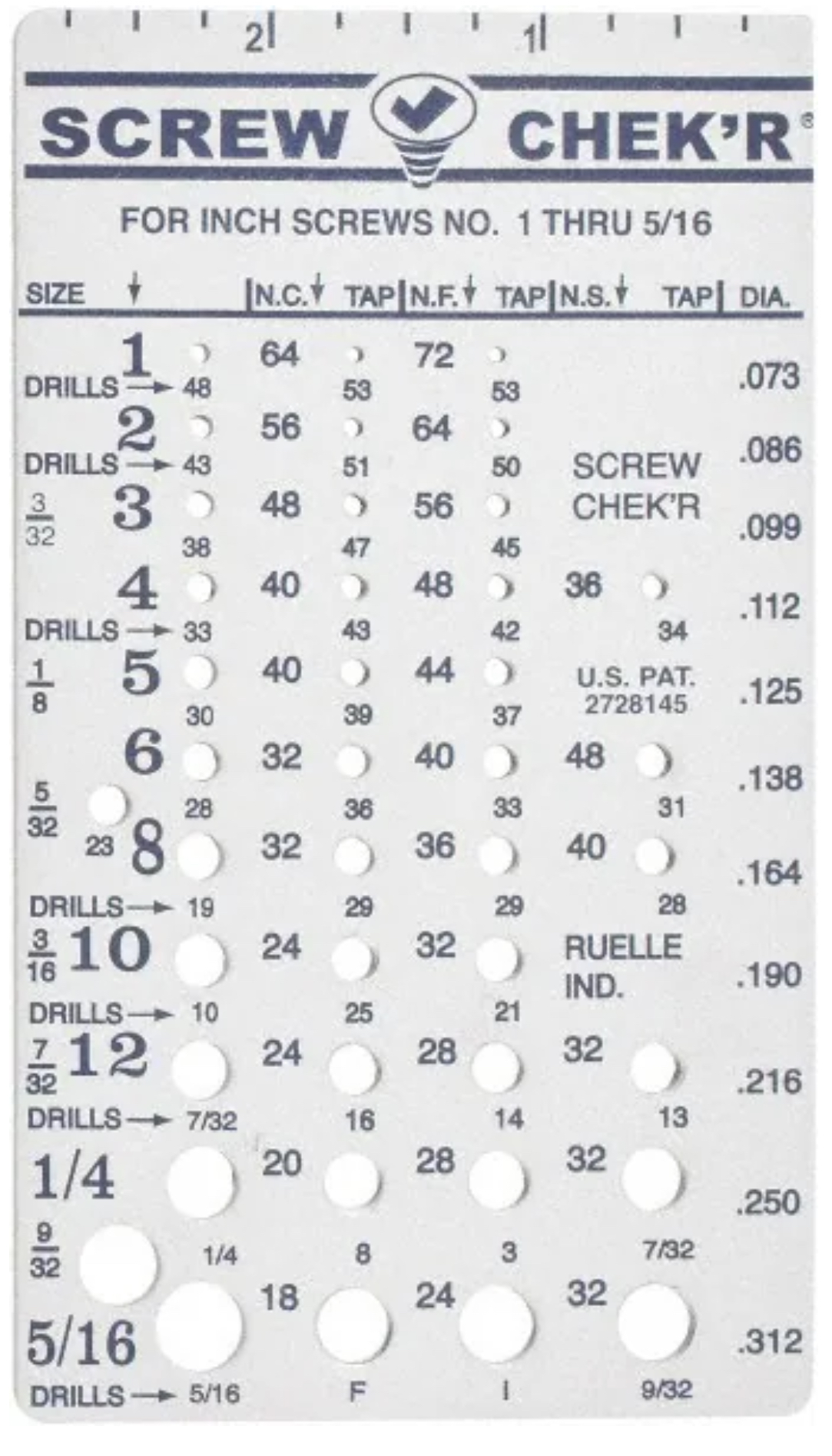 Thanks for the comprehensive screw size chart, it is nearly overwhelmingly complete. It doesn’t describe the various thread forms (Whitworth, Waltham, Acme, etc) but it lists what they are so they can be researched. In order for a screw to fit, the major diameter, pitch or TPI and thread form all must match. Fortunately the common fasteners on our machines are typical 60 degree NC, NF or NS Vee type threads.