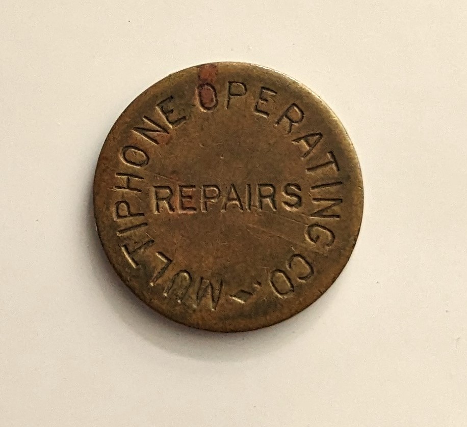 Here is an amazing piece of History. It is a token for use in the Multiphone from the Multiphone Operating Company. These tokens are almost impossible to find. What is even cooler, is this one is marked as a repair token. Used by a technician, this token would test out a Multiphone after repairs in the field. I've only seen one other!! Super cool and exceedingly rare! If you own a multiphone, you need this token!! What an awesome display piece either way!! The front an back of the token are displayed below.