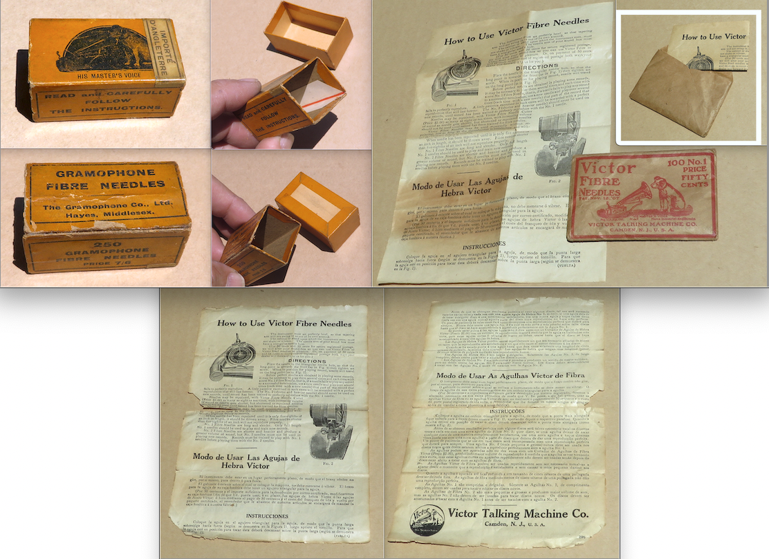 23) HMV Fibre Needle Box (reinforced edge), Victor Fibre Needle Envelope with instruction sheet, and extra instruction sheet $15