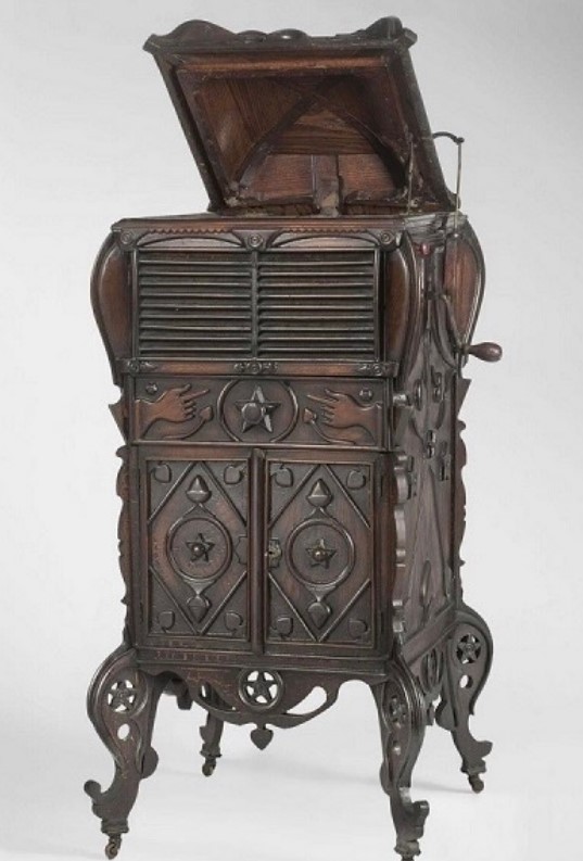 "The elaborate phonograph cabinet which he created is in the permanent collection of the Philadelphia Museum of Art.[2] Made for personal use, it is estimated to contain more than 300 pieces of wood. The carvings combine emblems from Southern folk art such as hands, hearts, vines and stars, with stylized versions of the Victor Talking Machine's dog mascot Nipper. It was even mentioned in his obituary."