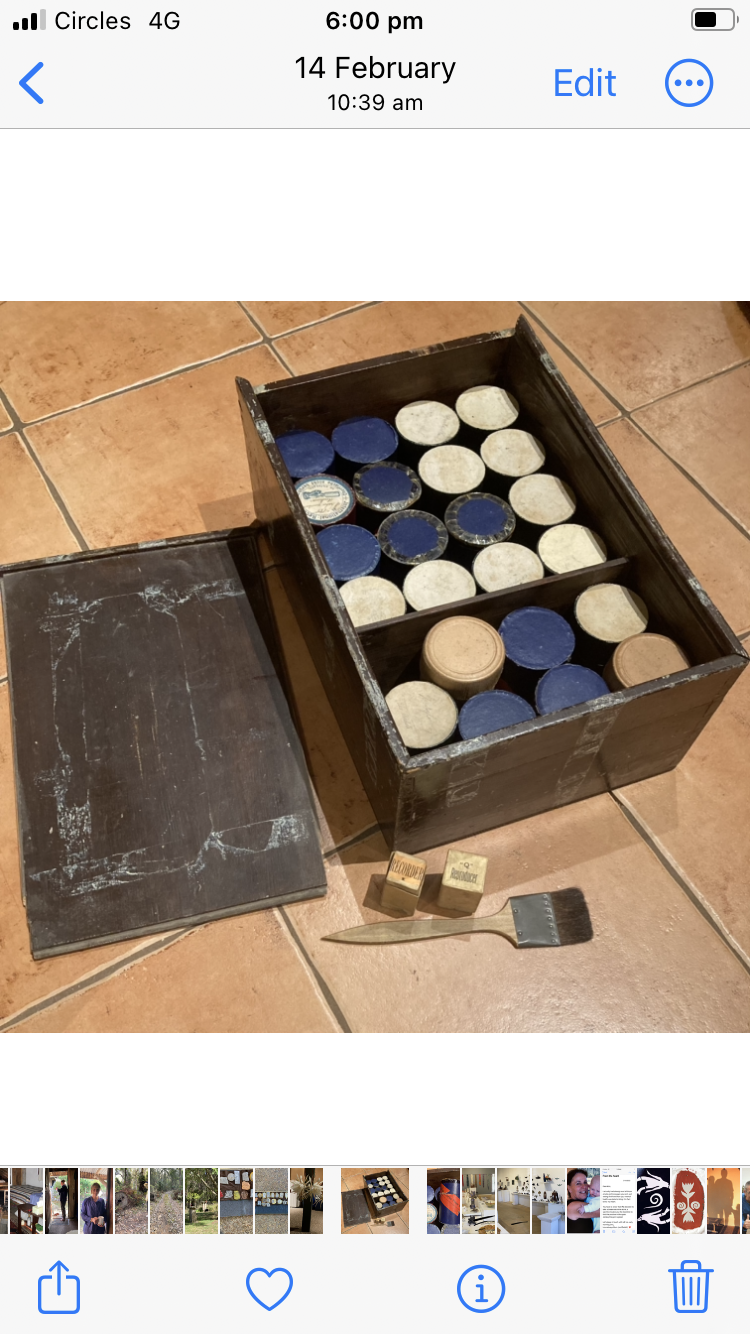 Filled wooden storage box, reproducer, recorder and brush