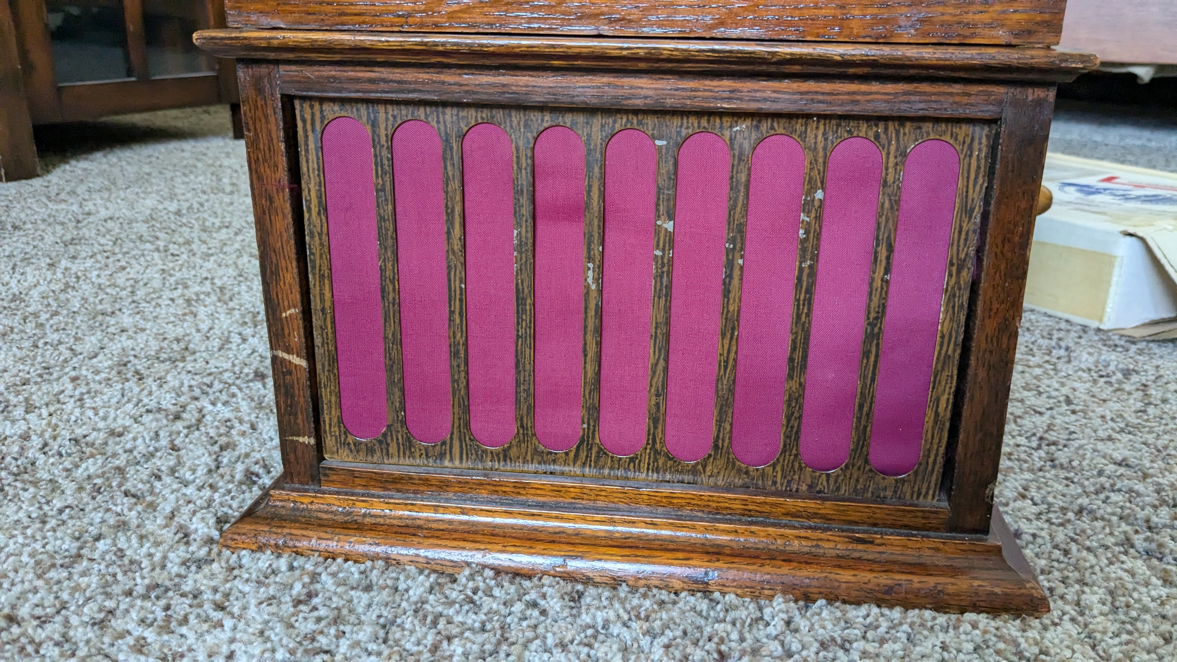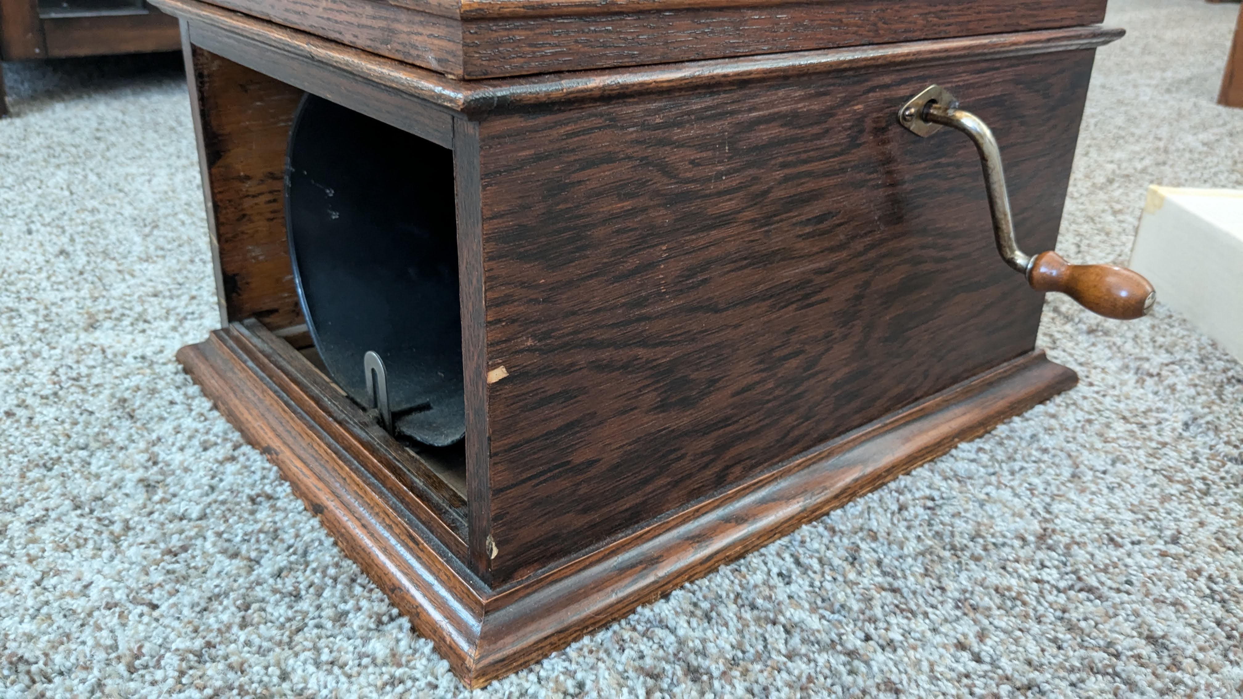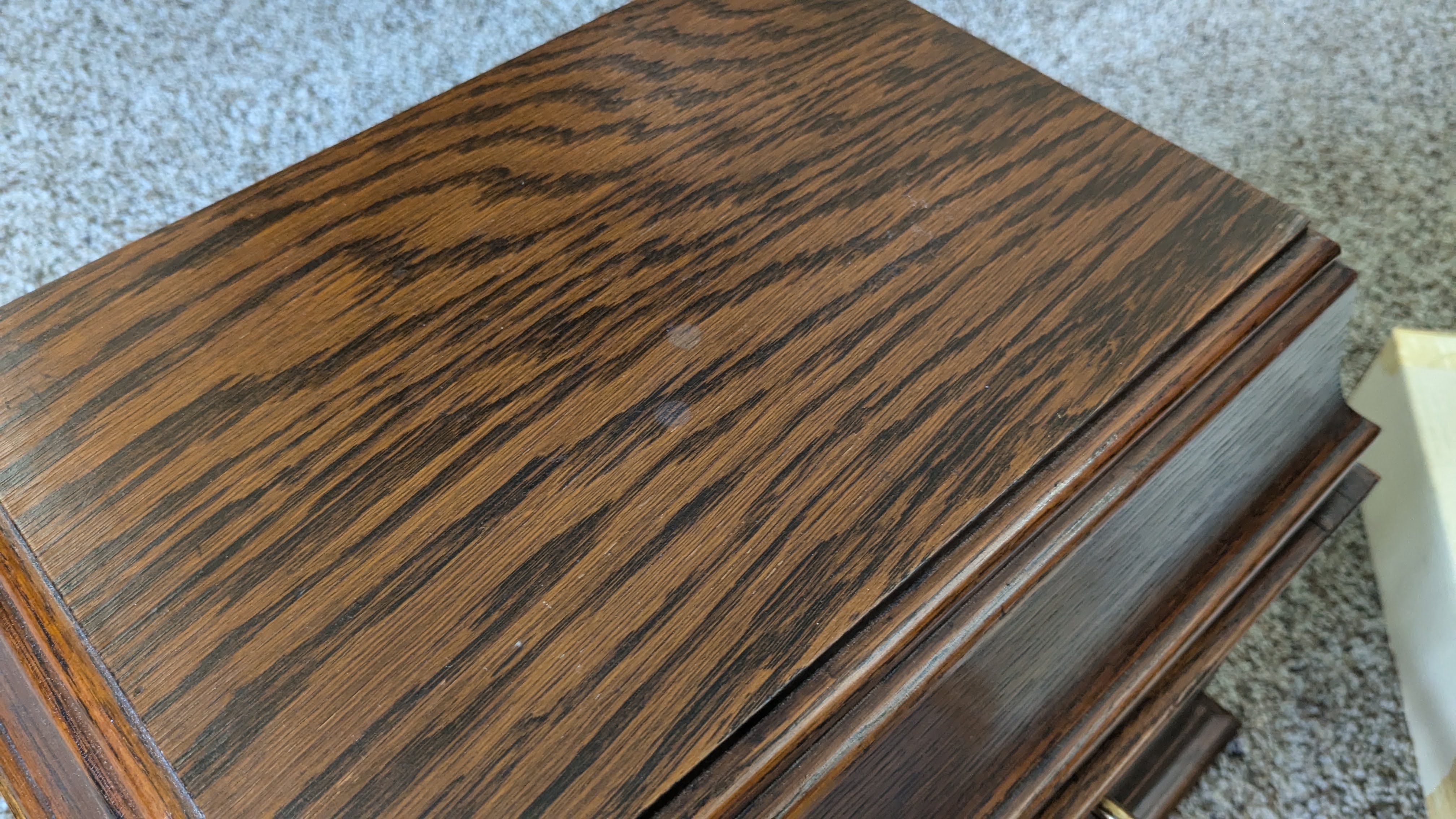 - Some minor blemishes on the oak woodwork. I tried to capture them in the photos. The worst is on the handle-side of the housing where a small piece of the wood is chipped out right on the edge. It is smaller than a pencil eraser in size. I'm not a woodworker, but I'd think this could be repaired quite easily. The rest are just blemishes in the finish, including two water spots on the lid.
