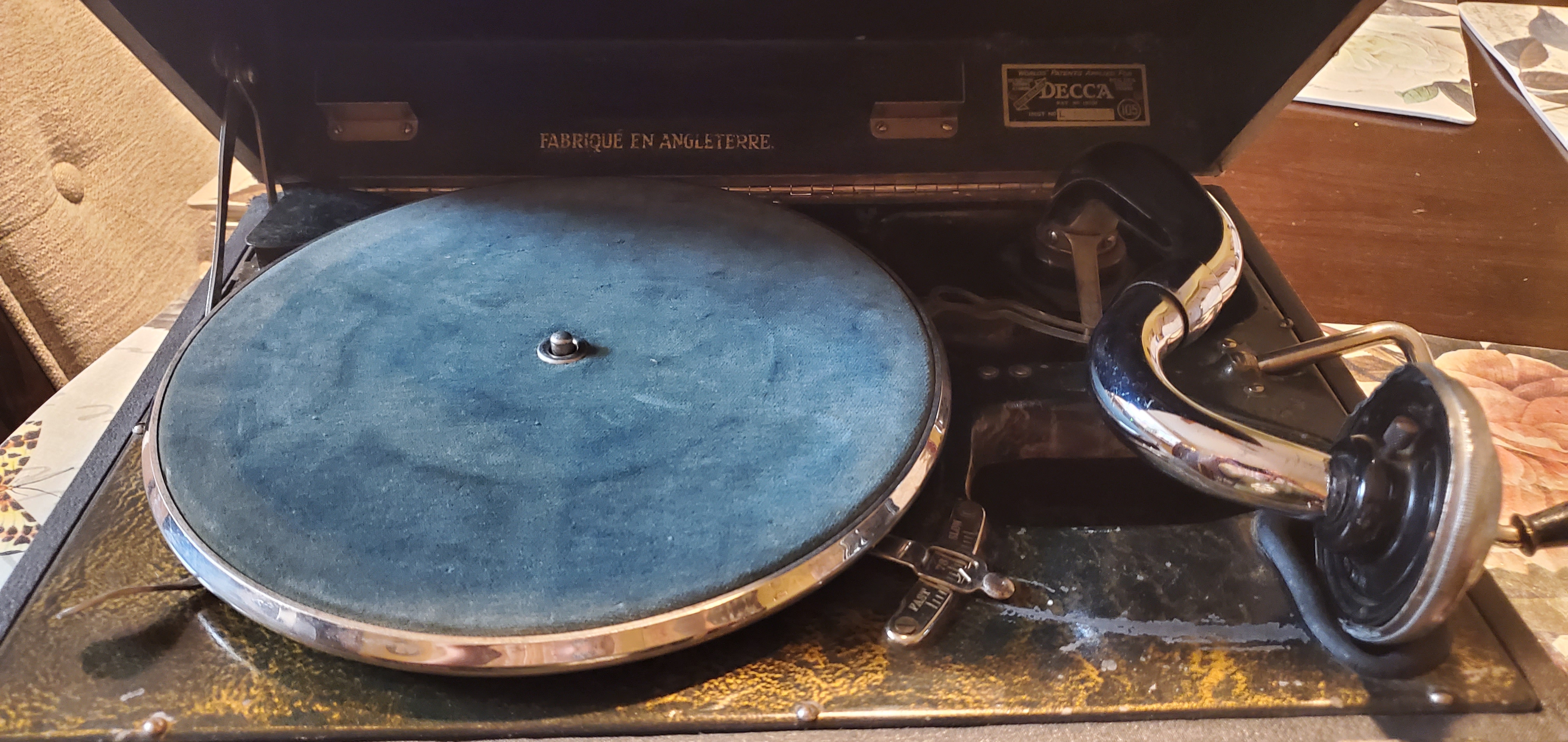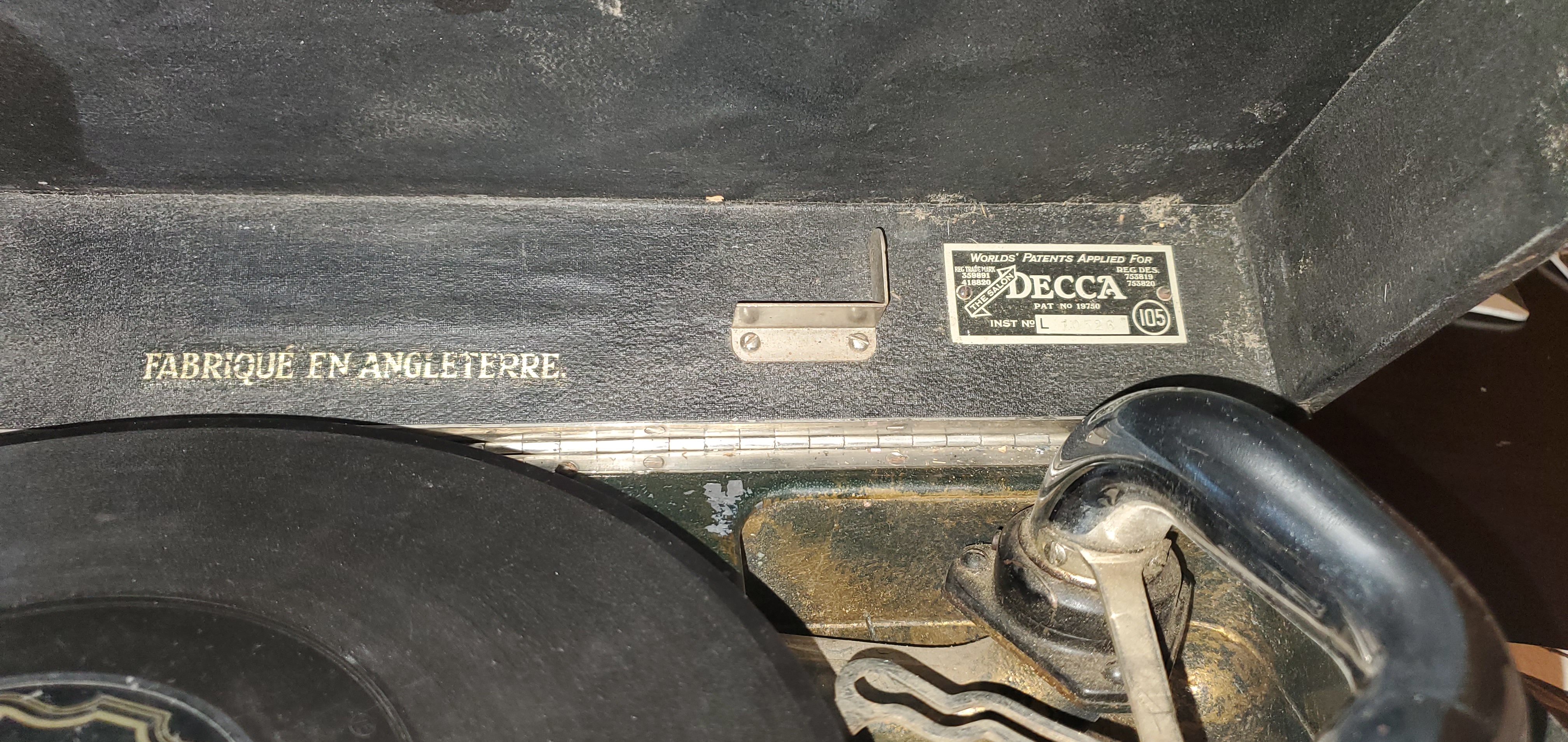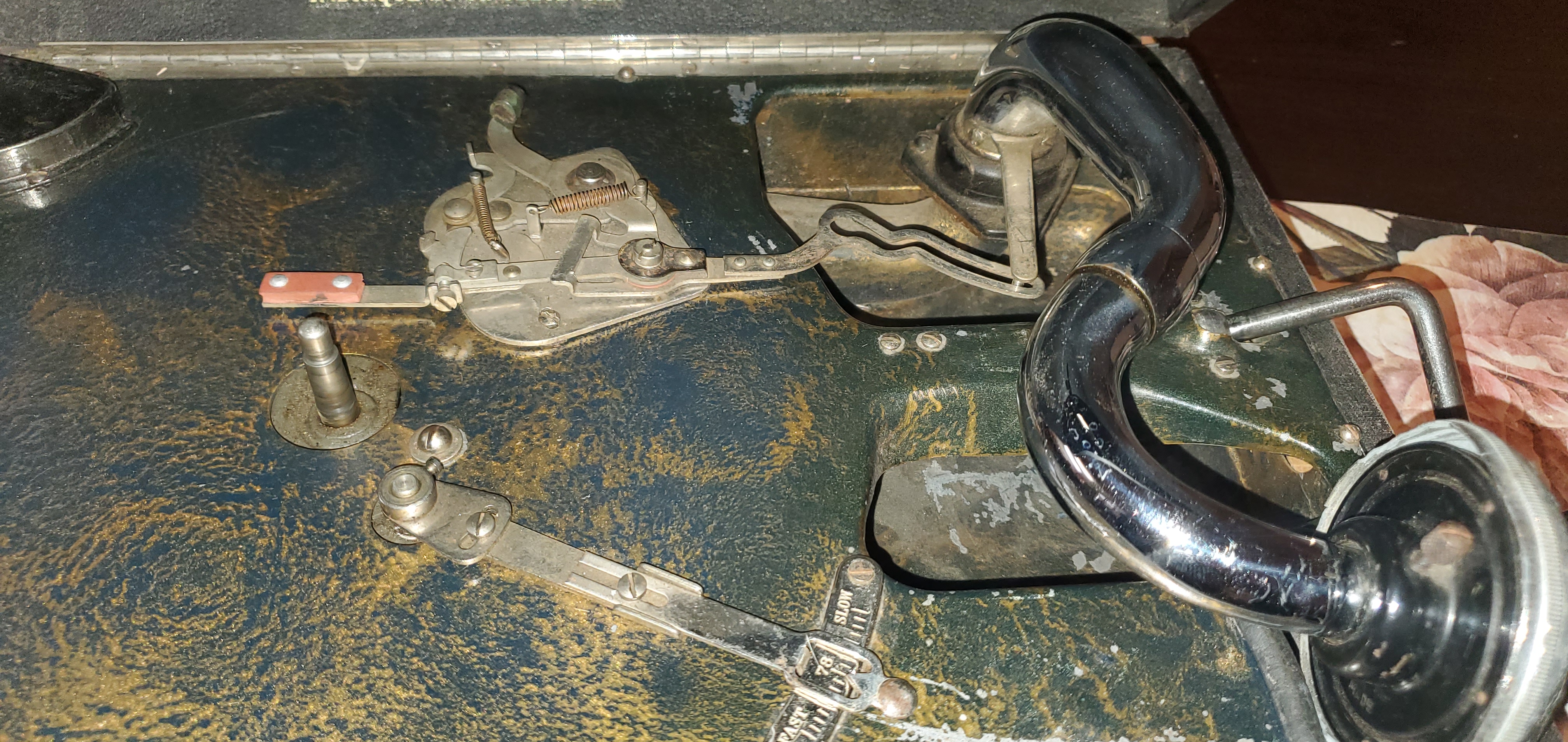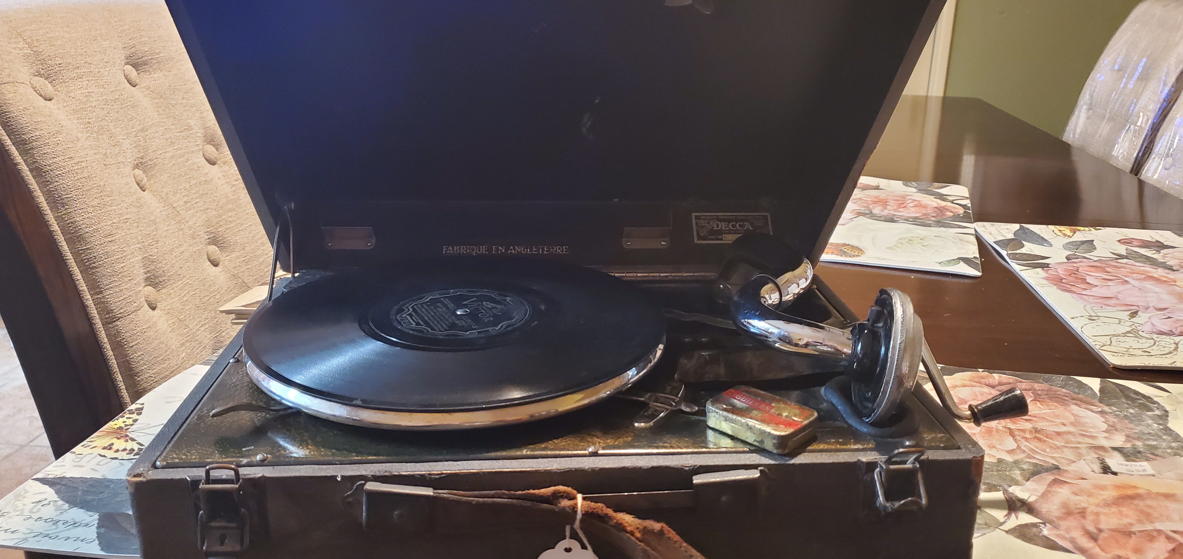 I was shopping a antique store in Yuma, the temperature was over 110 and on the side where all the furniture is displayed I found a DECCA portable phonograph. The tag said it didn't work and the price of $25 reflects it. The wife is most of the time very understanding but this time she showed her disapproval. $25 we send that at Starbucks so I took it home. After some trial and error I figured it out and it was playing very good. I can't pass on a odd phonograph especially if it has a low price. The reproducer is in bad shape but it still plays really good. If anyone has information on this phonograph it would be greatly appreciated. Thanks.