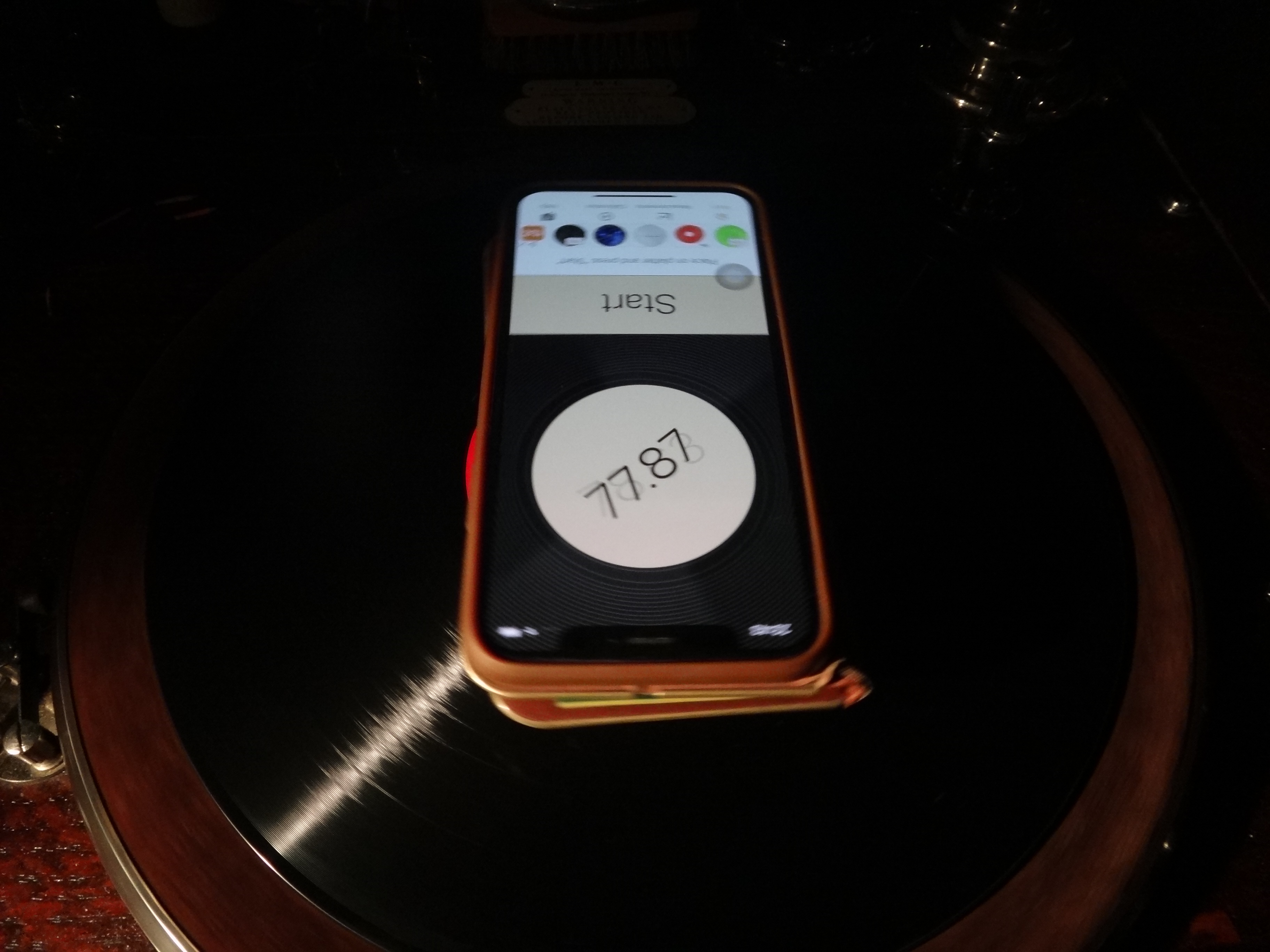 Alternatively, you can just measure the speed with your digital tachometer directly, adjusting the speed knob until correct, for each record. Note the correct speed on the sleeve or in your catalogue for future reference. If you play one record that is, say, at 76.5 (yes, Victor, this means you) and then the next one is at 80 and then the next one is at 90 (yes, Pathé, this means you) and then the next one is back to 76.5 and so on, you'll avoid lots of counting and calculations. If you don't want to put a strip of reflective tape directly on your turntable, you can apply it to the back of a dud/worn single-sided record or a cracked record of any sort and use that to do the settings. Use a small diameter record that you can set on top of another without obscuring all the playing area, like a Little Wonder, if you want to take your readings while the machine is playing to account for drag.