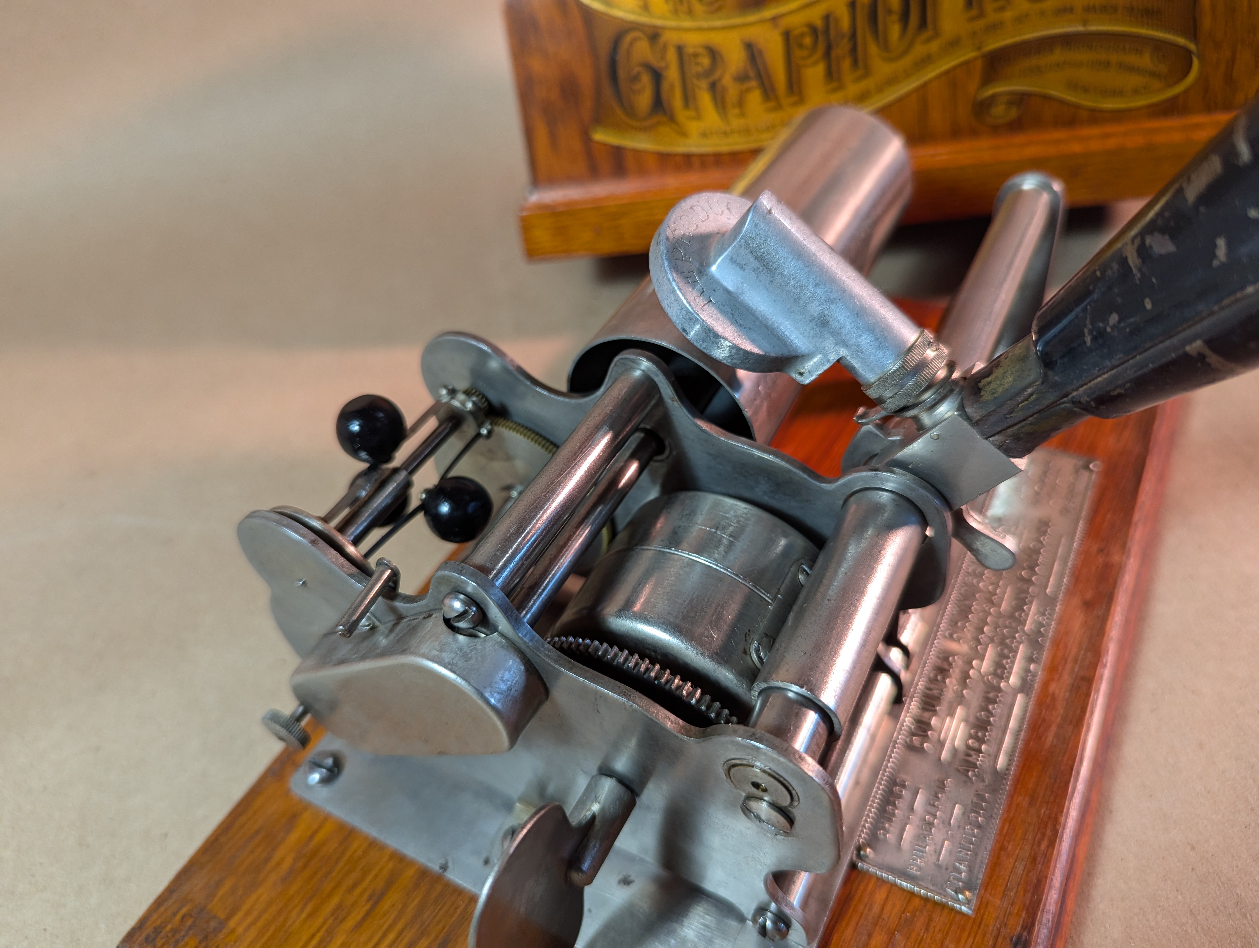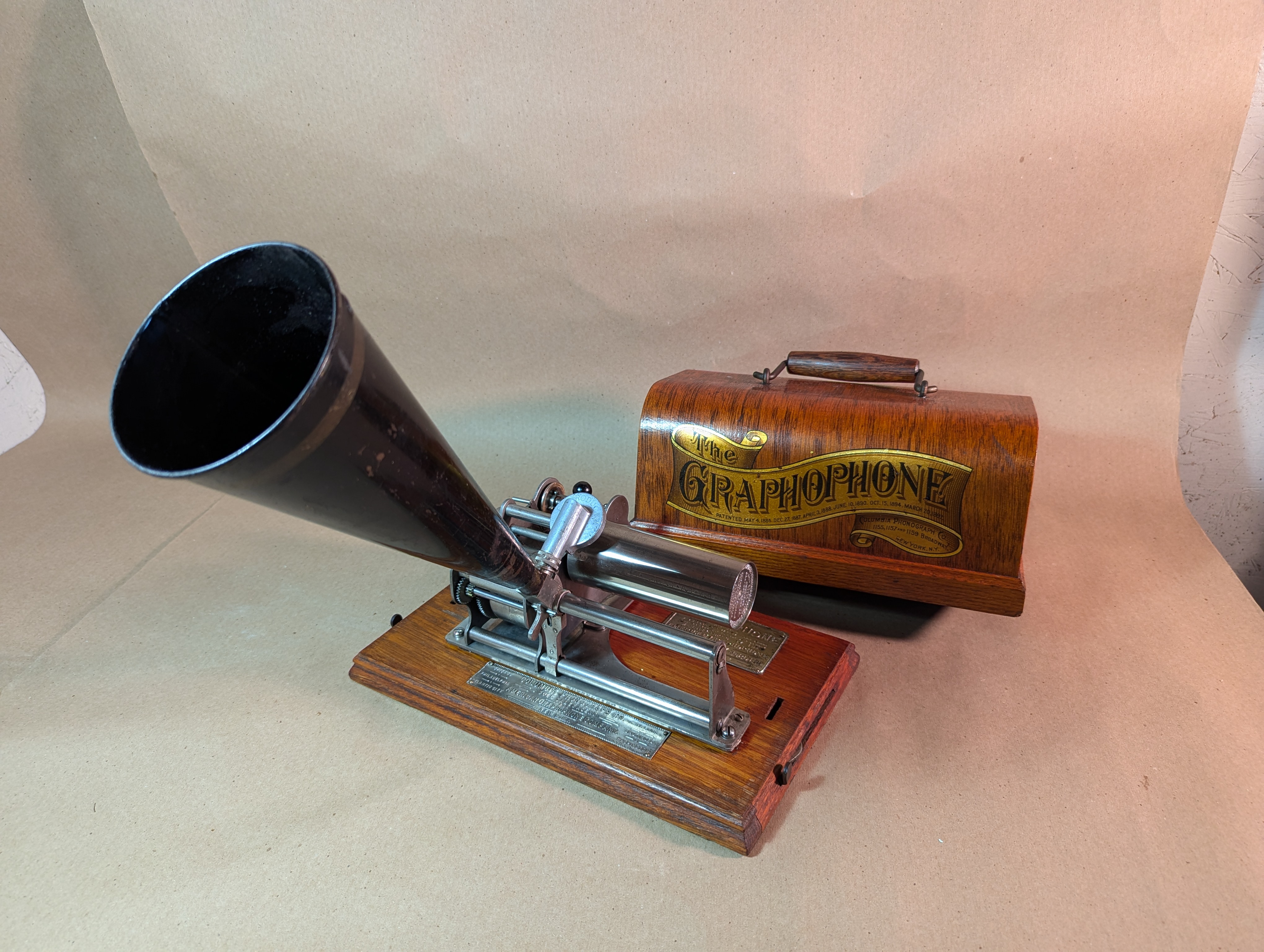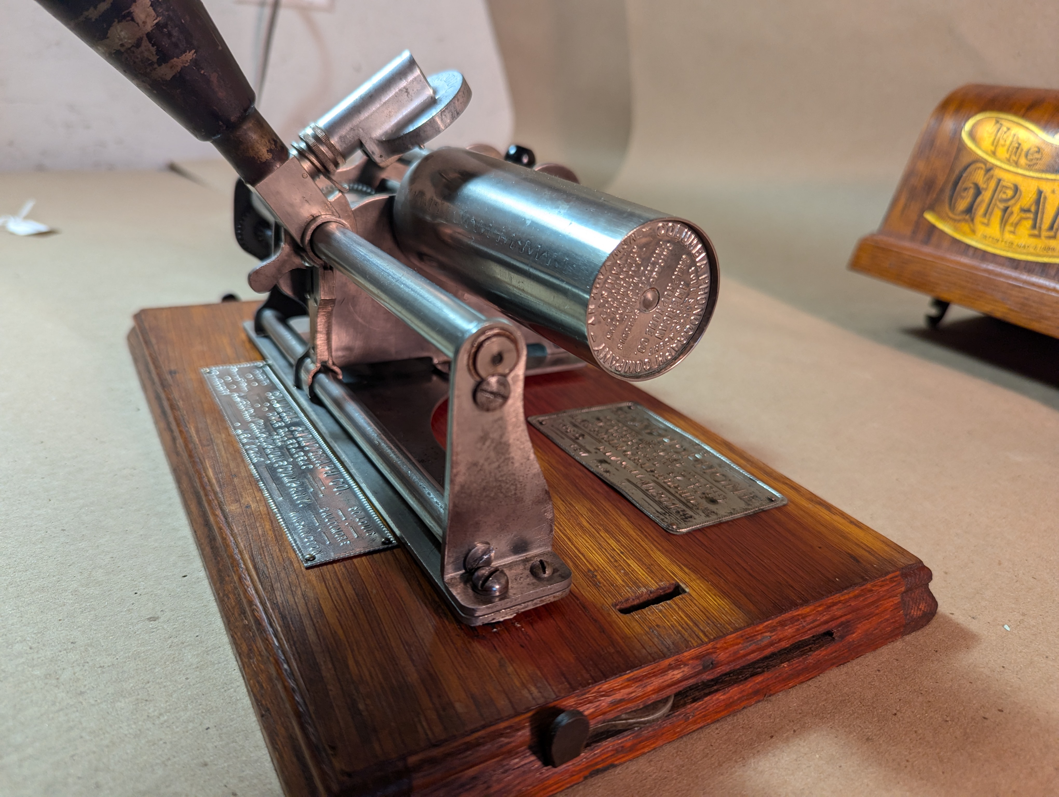 I am offering this Columbia Model B Eagle. It has serial Number 80189 (189th made) which according to our resident expert on these, George, it is the 7th Earliest Serial Number Known. It is an outstanding all original machine with great nickel plating, and original decal. It has been completely cleaned and runs great. The reproducer has been re-built. The original 10 inch cone horn has some paint loss and does have a small hole in it. Take a look at the pictures and let me know if you have any questions. Shipping at actual cost. Free delivery to Stanton’s August auction available. Asking $1100.00.