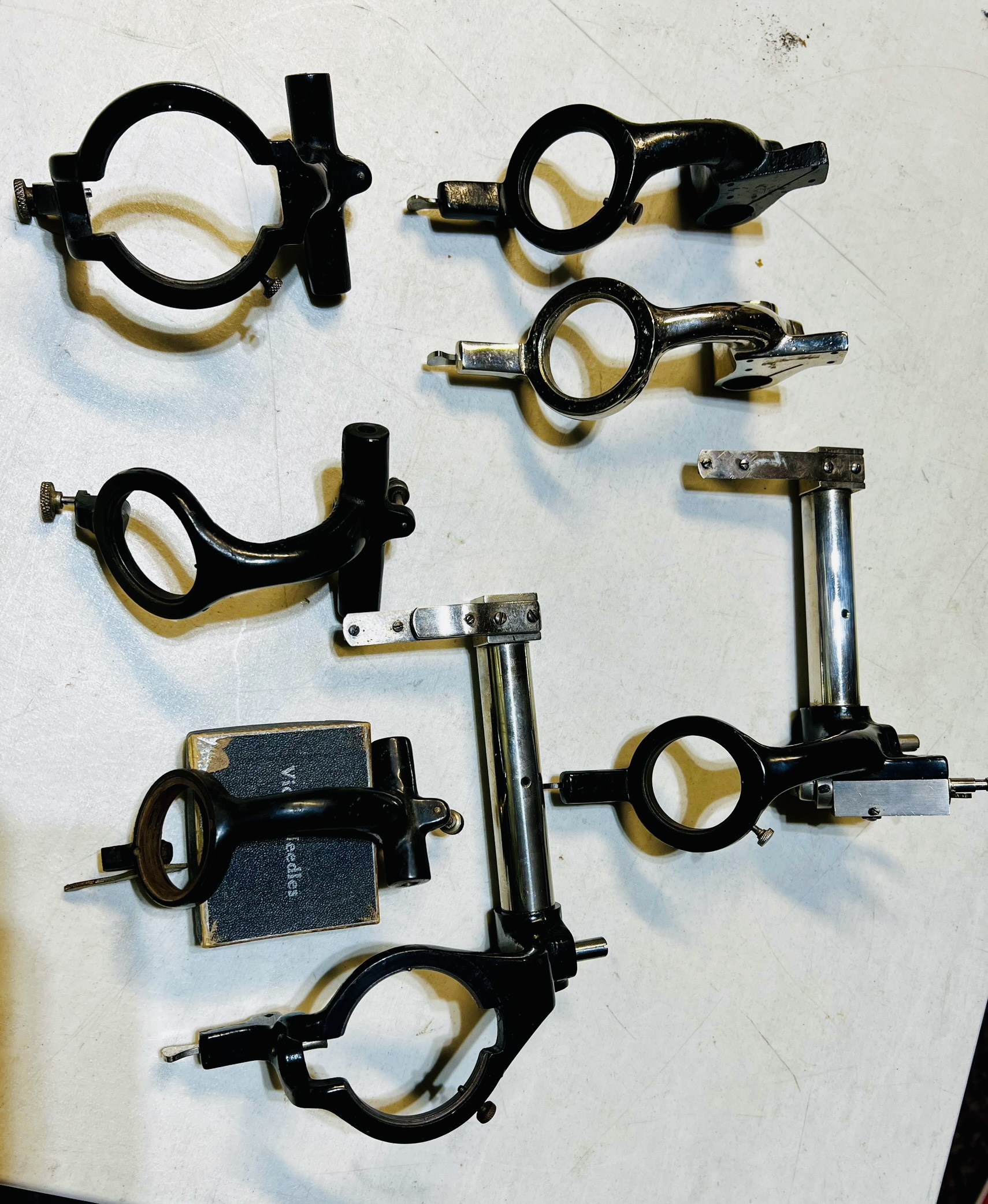 I have for sale several Edison Reproducer Carriages for Triumph, Fireside and Gem. Here’s the details. Upper Left is a large opening horizontal unit for a Fireside, missing the half nut and halfnut bar. $40. Upper Right are (2) carriage only, angled small opening for Triumphs. One is original black finish $20. The second is nickel plated but done sometime in the modern era and not original. It’s hard to see but has several pits in it from a rough casting. Plating is nice but the pits are evident and it’s missing the reproducer locking thumbscrew. SOLD $25 SOLD. Next is another Fireside but with small angled opening. It is pictured below the first one and it’s nice and complete with half nut but missing the reproducer locking thumbscrew. $30. Directly below it is one for an early Gem. The reproducer would be the Automatic style stamped steel that was held in place with 2 thumbscrews at the 12 o’clock and 6 o’clock position. Complete but needs to be cleaned up. $40. Below the Gem is a complete setup for a Triumph with the large horizontal opening SOLD $150 SOLD. Lastly on lower right is a complete small opening angled unit that includes the shaver for a Triumph $150