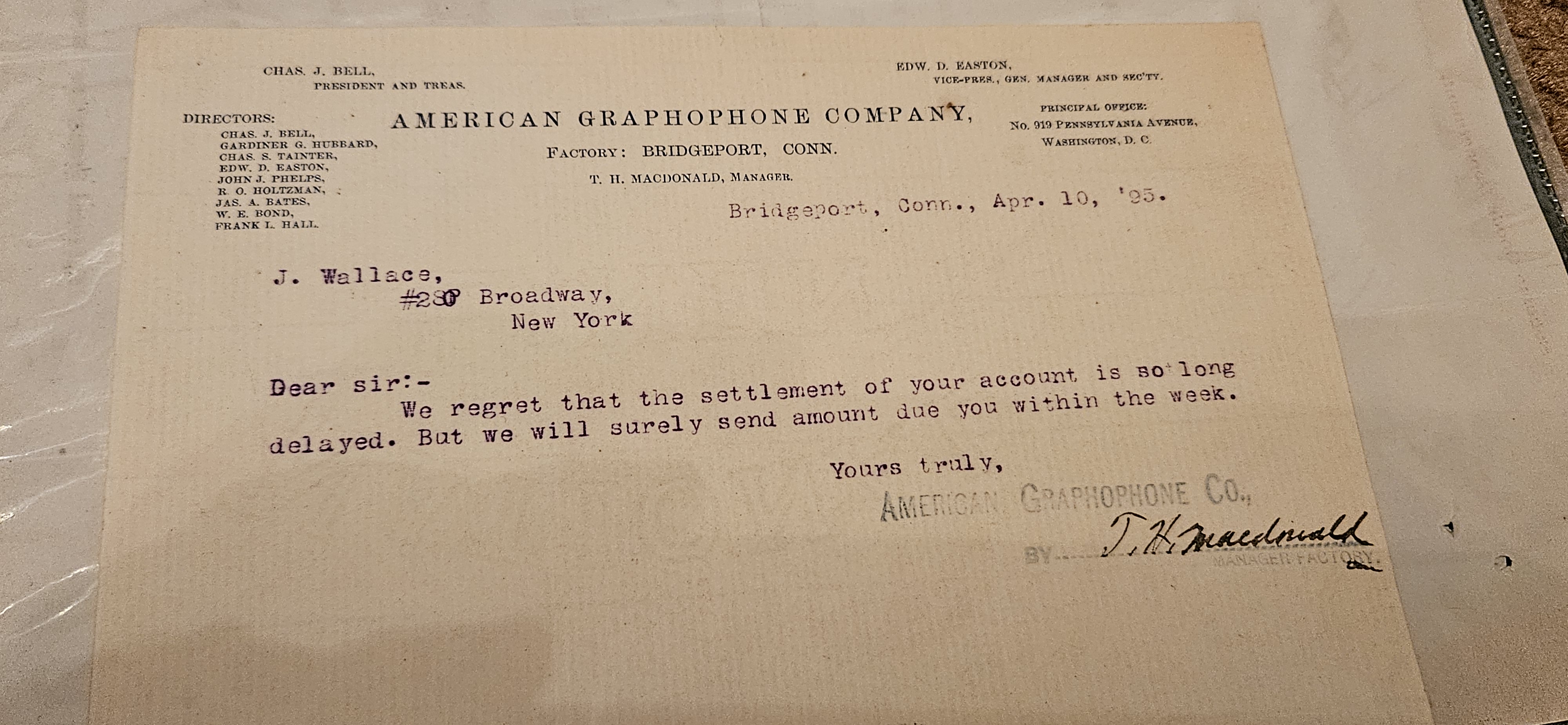 Several years ago I found this early 1895 American Graphophone letter possibly signed by Macdonald, who at this time was the Manager of the American Graphophone Co. and Edward Easton was VP. I believe this was before Columbia became the marketing arm of the American Graphophone Co.
