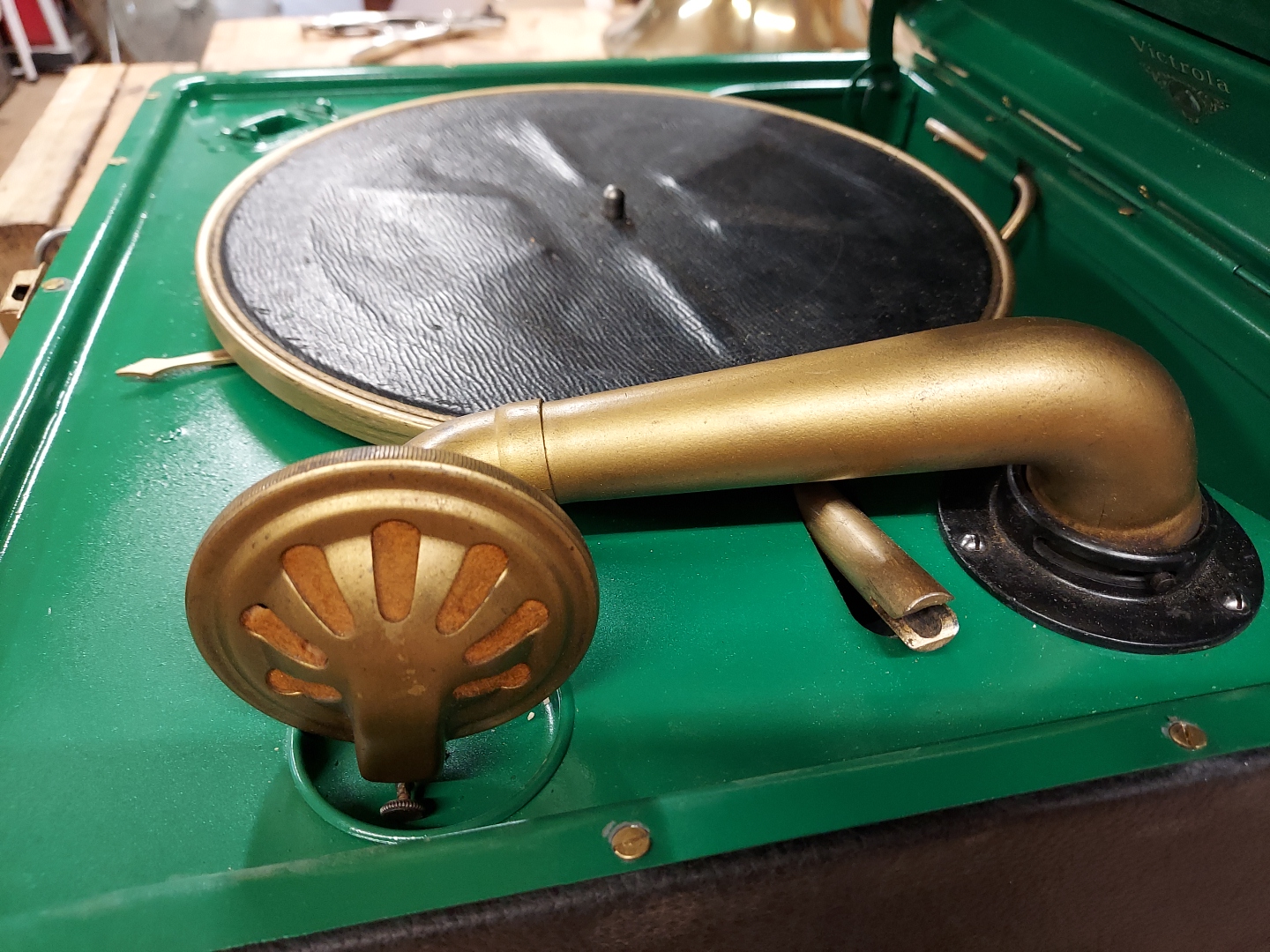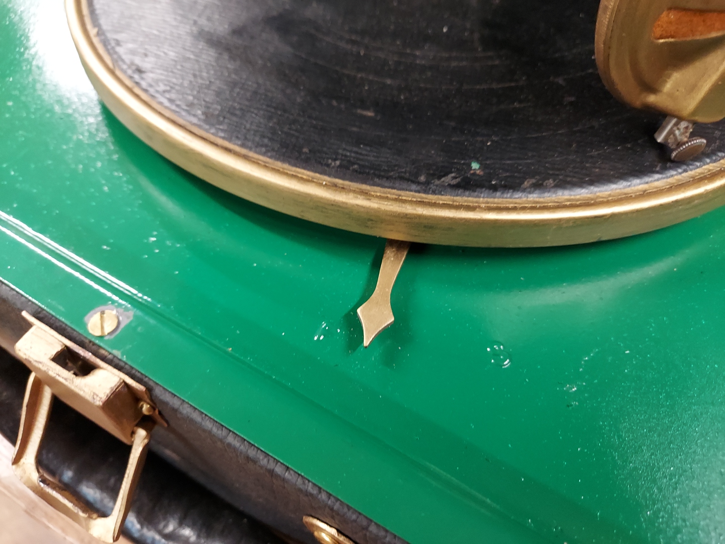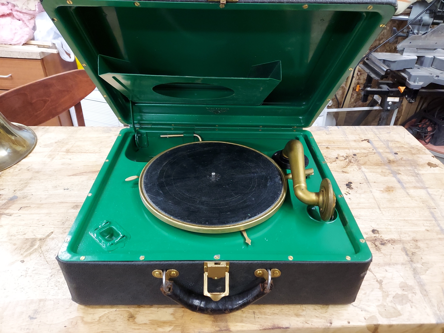 The second one was the HMV 16 which came with an early HMV 102 portable I acquired about 30 years ago. That one had a torn diaphragm. I successfully pried it apart, using a tiny sharpened screwdriver to peel back the edge of the overlapping sheet metal and impaling my hand in the process. I installed a replacement diaphragm, and reassembled it, using glue to hold everything together. It sounded and looked like ¢rap, so I replaced it with an HMV 5a.